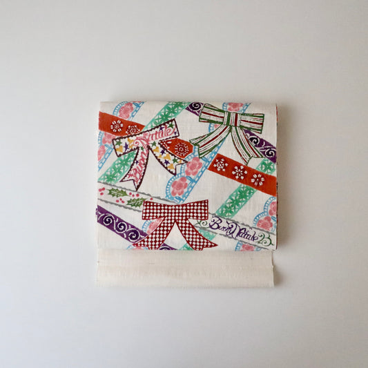 九寸名古屋帯「型絵染 - リボン」荒川眞理子