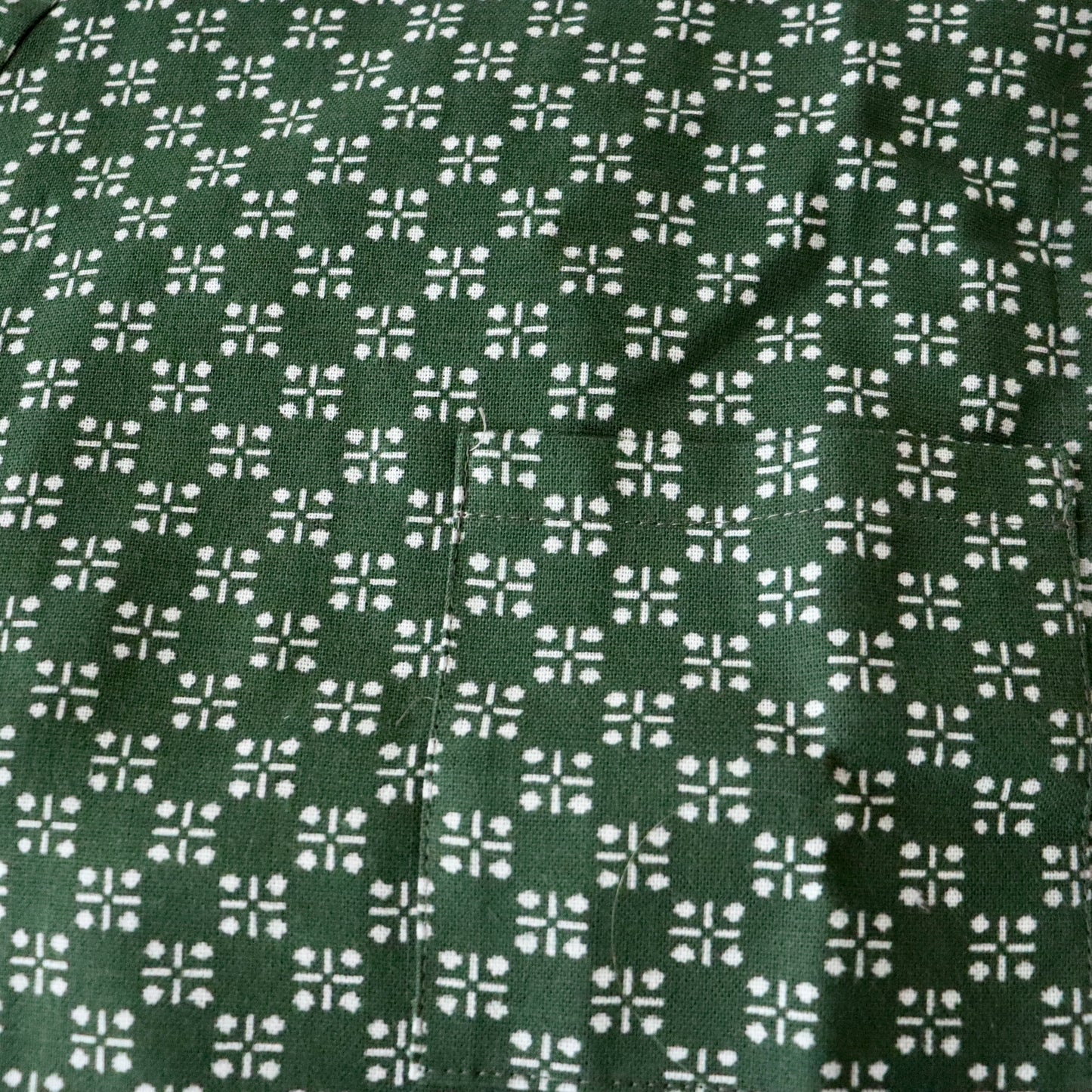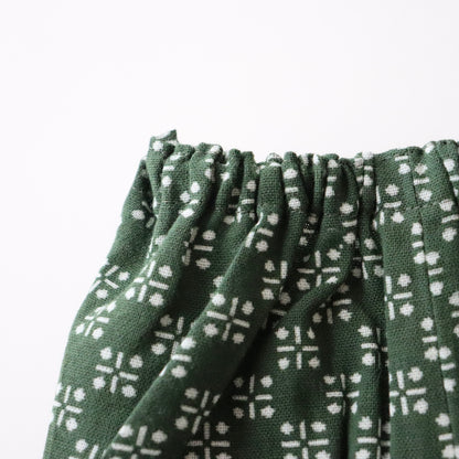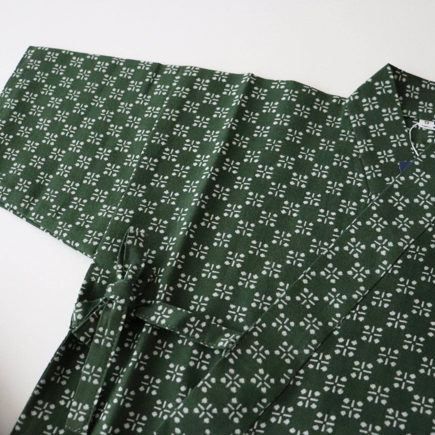 生地は竺仙の手拭いでも使用している「稀」。糸番手が太く織も荒めの昔ながらの綿素材です。染は「注染」。職人の手によって丁寧に染め上げた小紋柄は趣があり、どこか懐かしさを感じる可愛らしい仕上がり。竺仙らしさが表れた本格的な仕様のお子様甚平です。パンツのウェストはゴム仕様で脱ぎ履きも楽ちんです。
