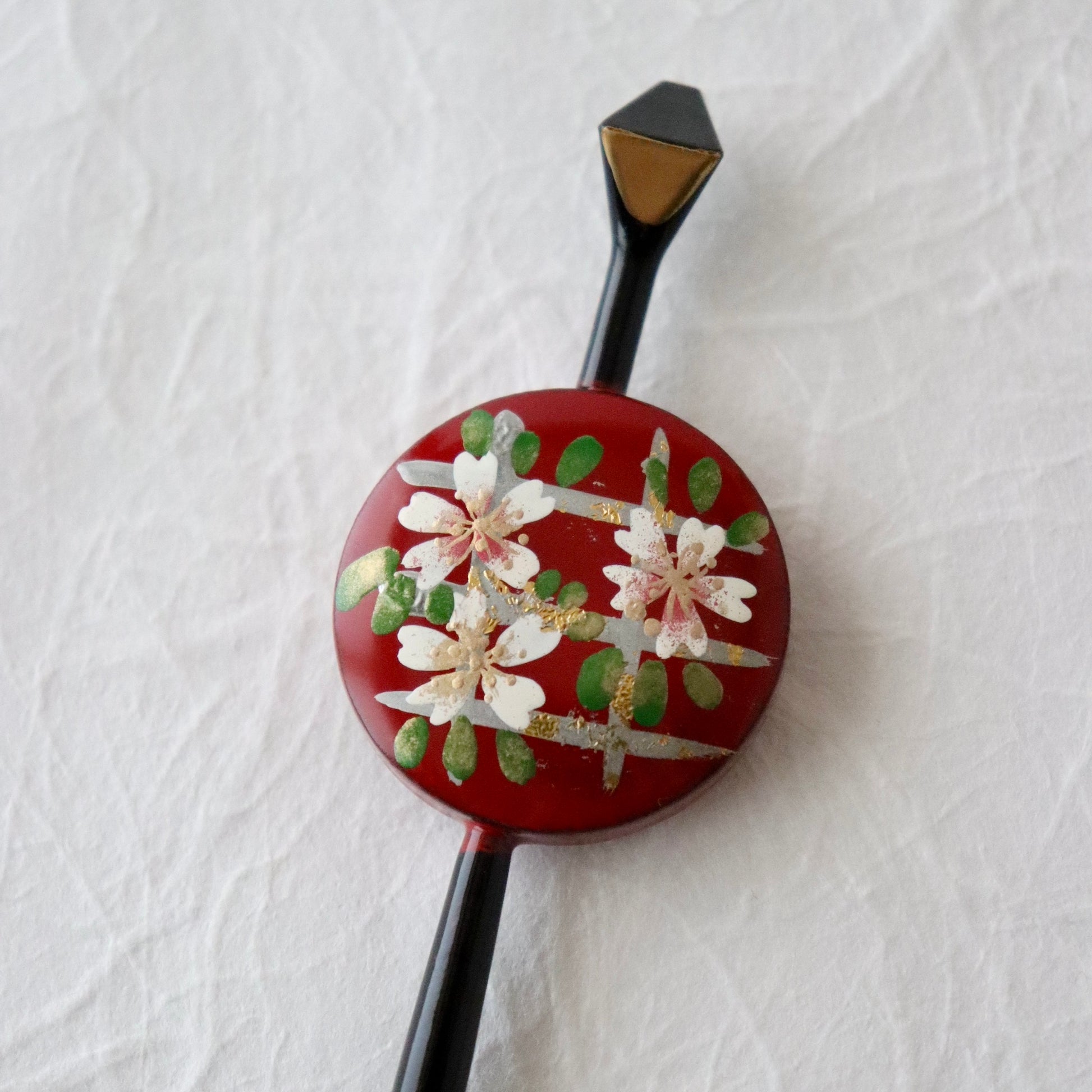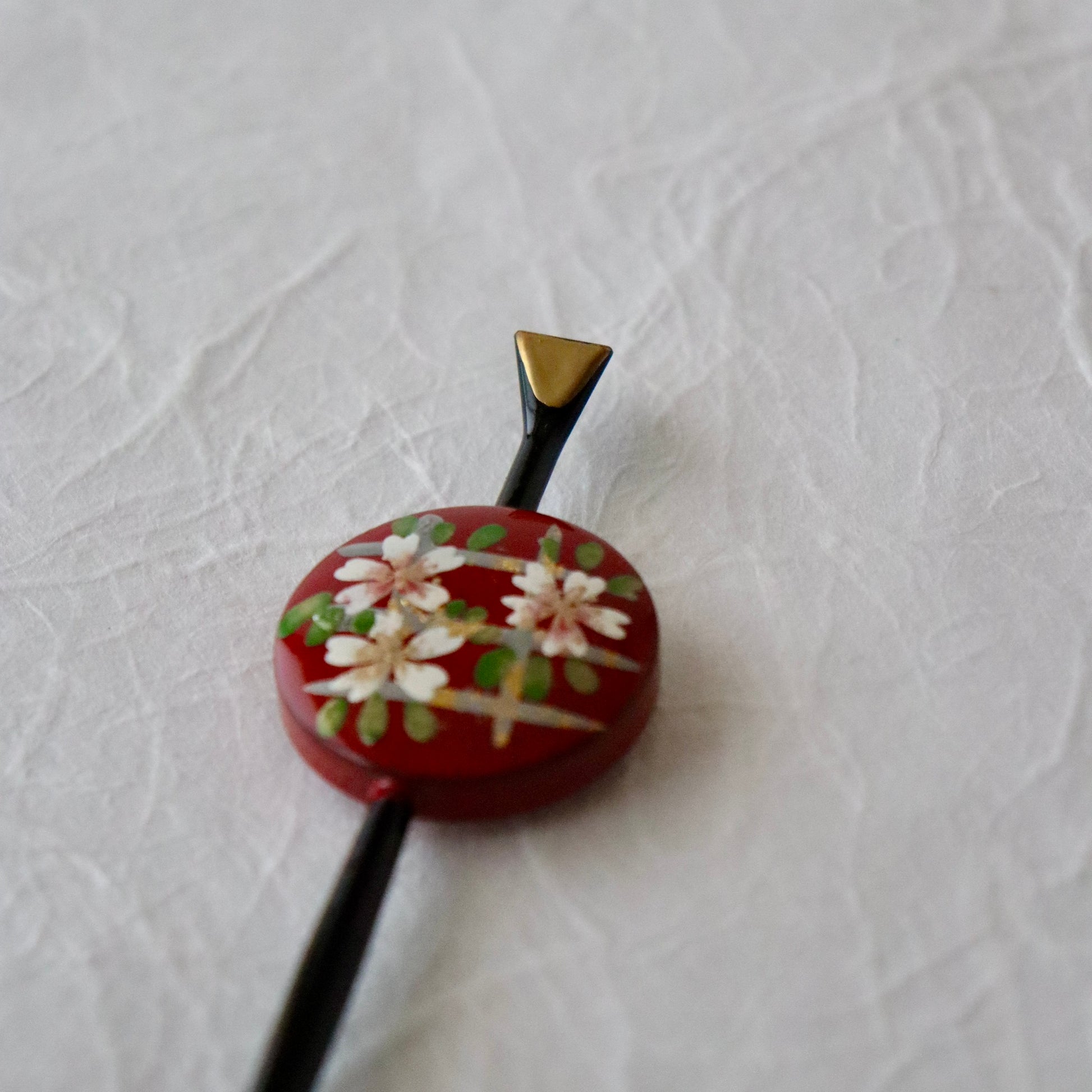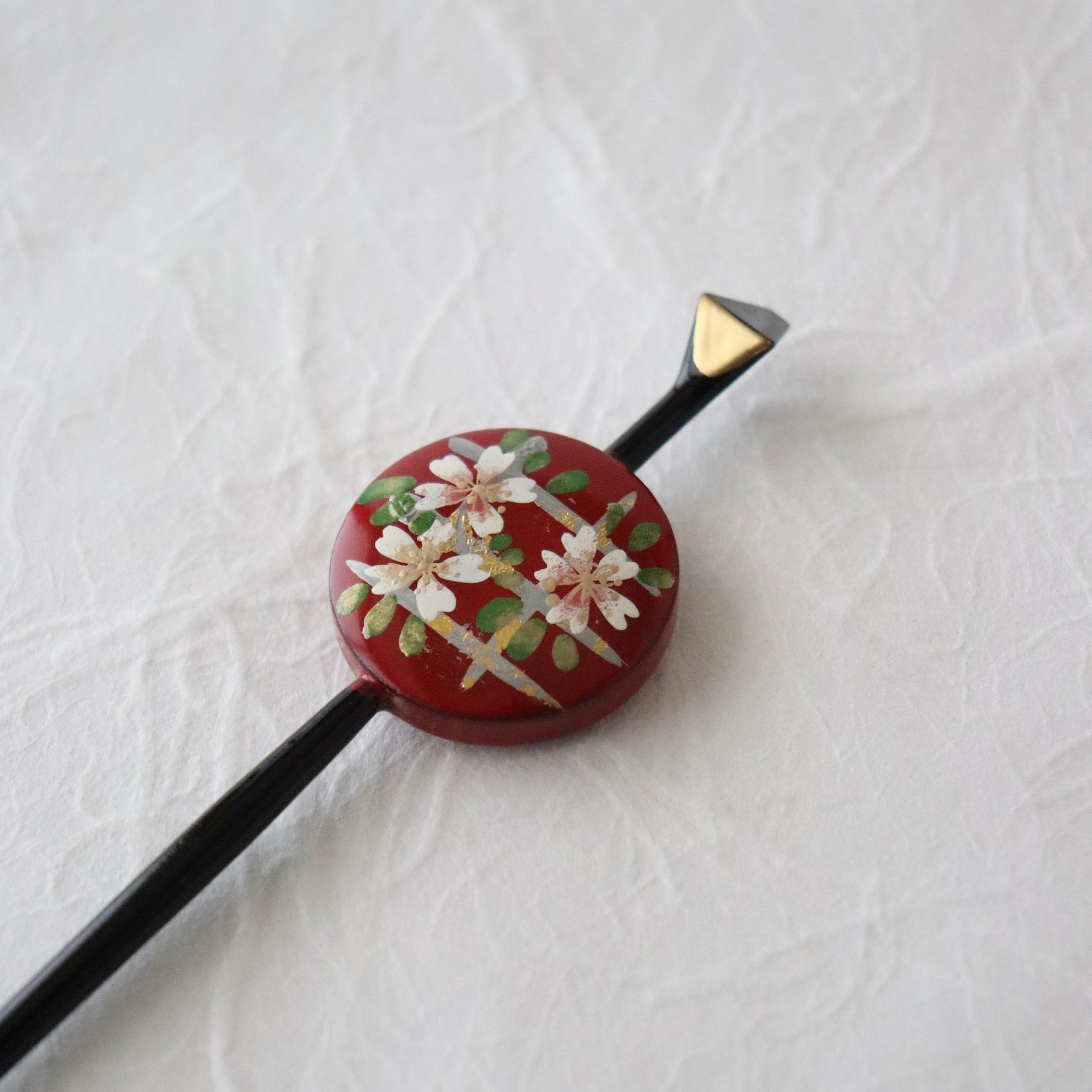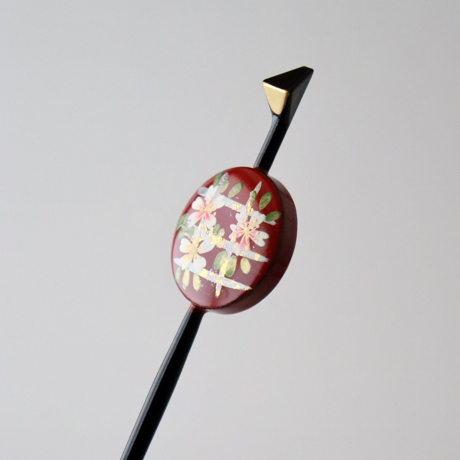 趣のある佇まいの平打ち簪。格子に桜を重ね描いた本作。蒔絵の描写もとても上品です。