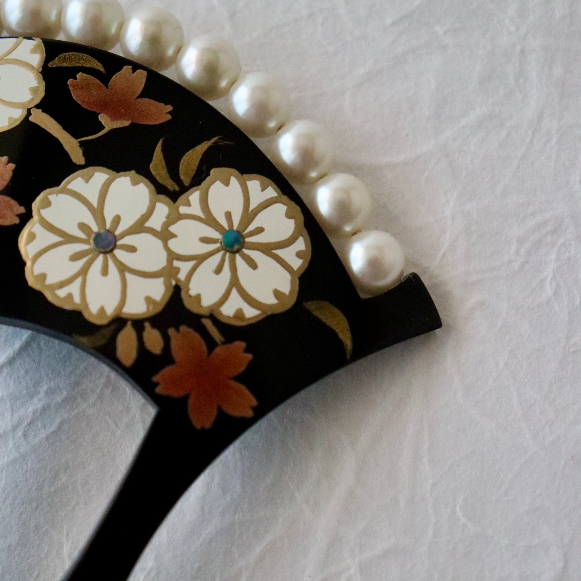 蒔絵で桜を描き真珠を模した珠飾りで装飾したバチ型かんざし。