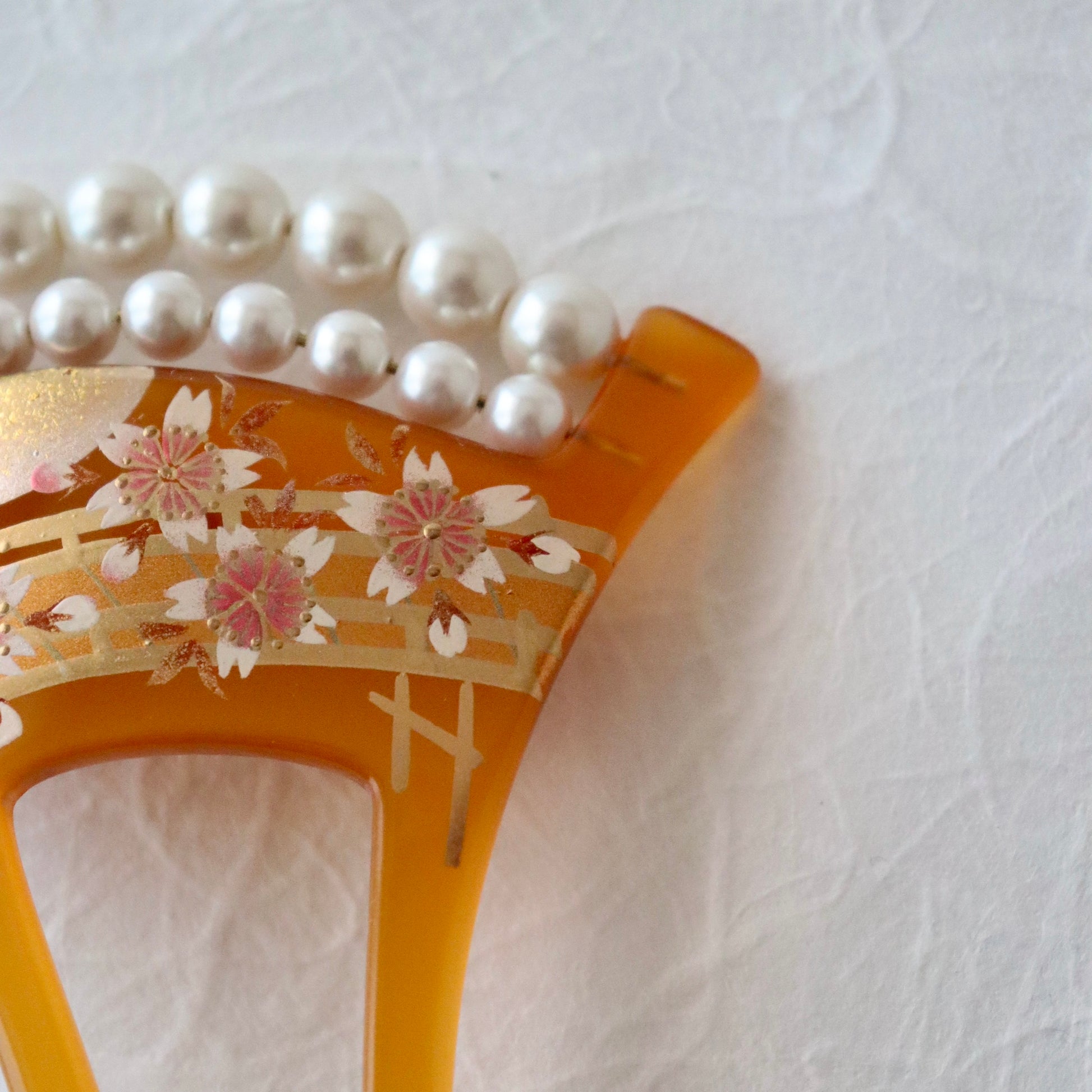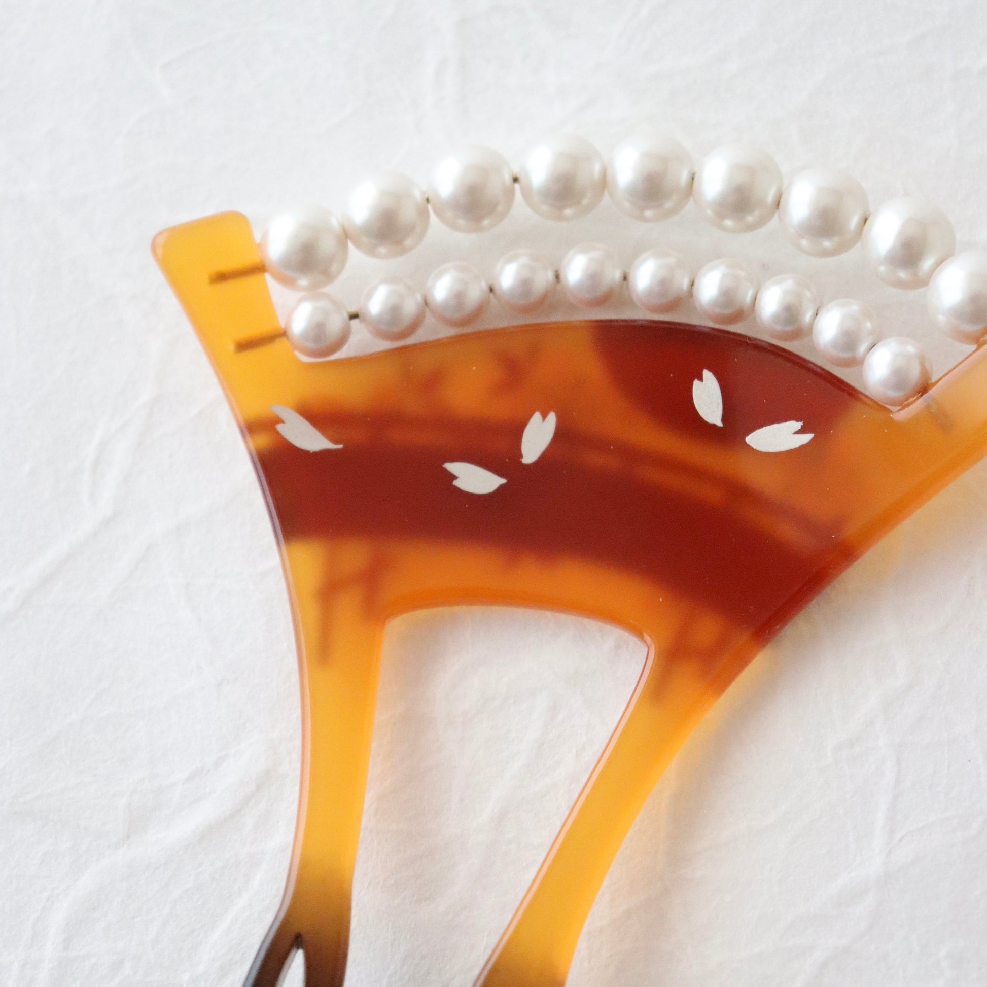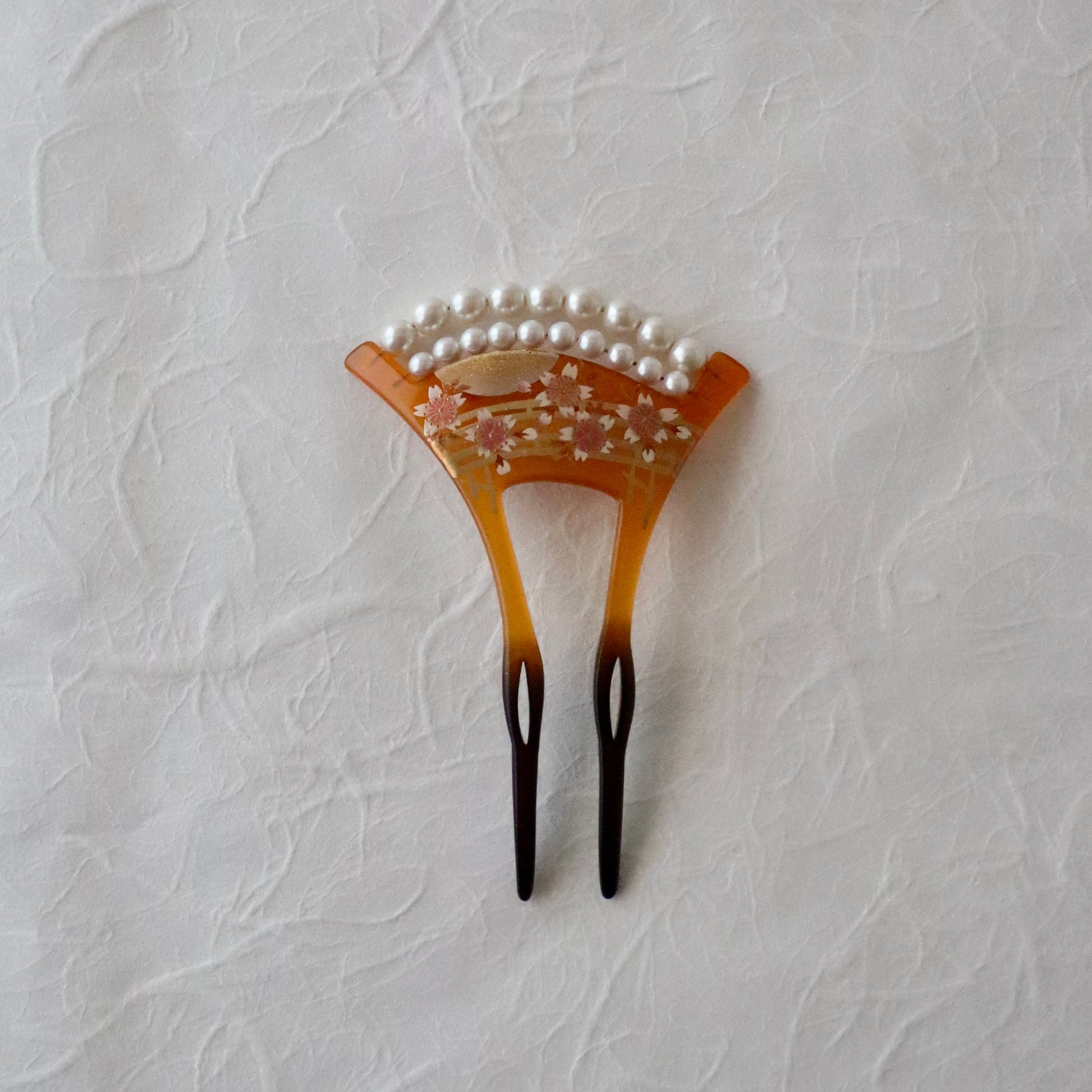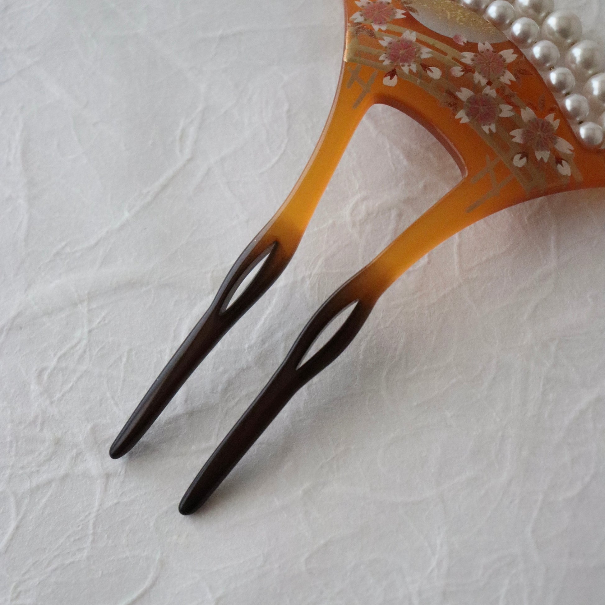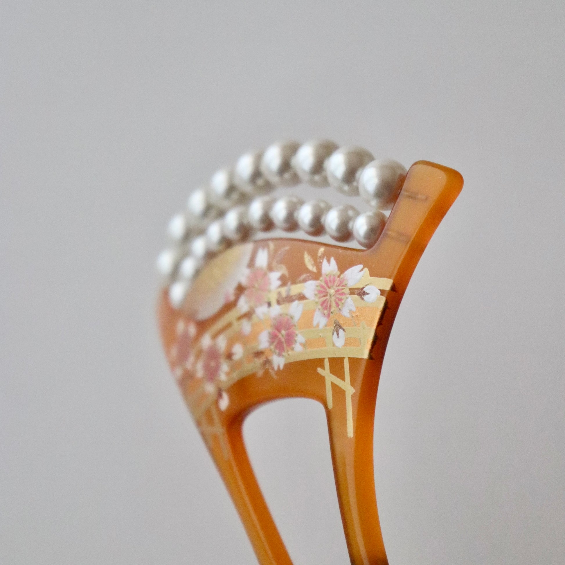 蒔絵で満開の桜と橋を重ね描き、真珠を模した珠飾りで装飾したバチ型かんざし。