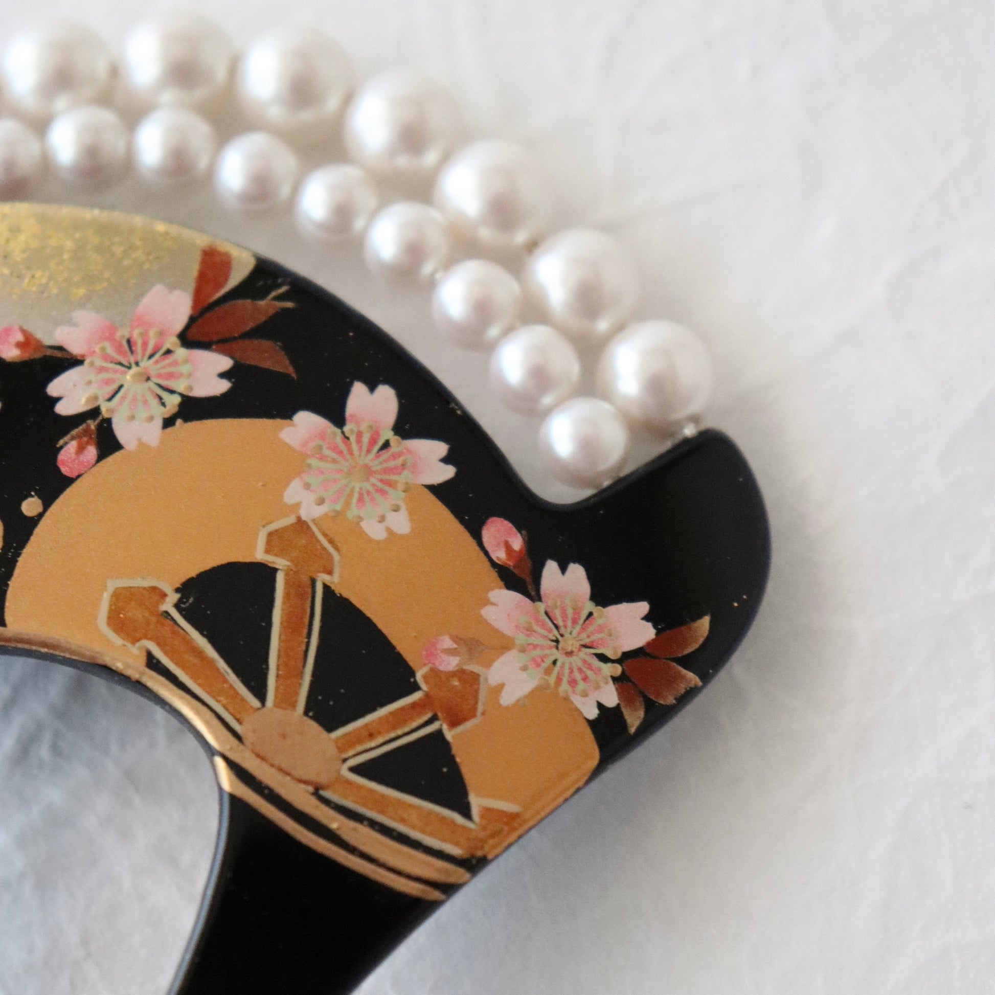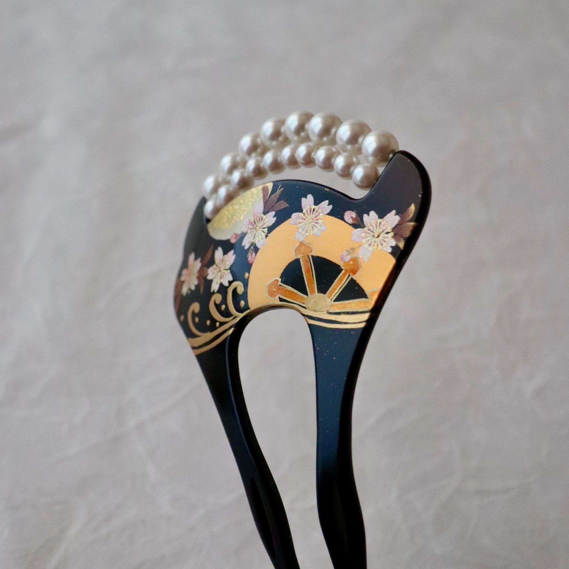 蒔絵で満開の桜と片輪文を重ね描き、真珠を模した珠飾りで装飾したかんざし。