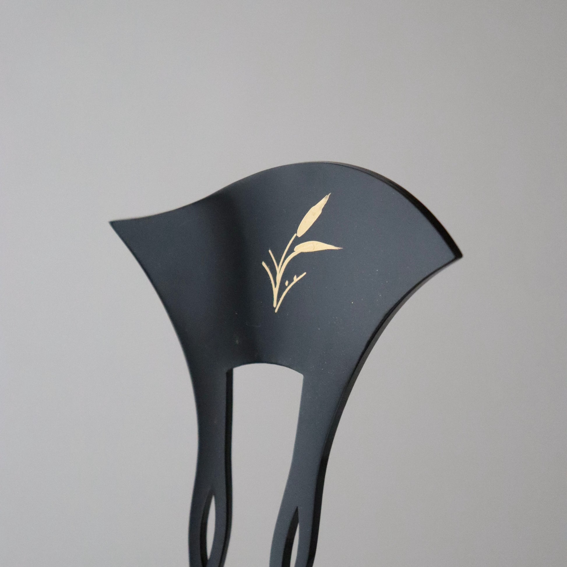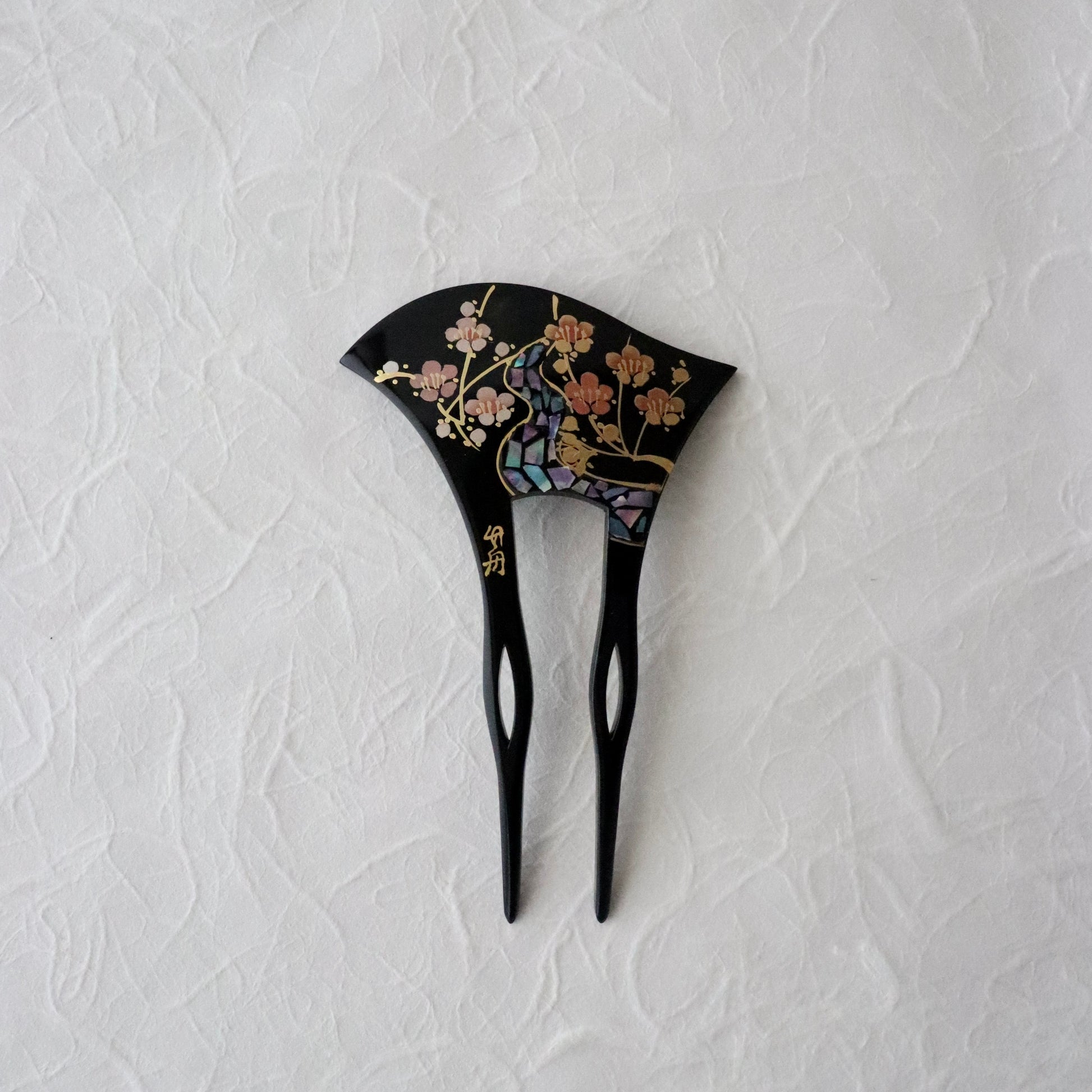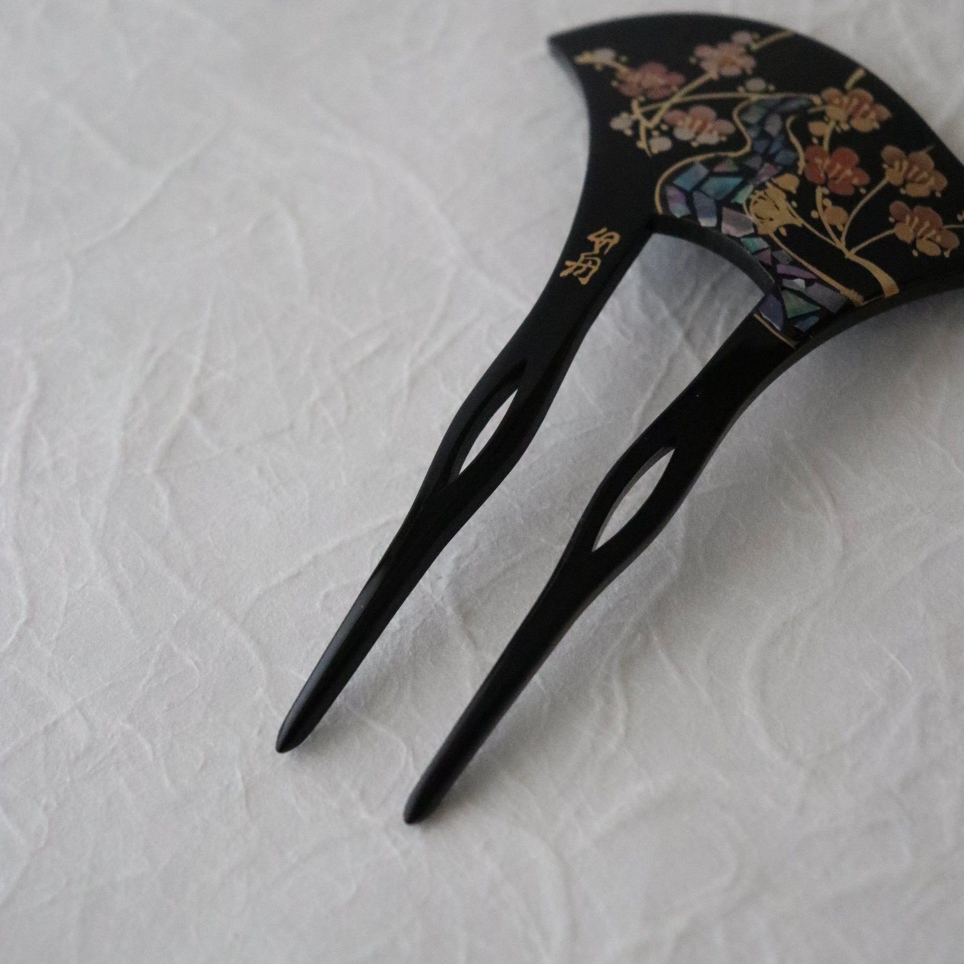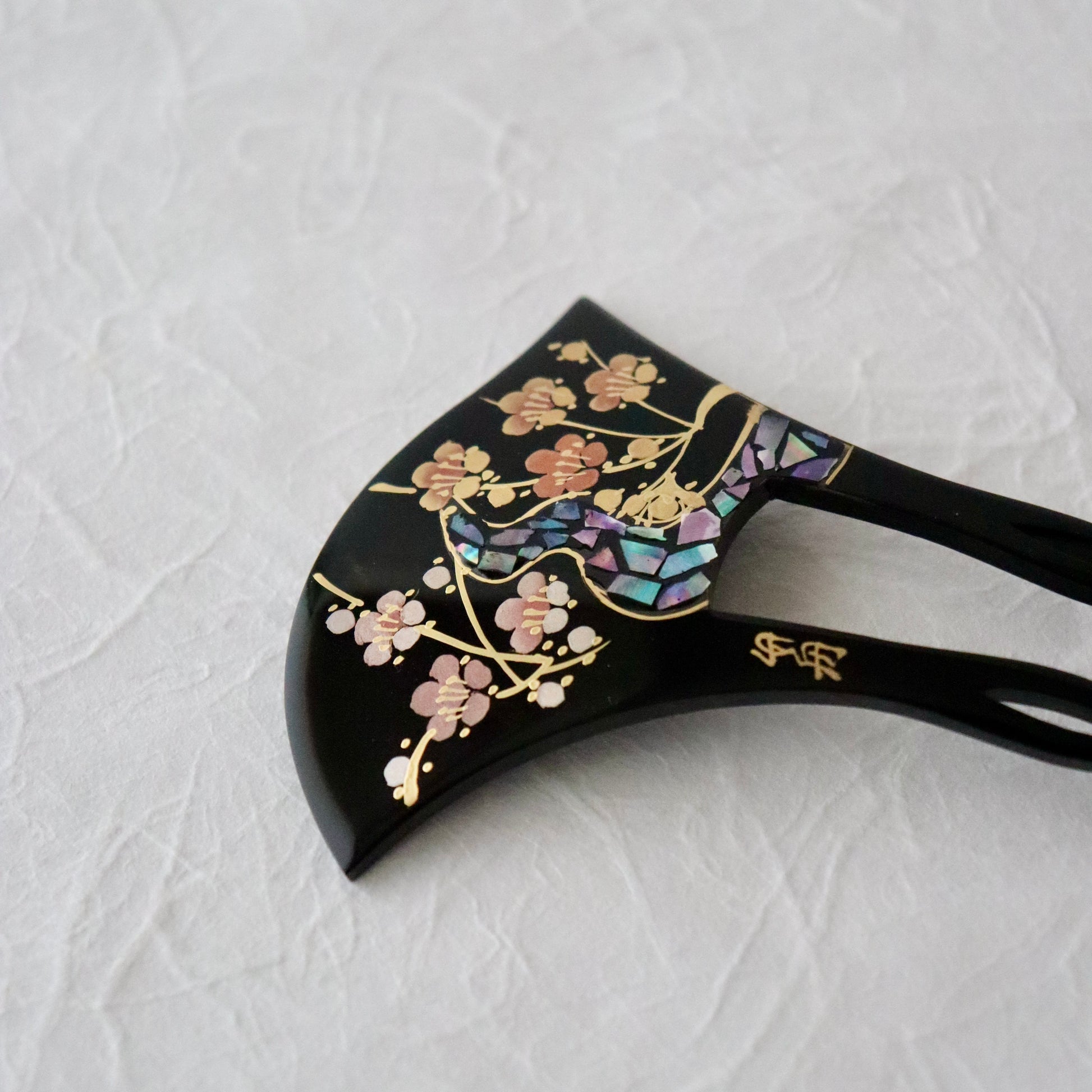 蒔絵と螺鈿で梅と流水を描いた上品かつ洗練された意匠のバチ型かんざし。