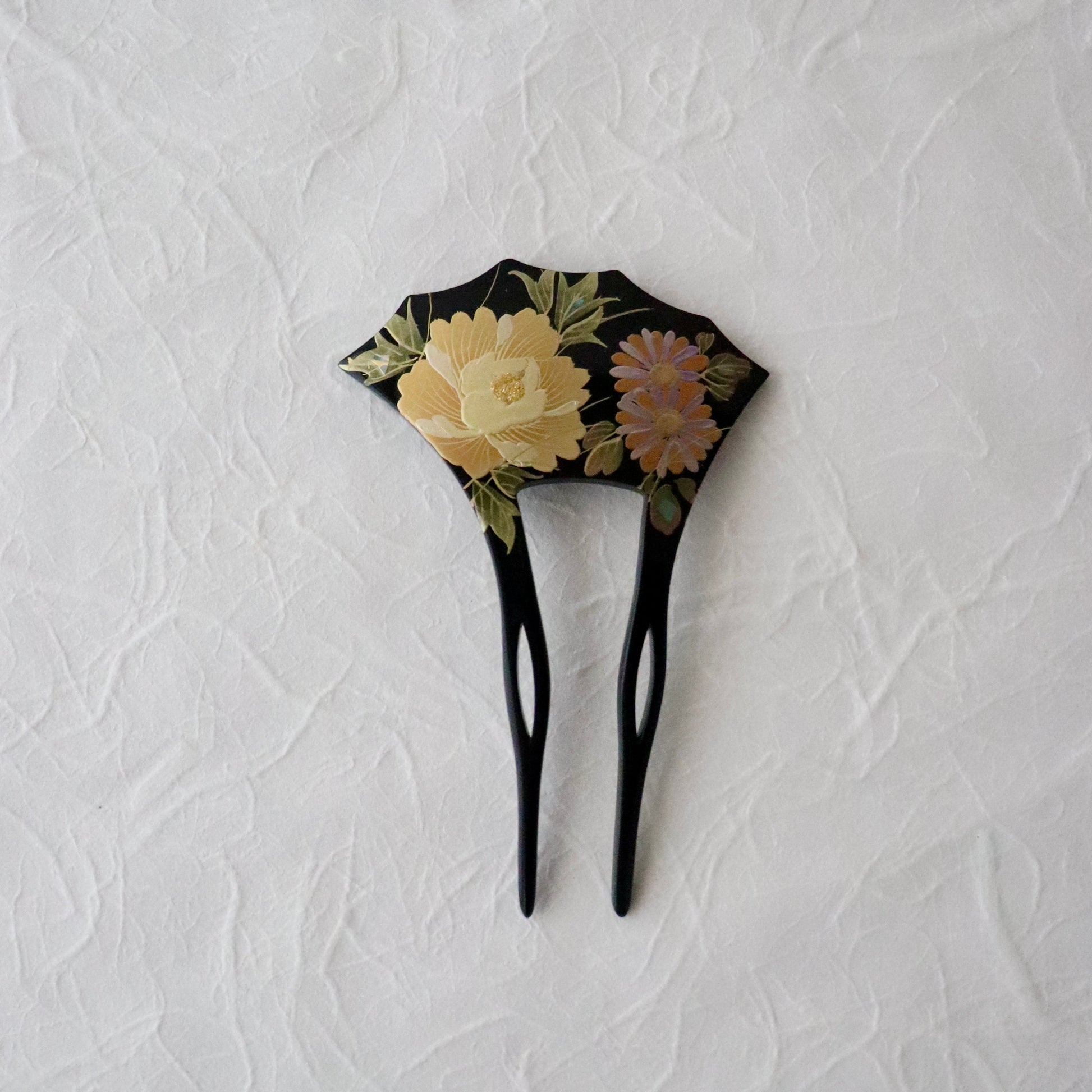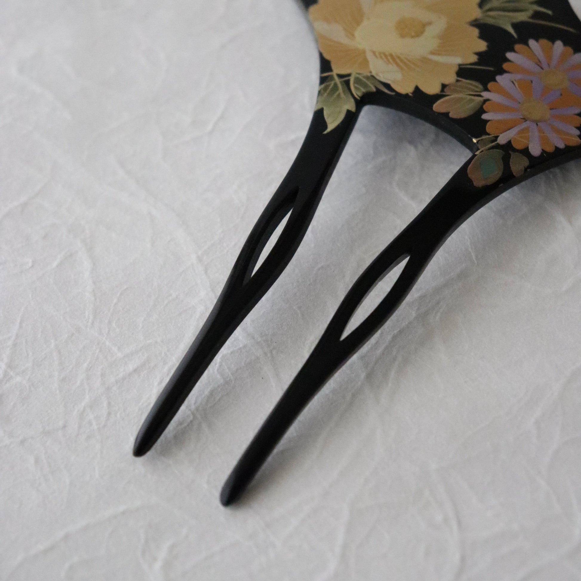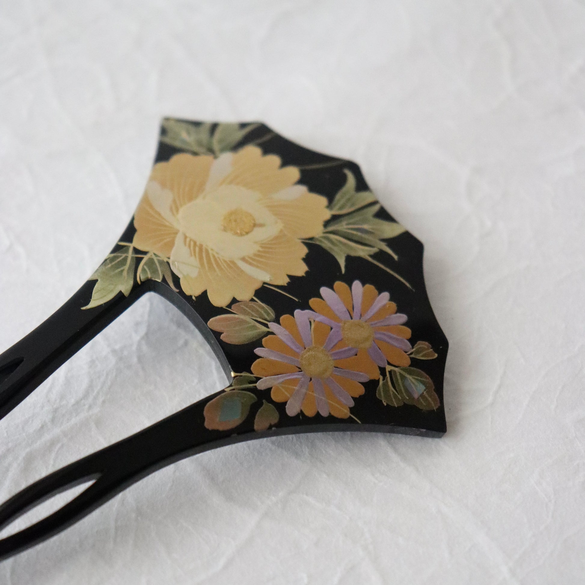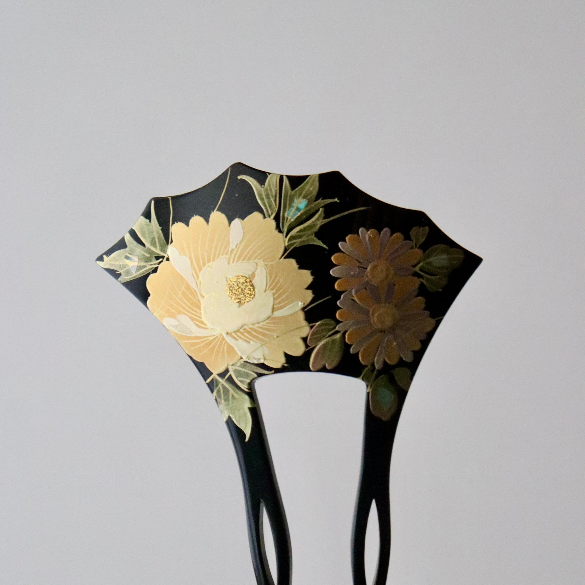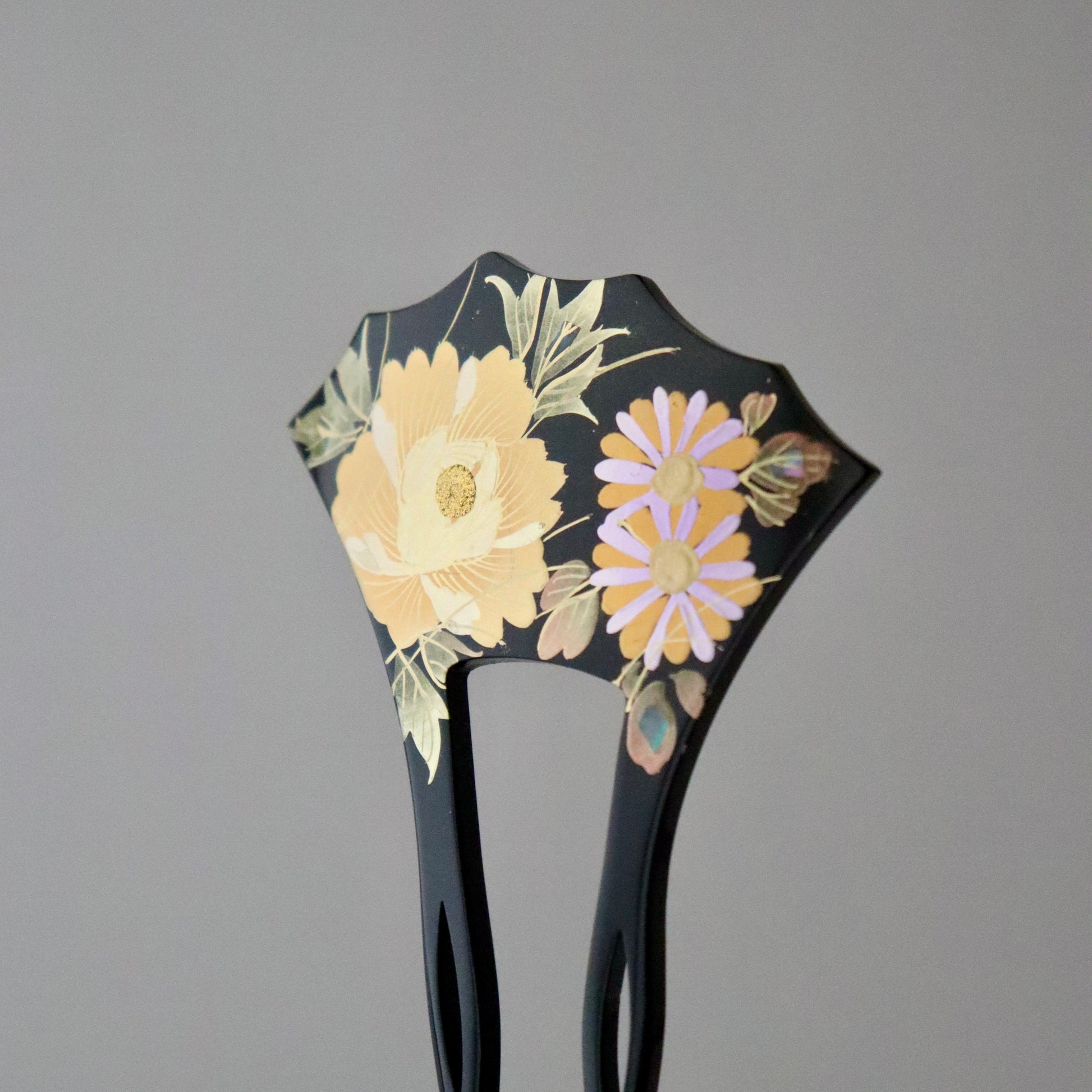 蒔絵と螺鈿で牡丹と菊を描いた上品かつ華やかなバチ型かんざし。