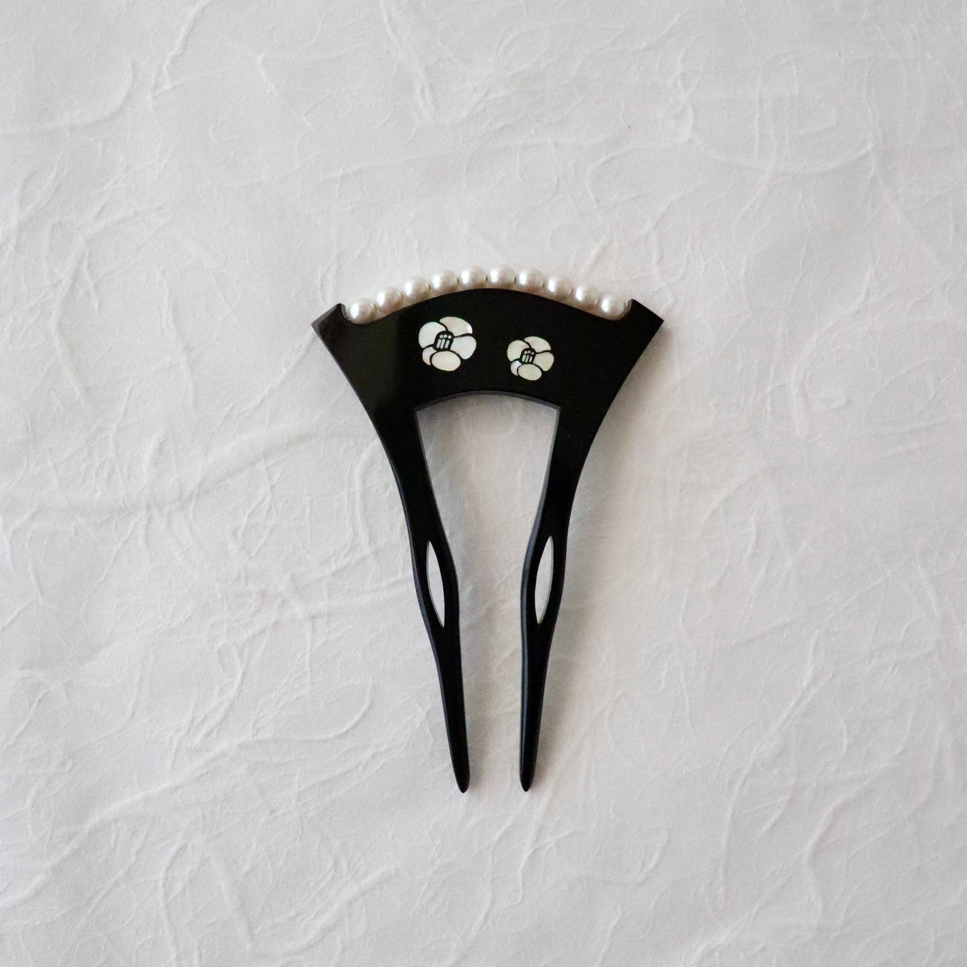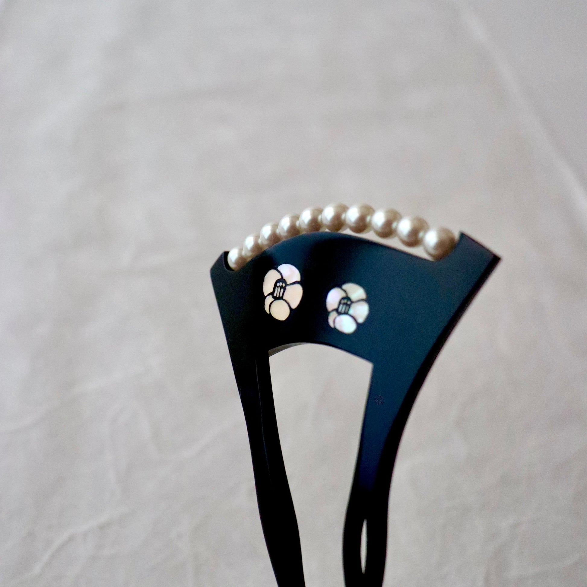 螺鈿細工で表現された椿が上品かつ洒落た仕上がり。真珠を模した珠飾りも程よい華やかさを演出するとても素敵な 簪です。
