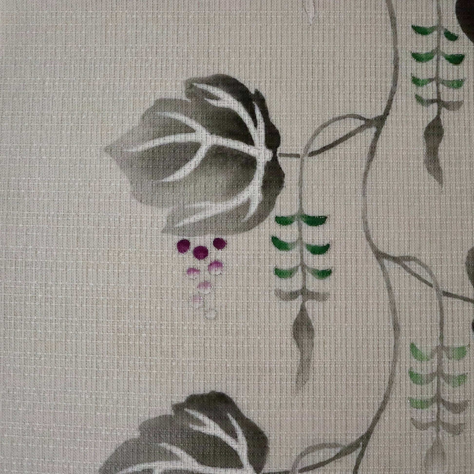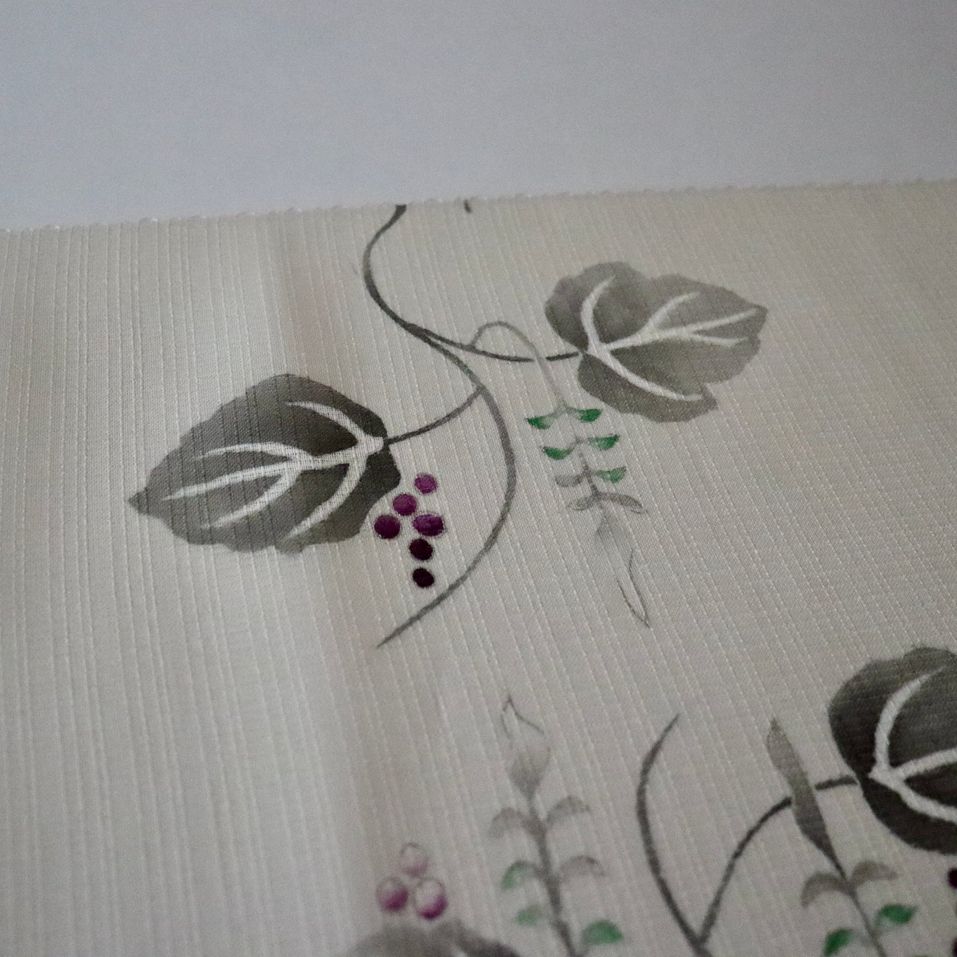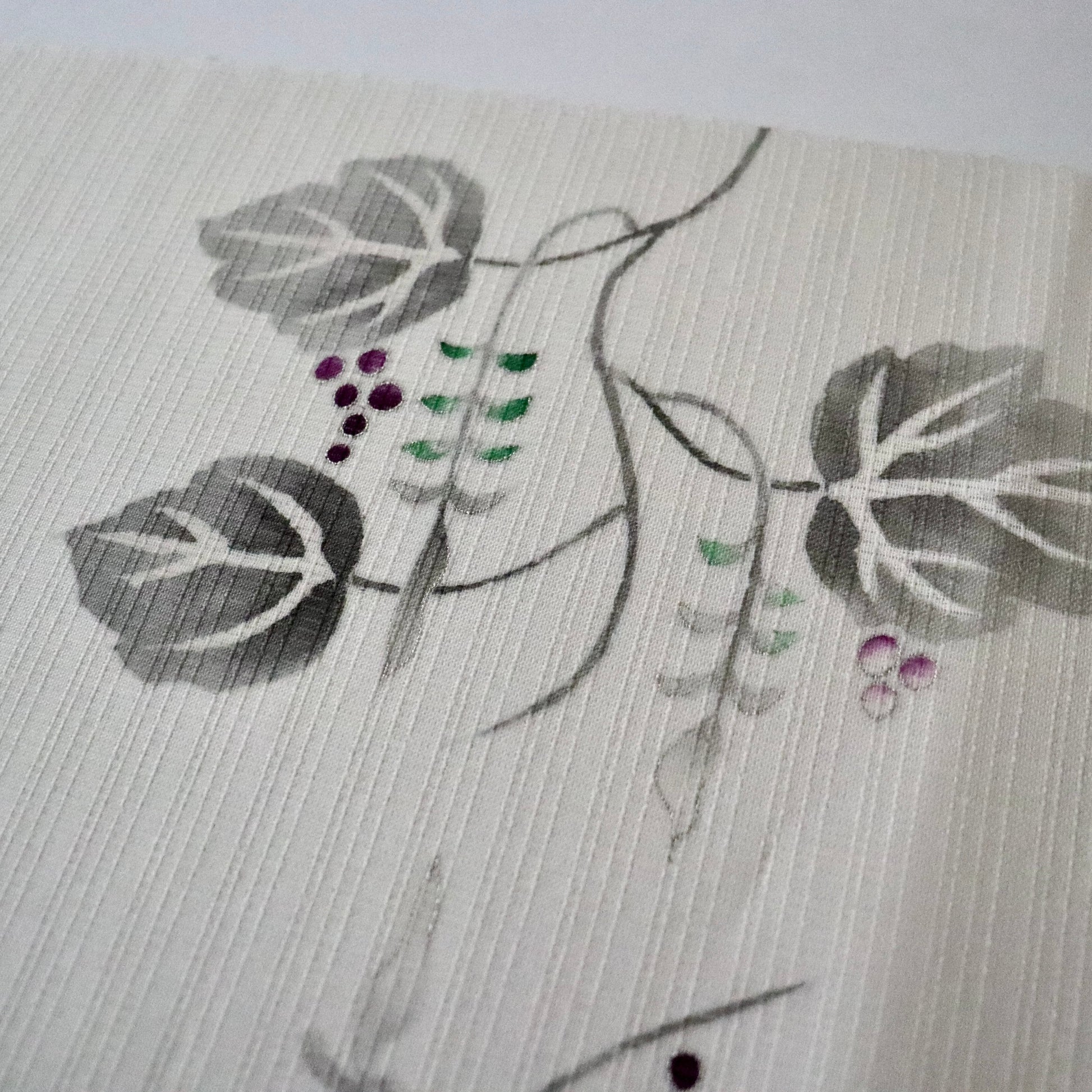 透け感が際立つ変わり紗織地に手描き友禅で葡萄を染め描いた本作。涼感溢れる色彩と柄描写が実に見事な仕上がり。丁寧な手描き友禅を手掛ける「フジモト」ならではの洗練された感性が光る一品です。