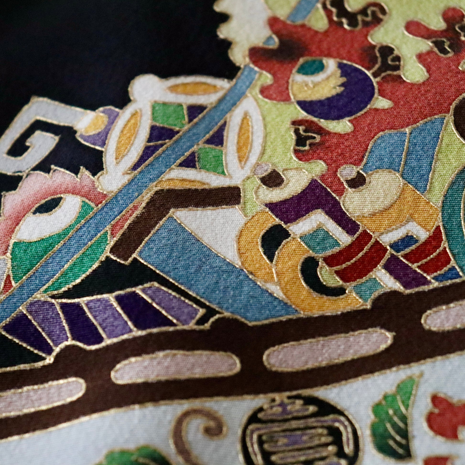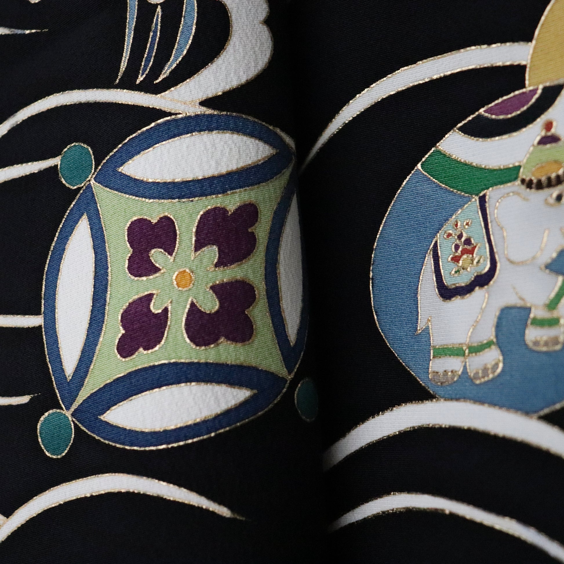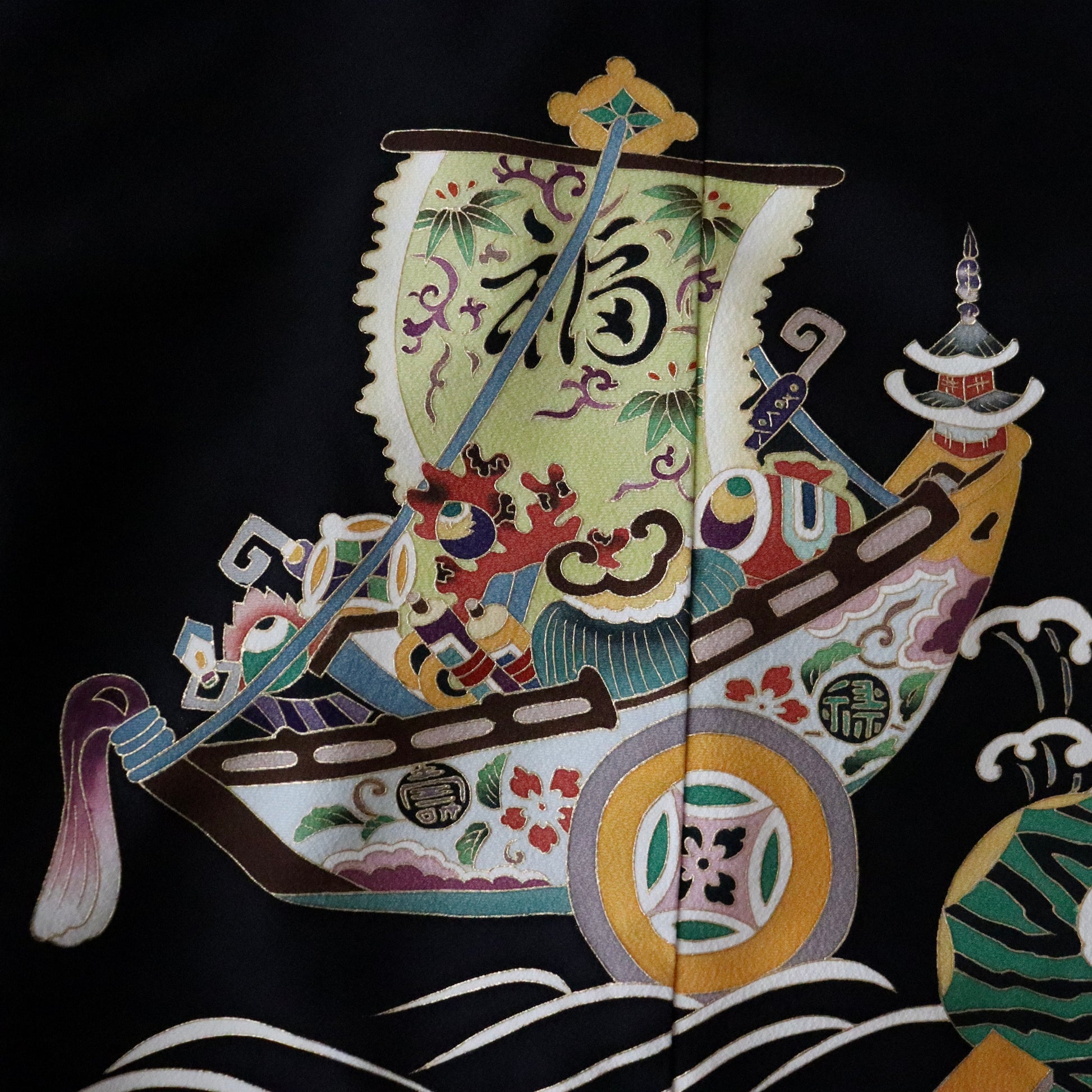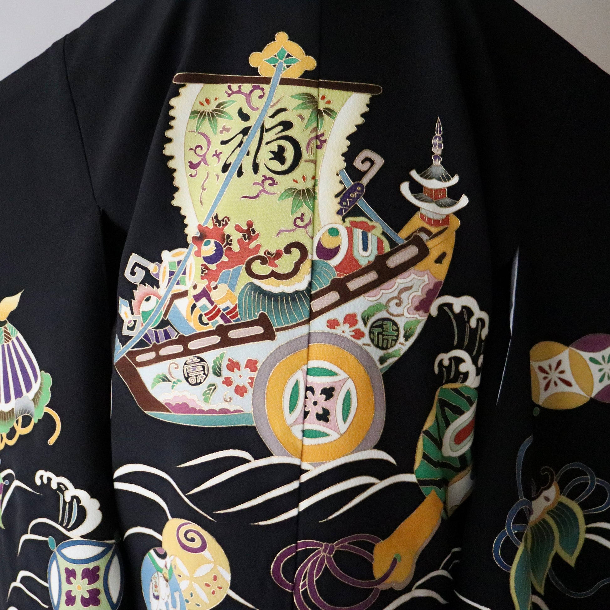 生地表情豊かな最上質の縮緬地に手描き友禅で宝船が美しく描いた本作は京友禅で名を馳せる『岡重』謹製。