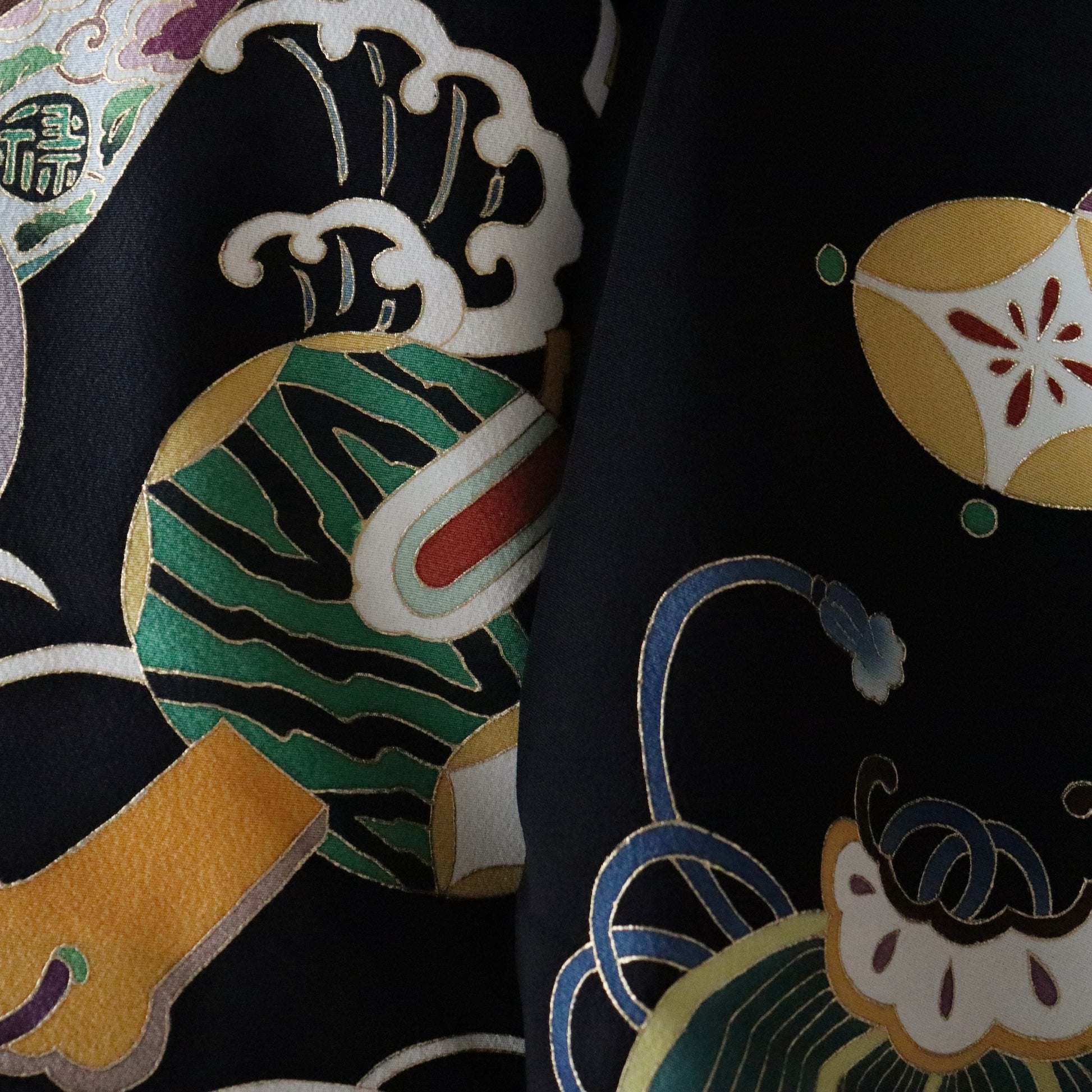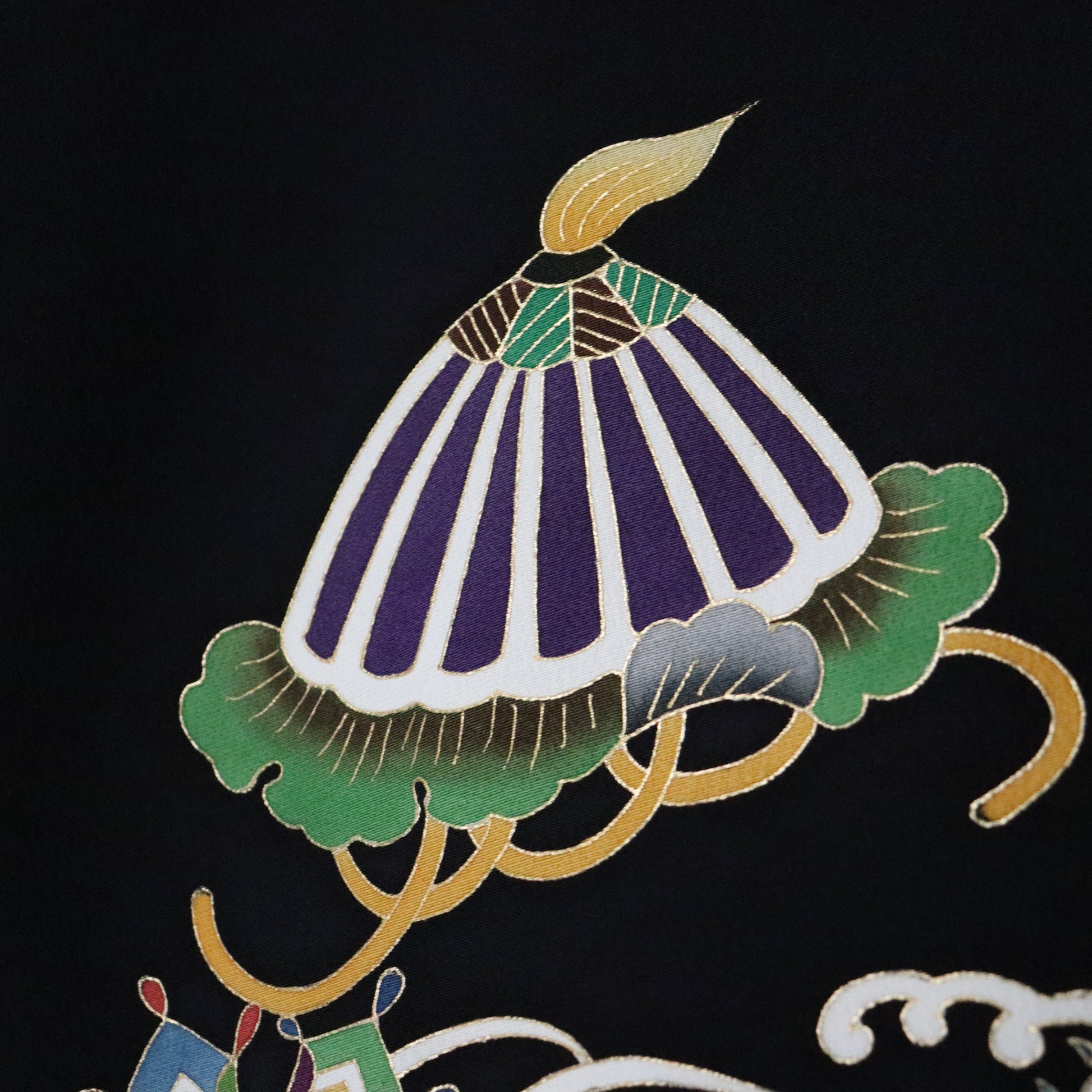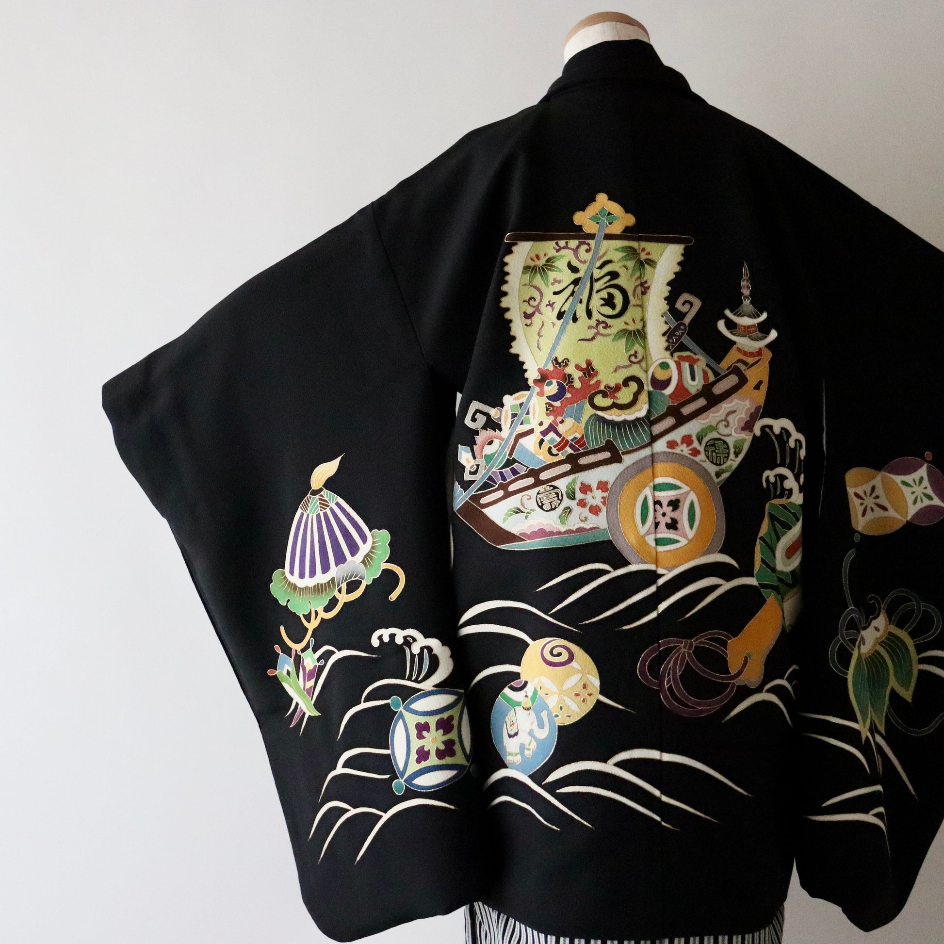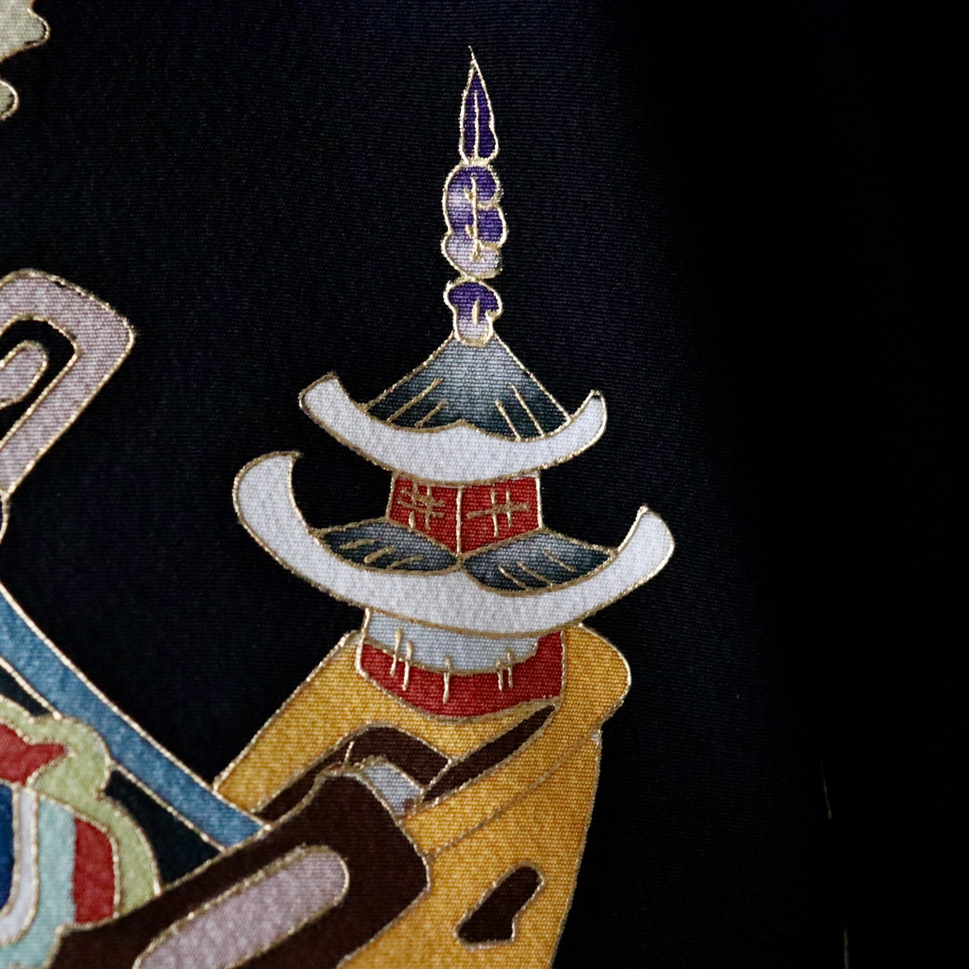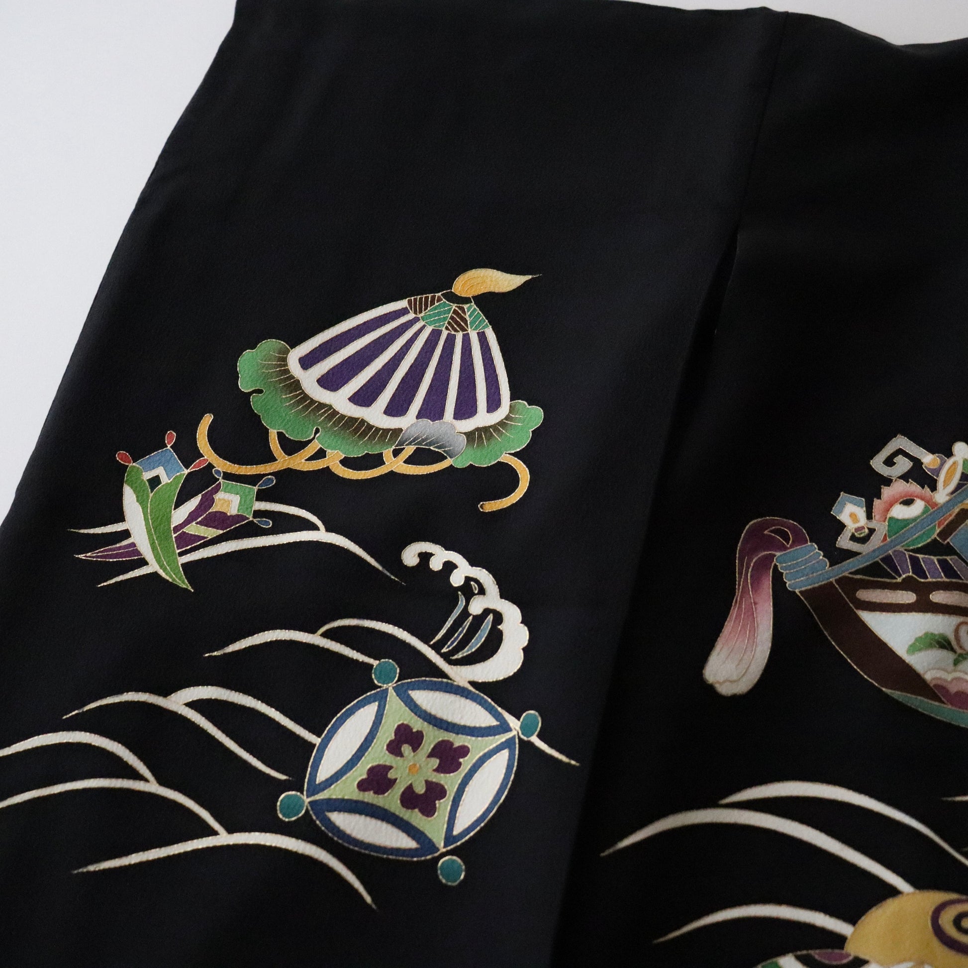 生地表情豊かな最上質の縮緬地に手描き友禅で宝船が美しく描いた本作は京友禅で名を馳せる『岡重』謹製。