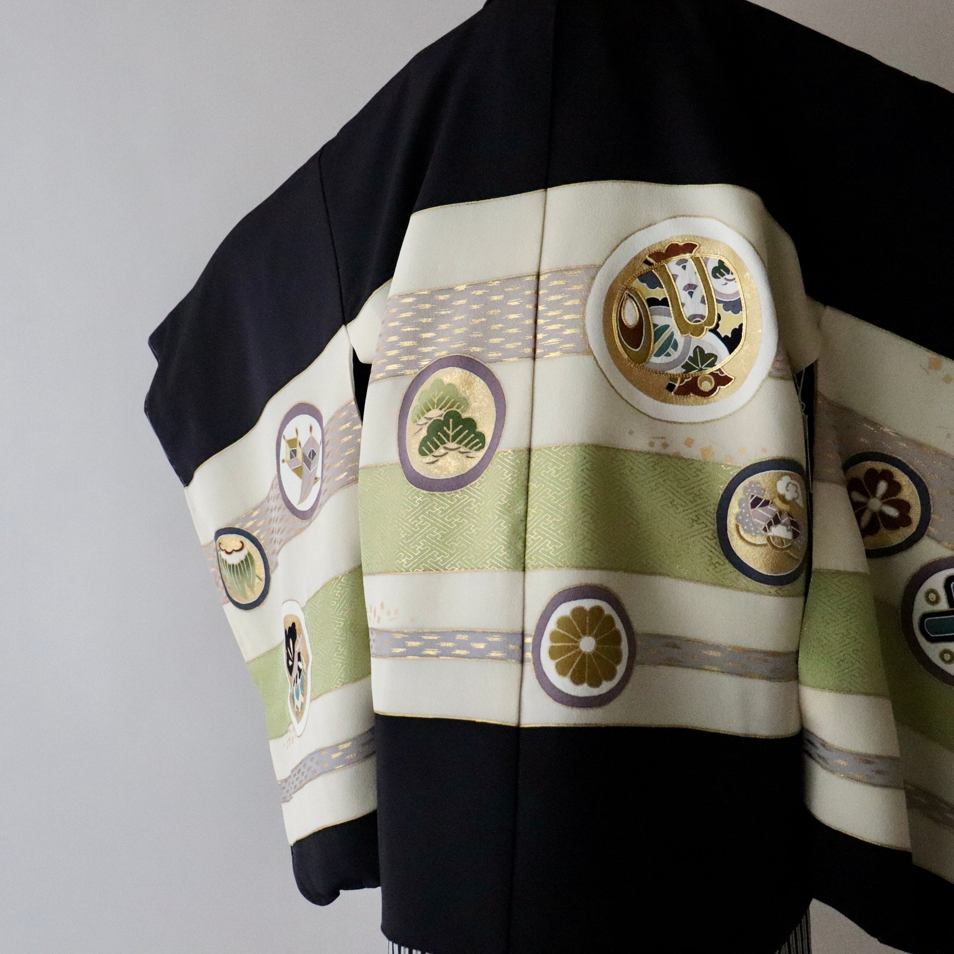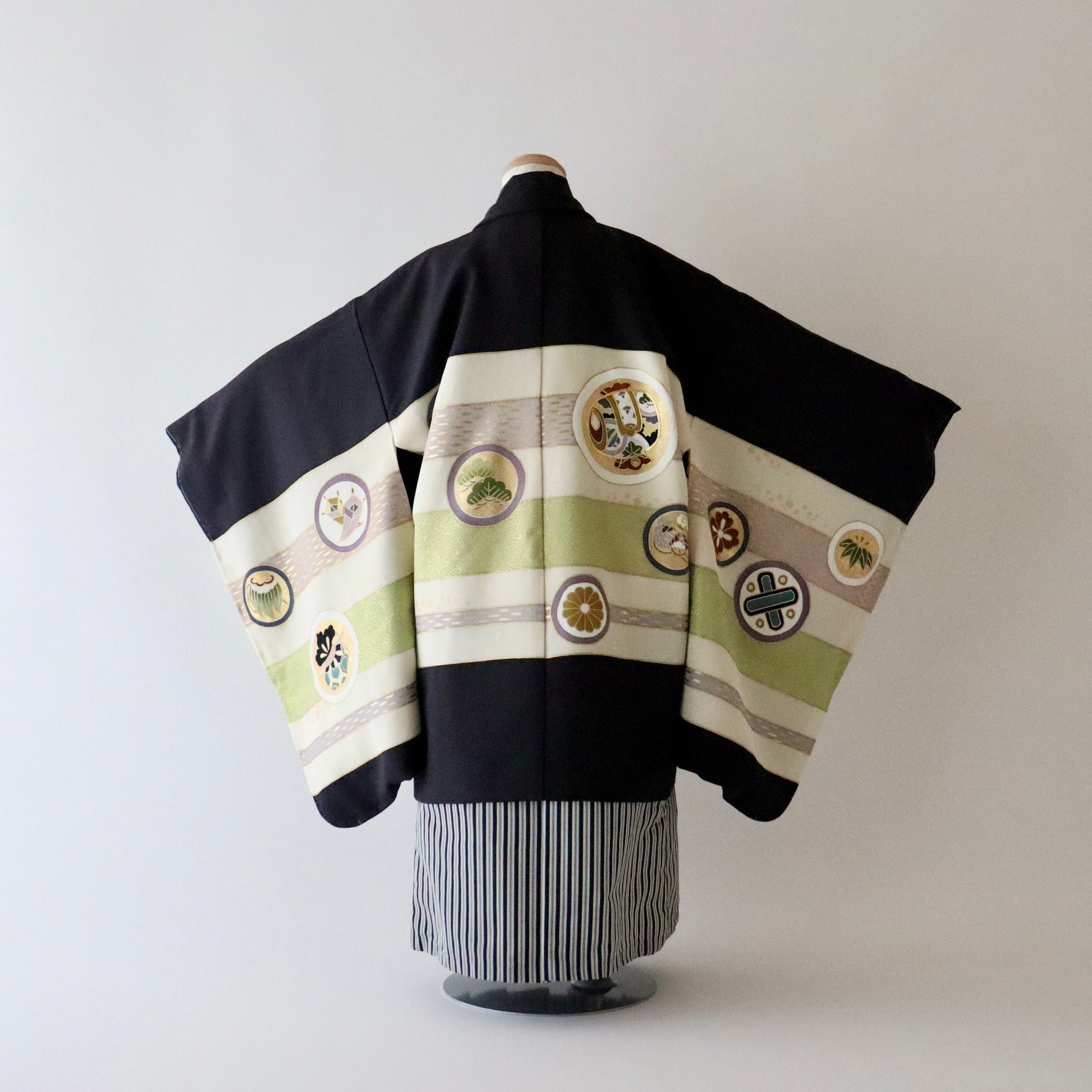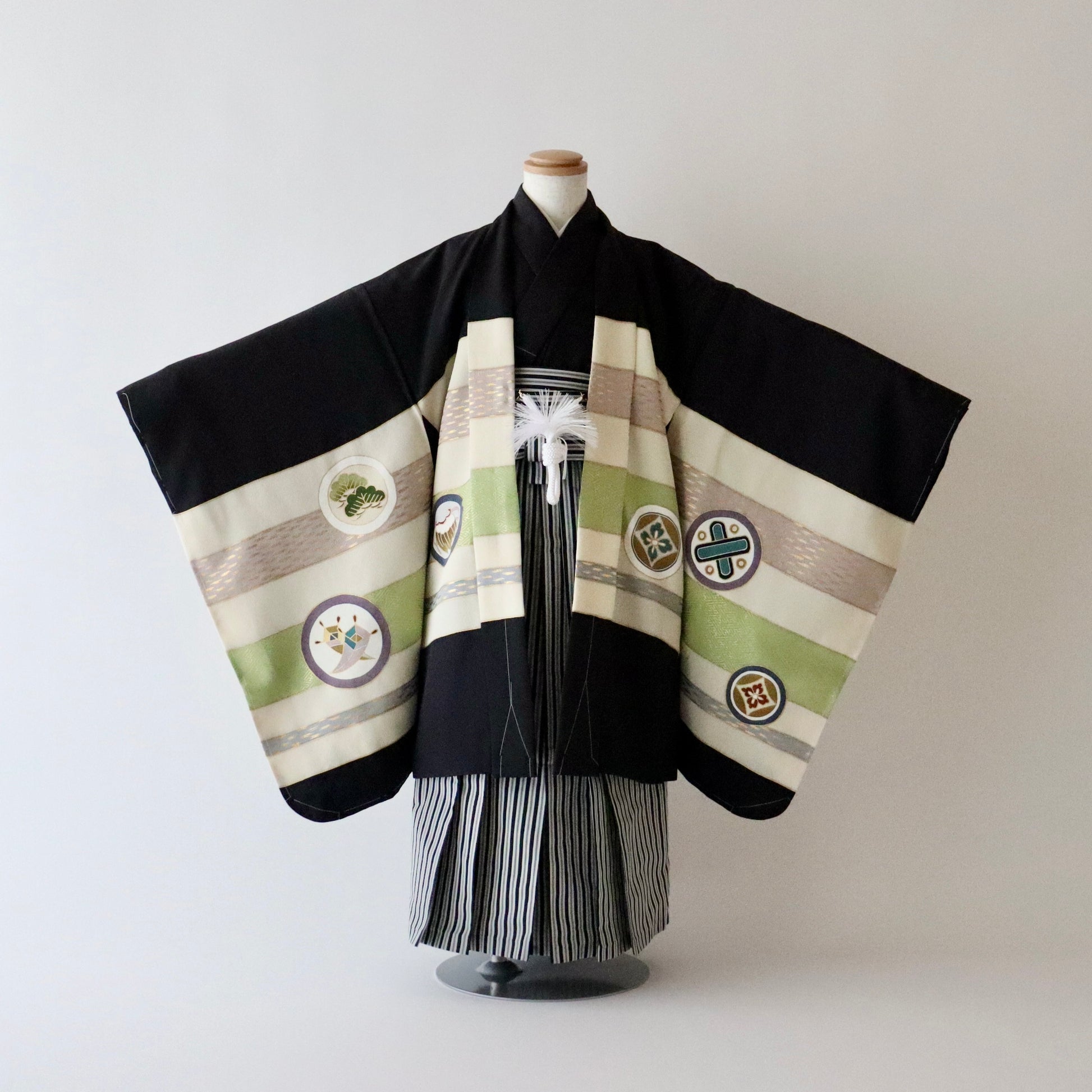 古典的柄構図「熨斗目」に松や宝尽くしの「丸文」を御祝着らしく上品かつ可愛げに染め描いた本作。手描き友禅による美しい柄描写と色彩、そして品のある金彩。男児の御祝着らしい潔く凛とした印象が美事な御祝着セットです。