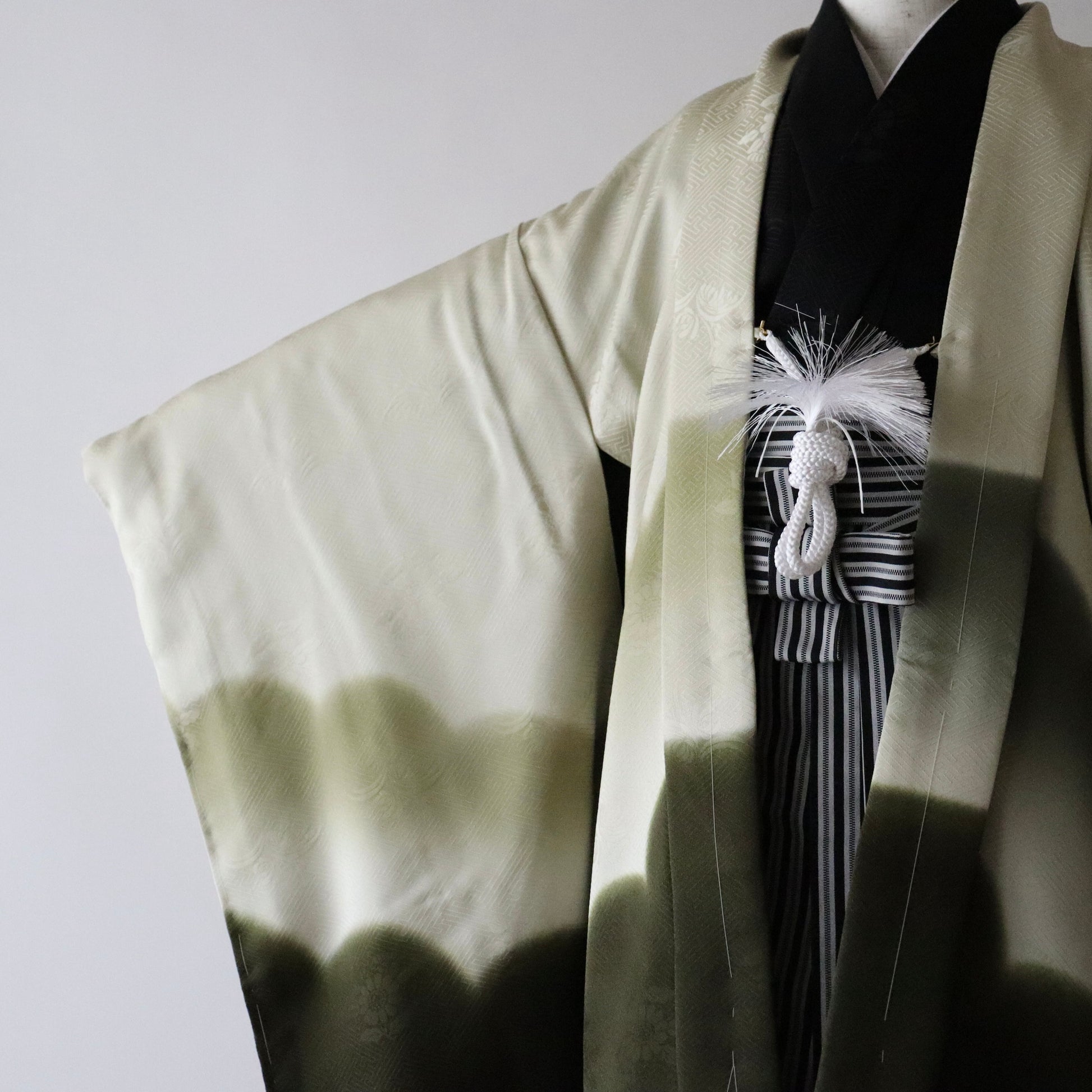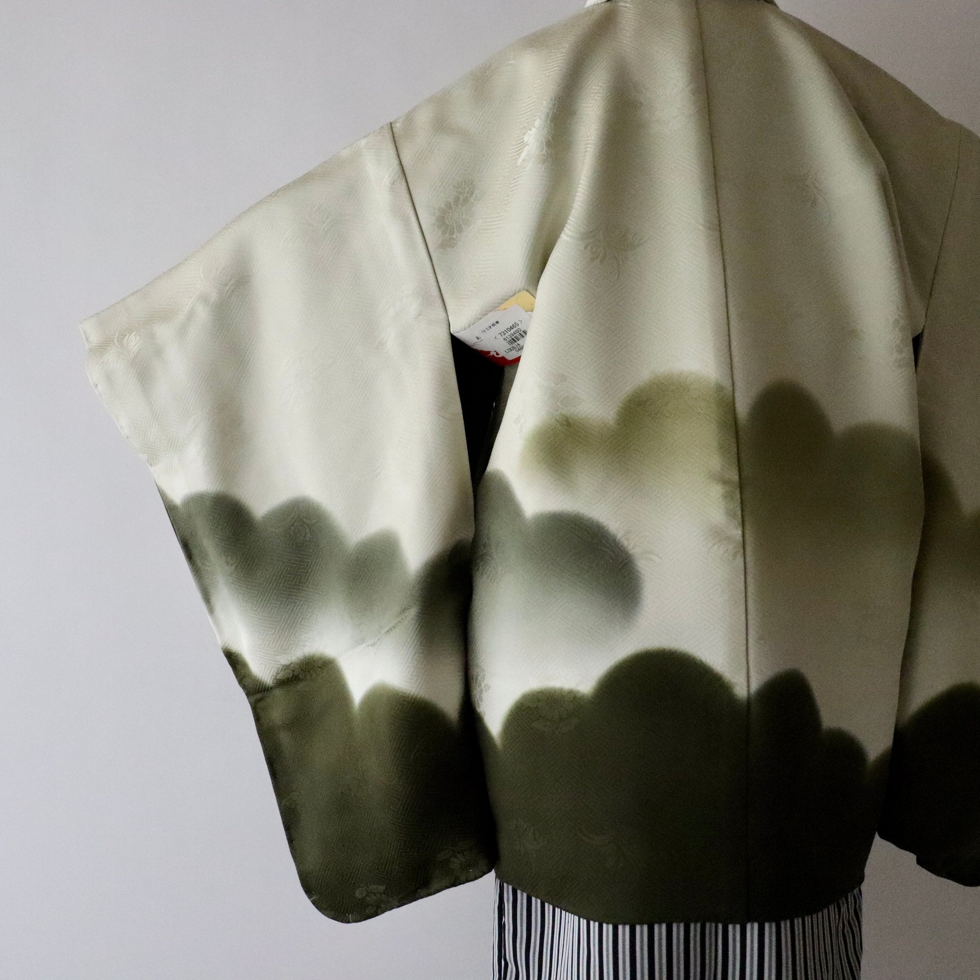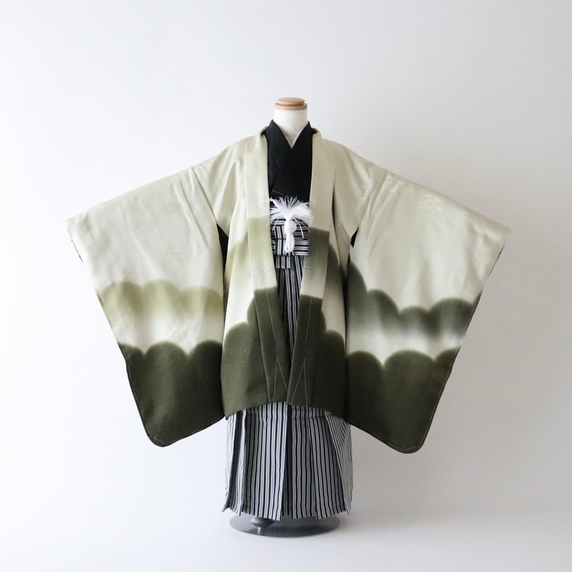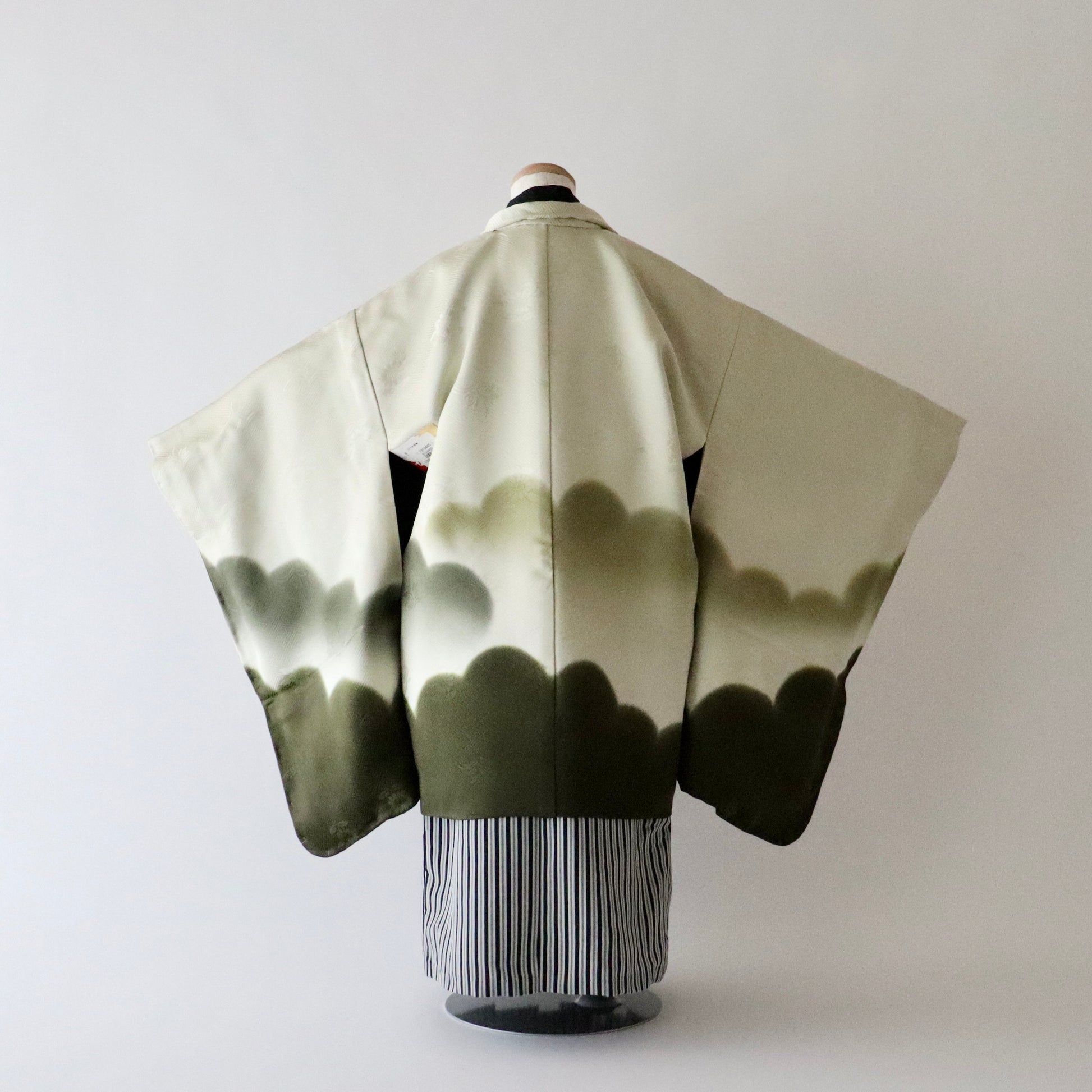 優美な雲を優美に染め表した本作。器物文様は用いず暈し染によるコントラストのみで彩ったシンプルかつ個性的な御祝着。すっきりとした意匠はご子息の存在感を引き立て、お祝いの席を上品に彩ります。