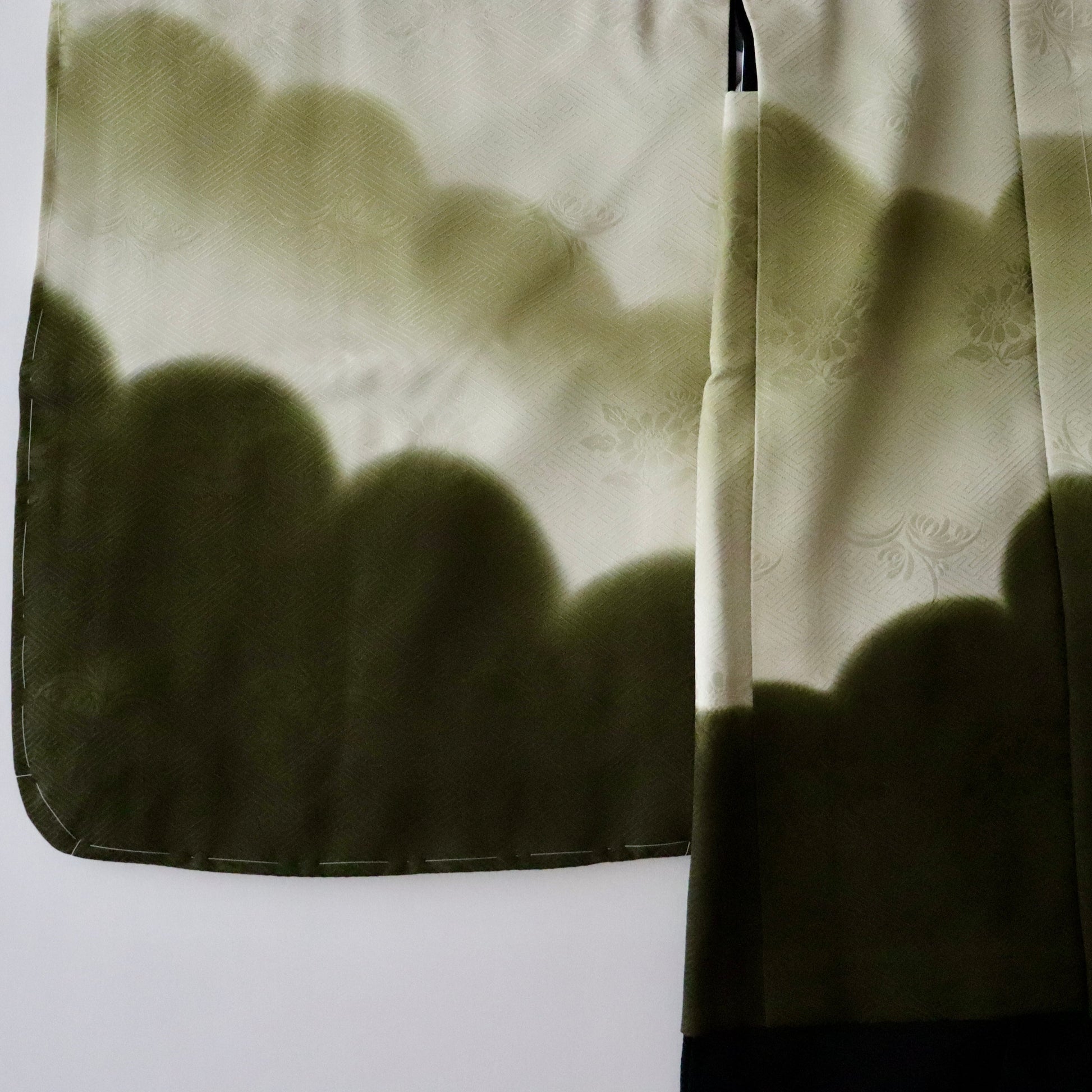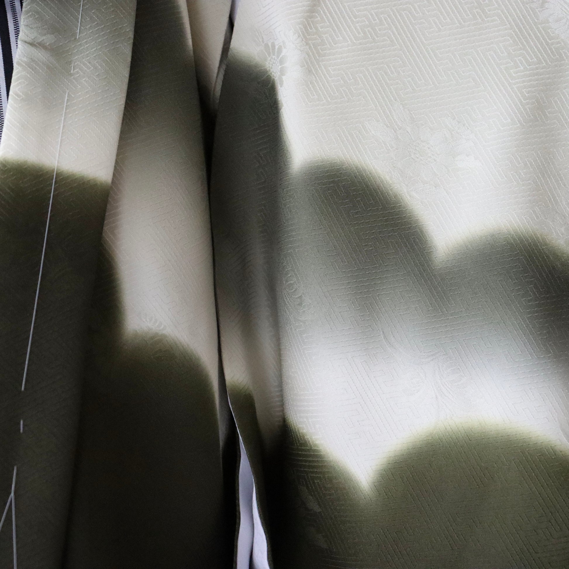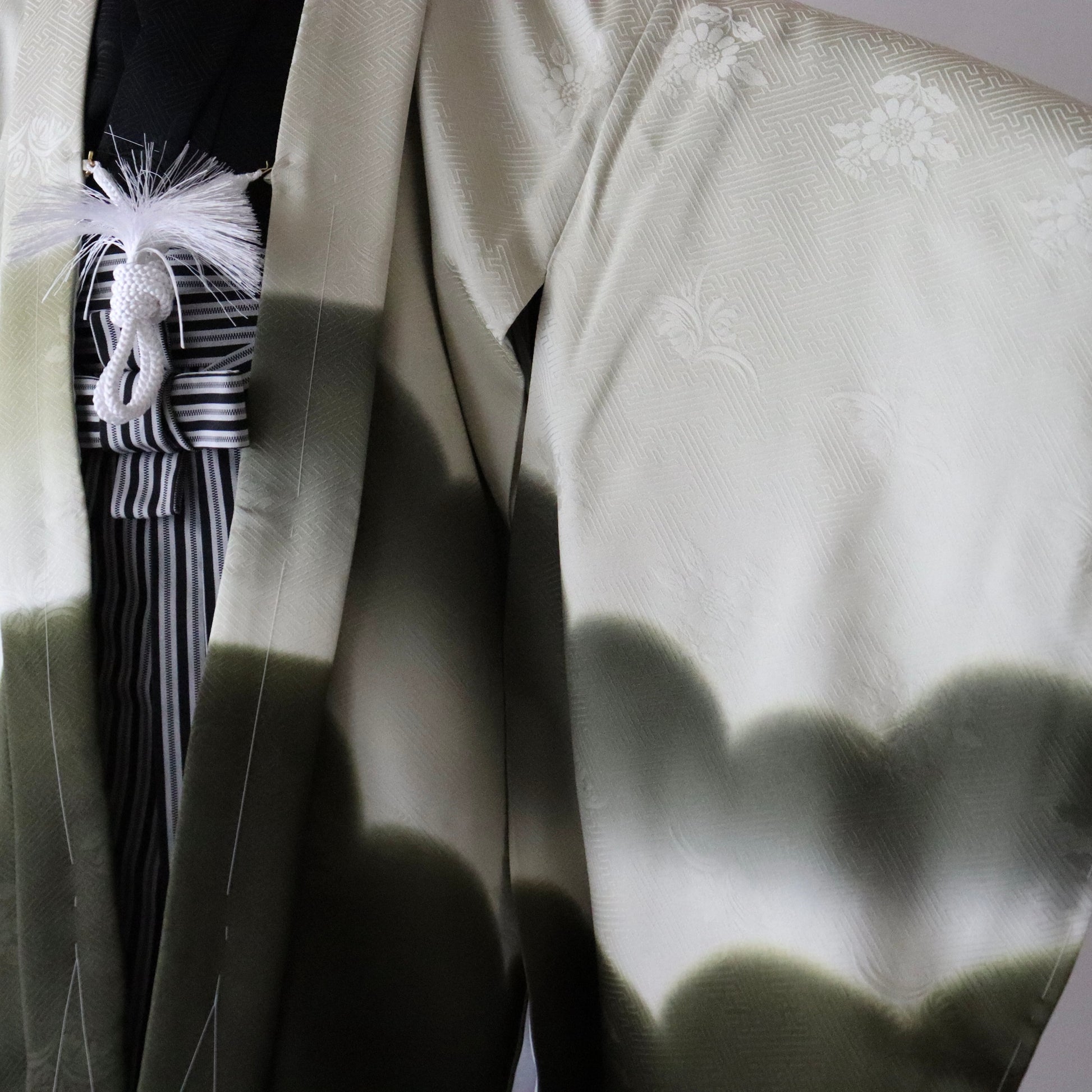 優美な雲を優美に染め表した本作。器物文様は用いず暈し染によるコントラストのみで彩ったシンプルかつ個性的な御祝着。すっきりとした意匠はご子息の存在感を引き立て、お祝いの席を上品に彩ります。