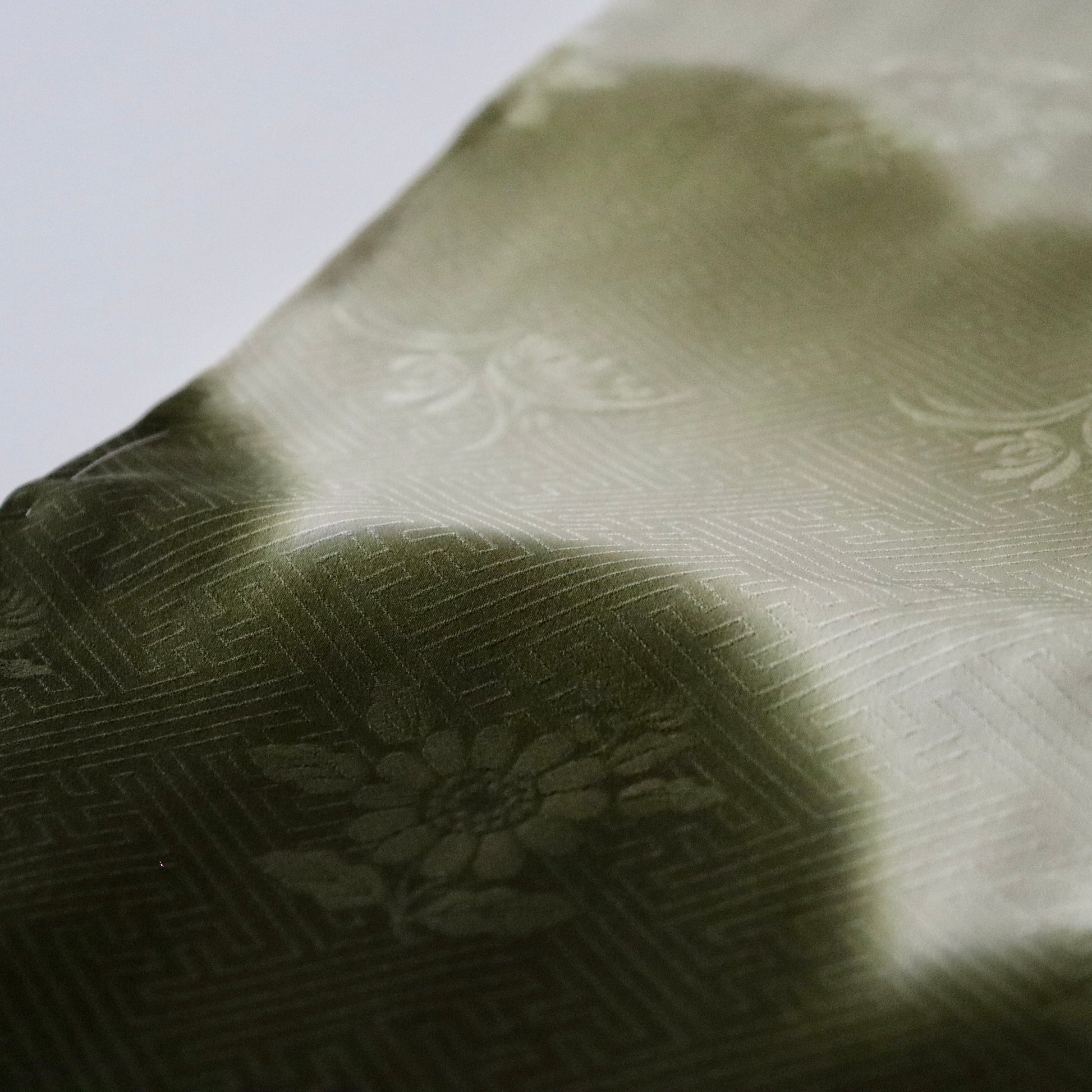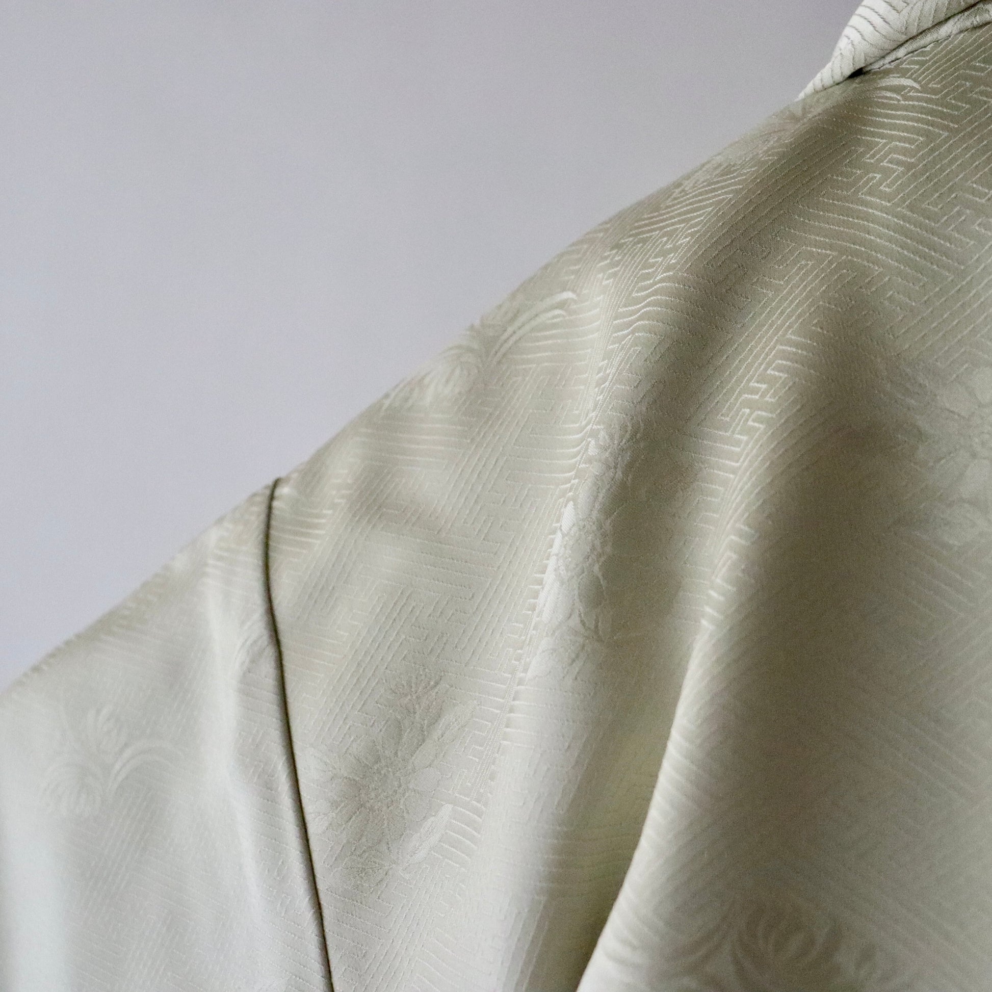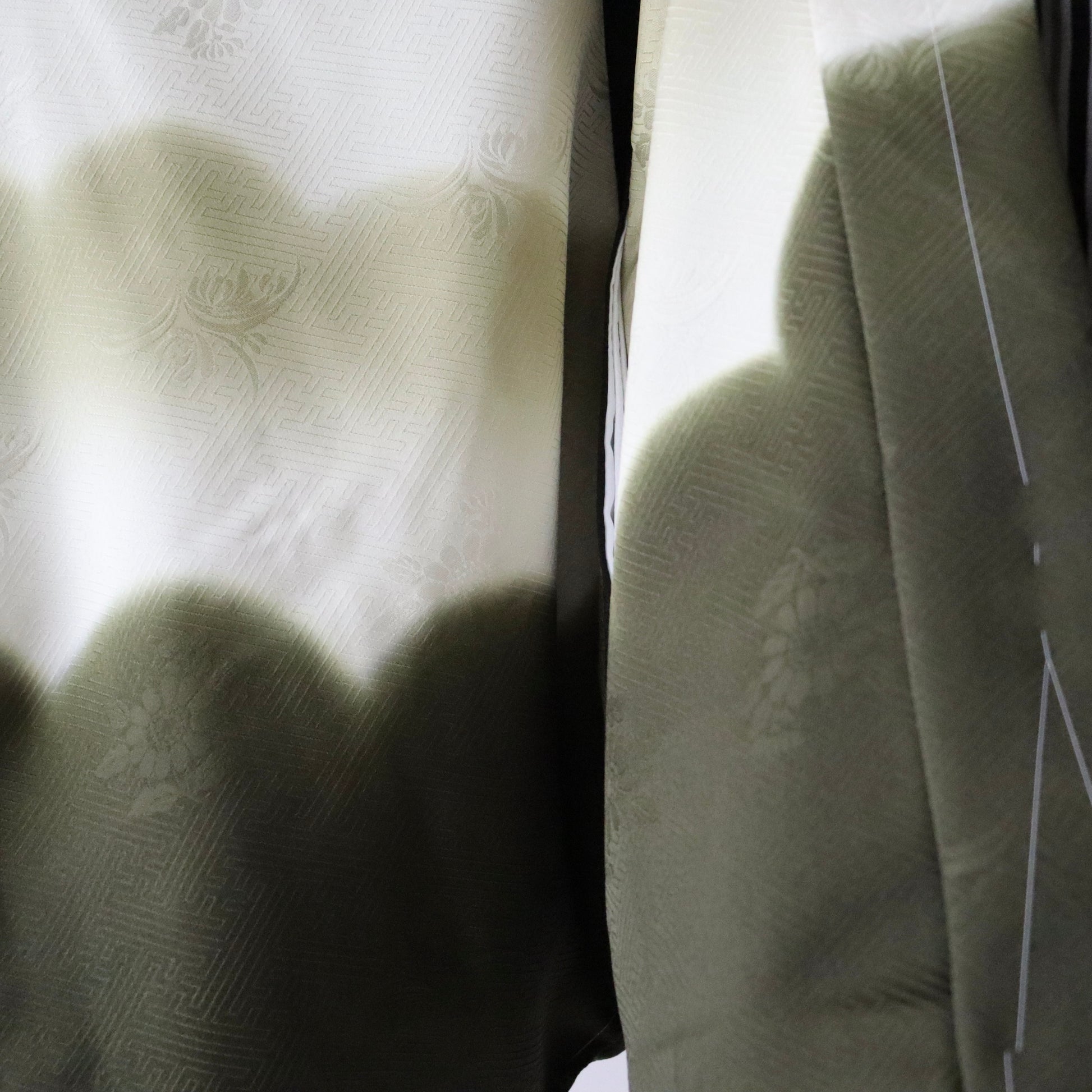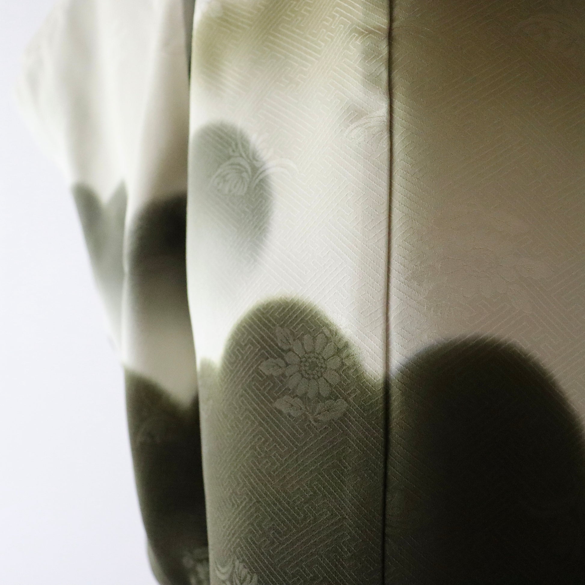 優美な雲を優美に染め表した本作。器物文様は用いず暈し染によるコントラストのみで彩ったシンプルかつ個性的な御祝着。すっきりとした意匠はご子息の存在感を引き立て、お祝いの席を上品に彩ります。