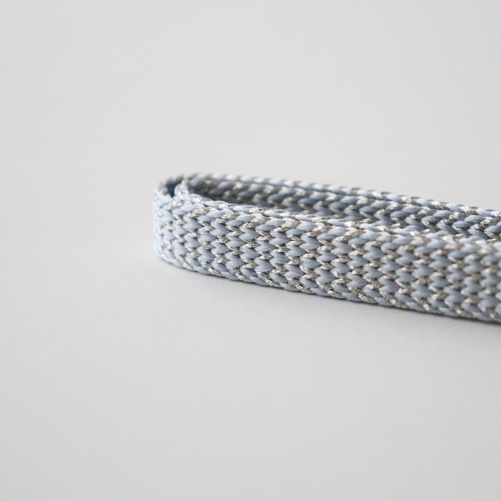 銀糸を散らすように組み込んだ洒落た仕上がりの三分紐。煌びやかな表情は浴衣や夏きものはもちろん、単衣から袷まで通年でコーディネート頂ける三分紐です。合わせる帯留でカジュアルフォーマルそれぞれのシーンでコーディネートをお楽しみ下さい。