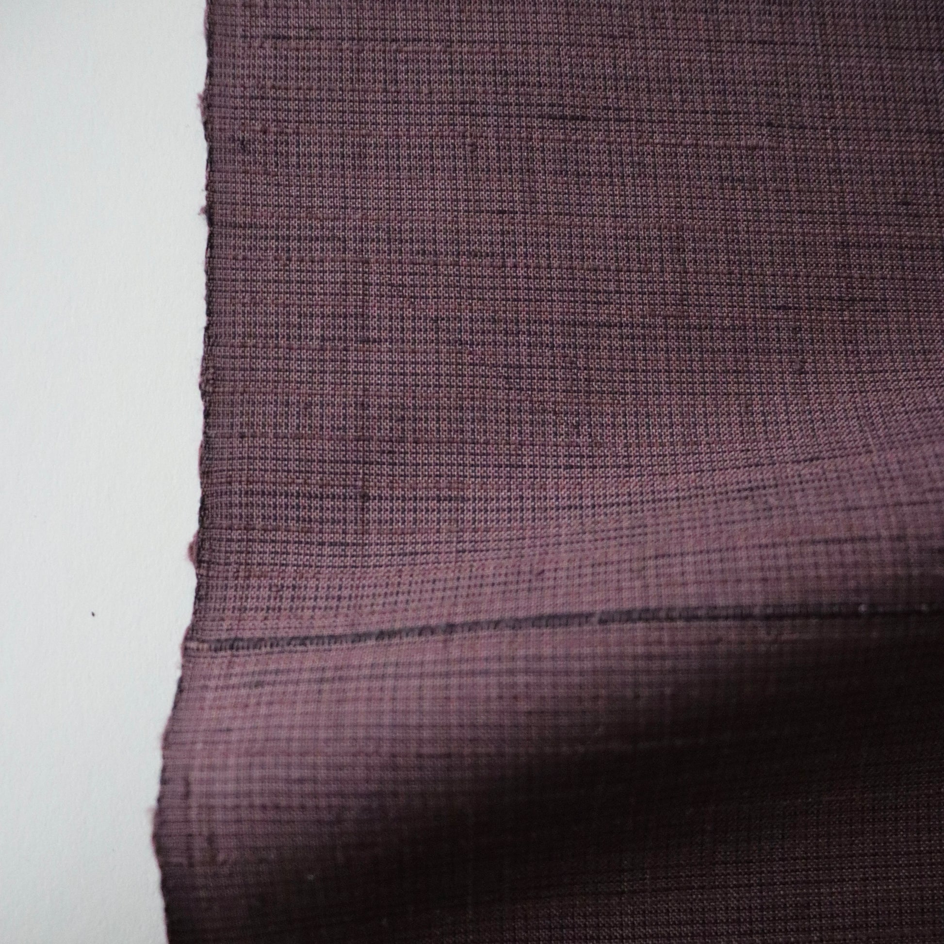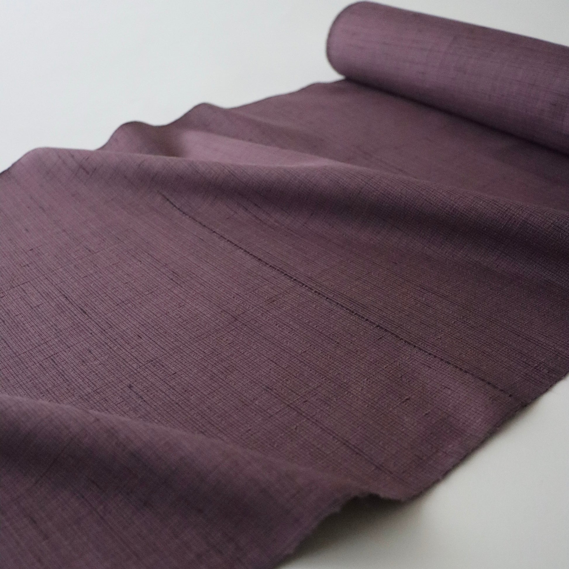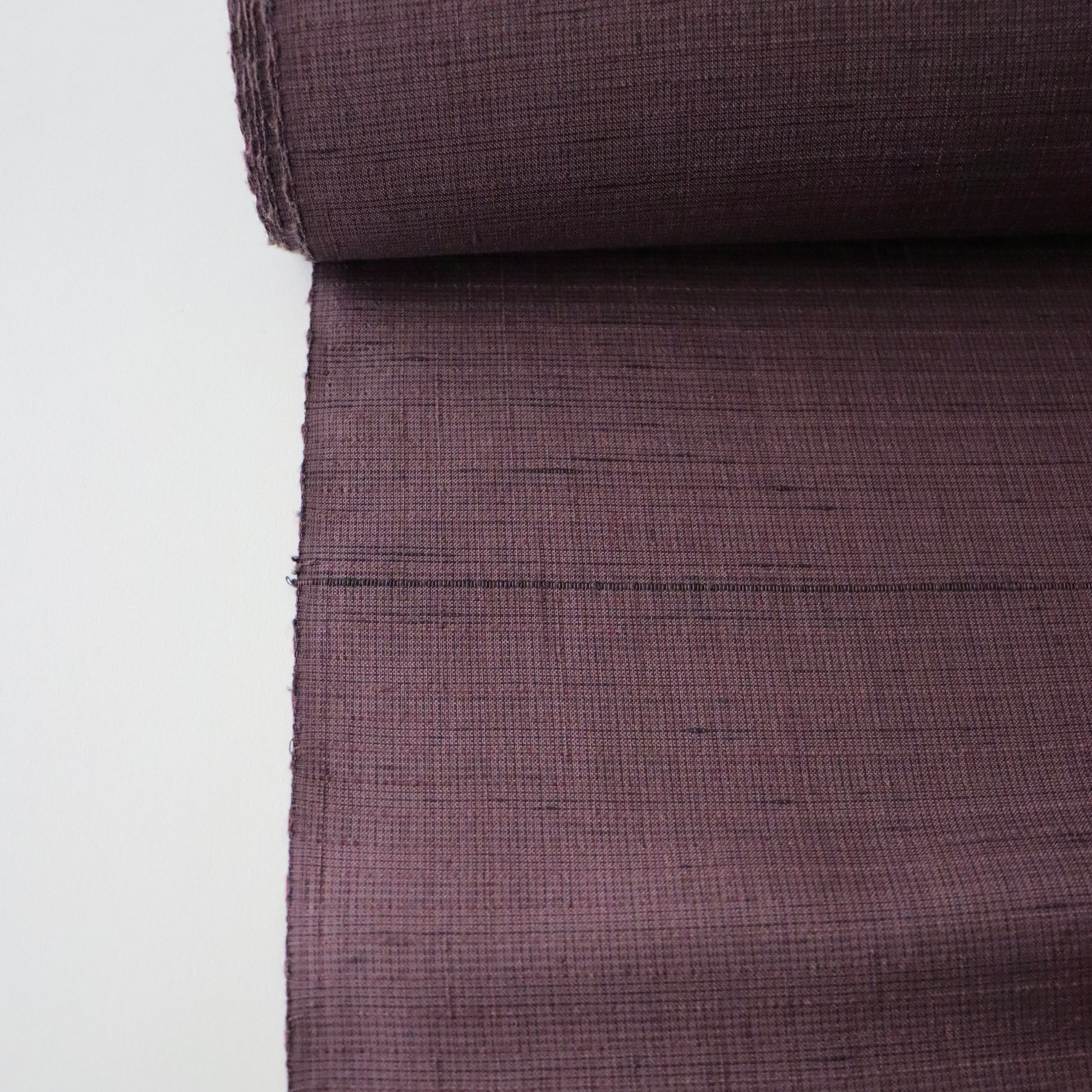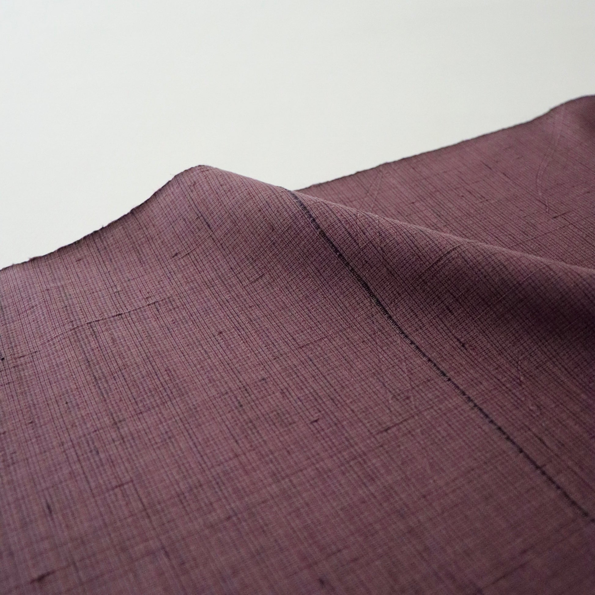 栗や桜、茜など地元信州をはじめ全国各地の草木から染料を抽出した草木染めを主体に独自の感性で作り出されるその織物(紬)は唯一無二の織表情を見せてくれる逸品揃い。基本的には同じ作品は制作せず、染めた糸との一期一会を大切に、常に思い描く色と表情を追い続ける小山さんの作品には紬好きを魅了する美しさが溢れています。一見無地に見える本作はランダムかと思うような間隔で茶黒のラインが織り込まれており、仕立てた際にそのラインが掛襟や上前、衽、袖に位置し、すっきりとした無地感覚の紬に程よいリズムを与えています。