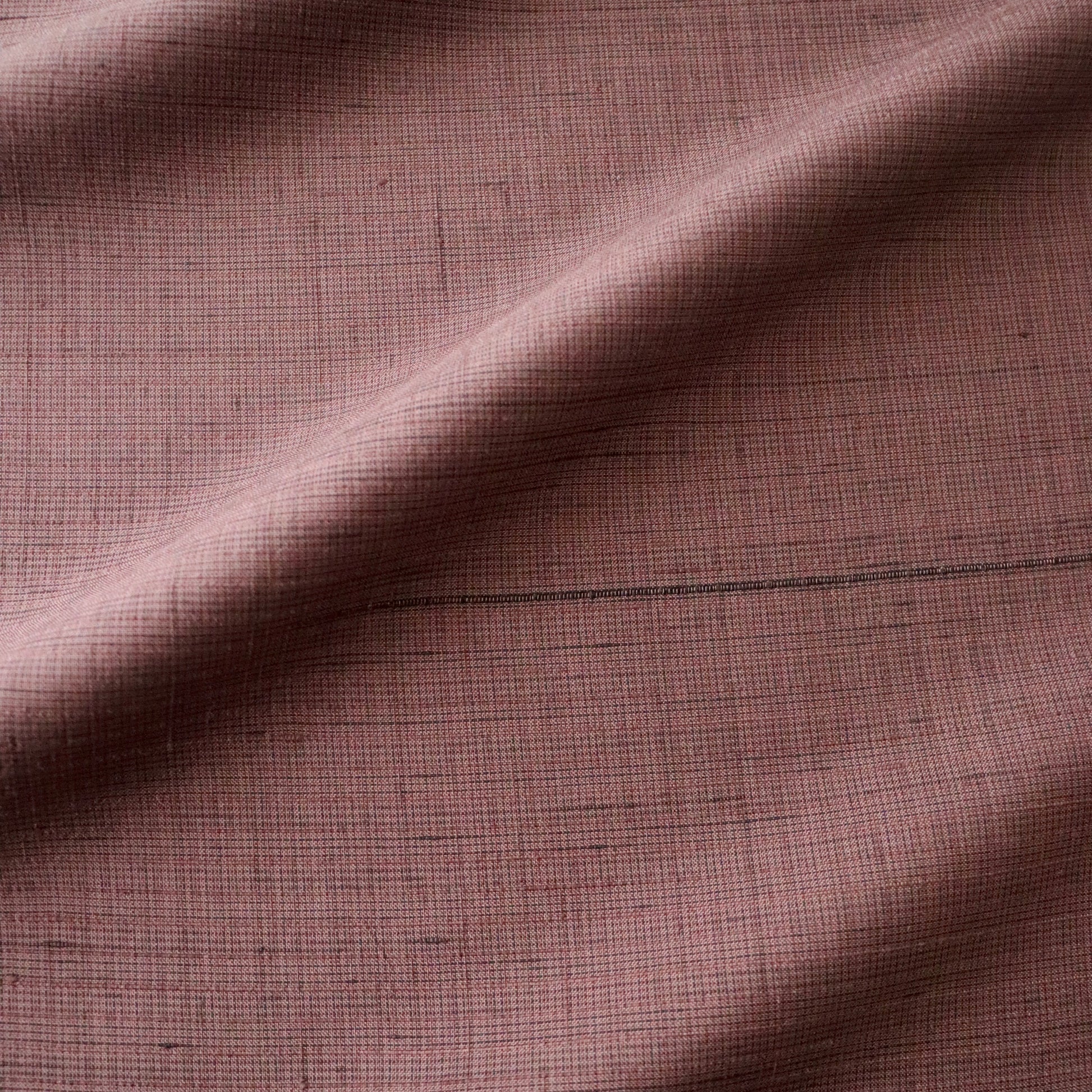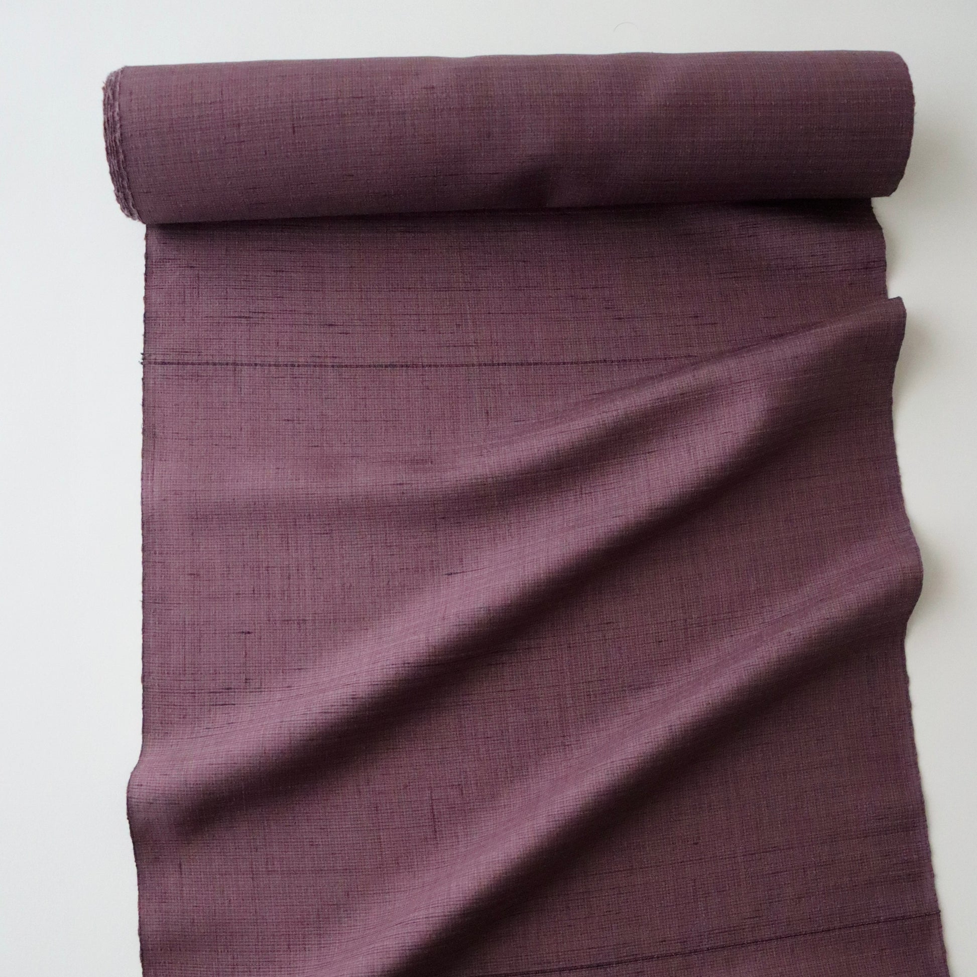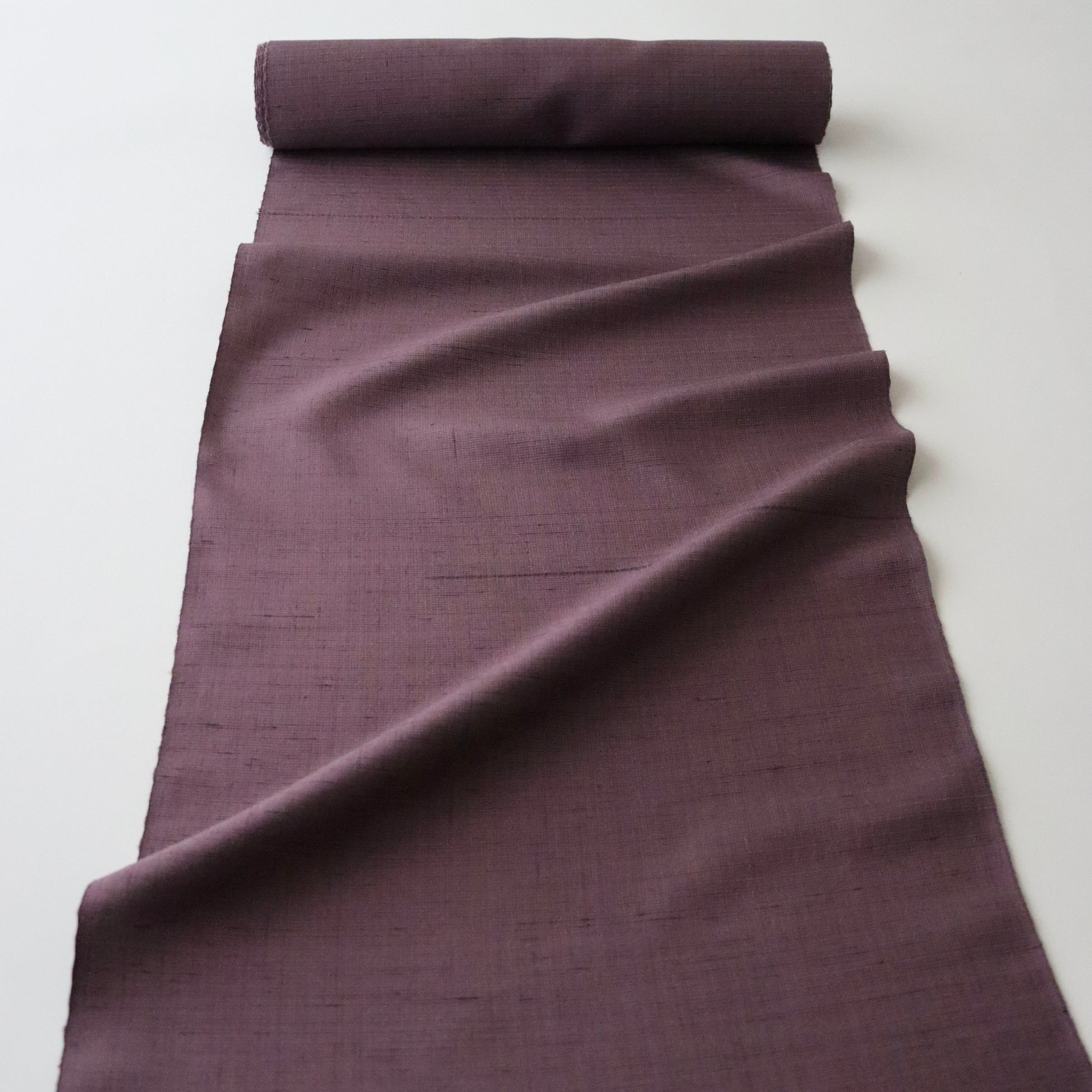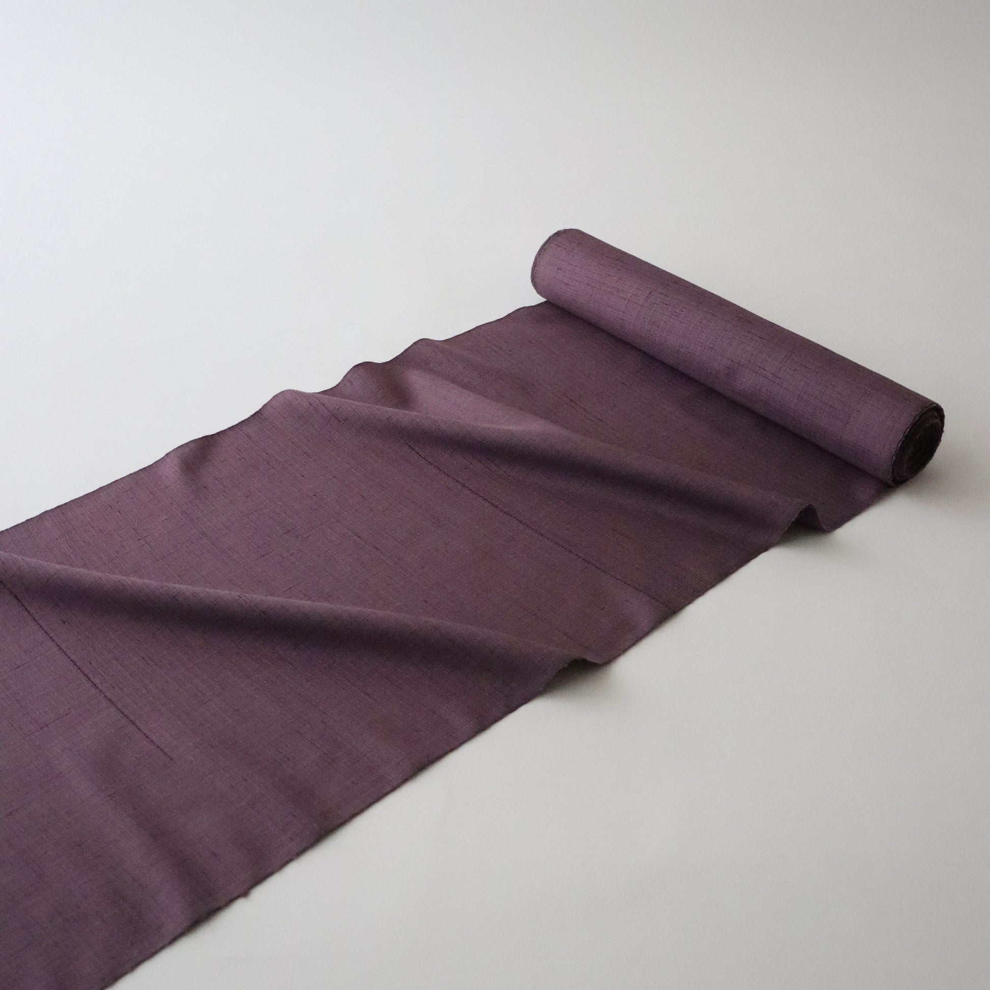 栗や桜、茜など地元信州をはじめ全国各地の草木から染料を抽出した草木染めを主体に独自の感性で作り出されるその織物(紬)は唯一無二の織表情を見せてくれる逸品揃い。基本的には同じ作品は制作せず、染めた糸との一期一会を大切に、常に思い描く色と表情を追い続ける小山さんの作品には紬好きを魅了する美しさが溢れています。一見無地に見える本作はランダムかと思うような間隔で茶黒のラインが織り込まれており、仕立てた際にそのラインが掛襟や上前、衽、袖に位置し、すっきりとした無地感覚の紬に程よいリズムを与えています。