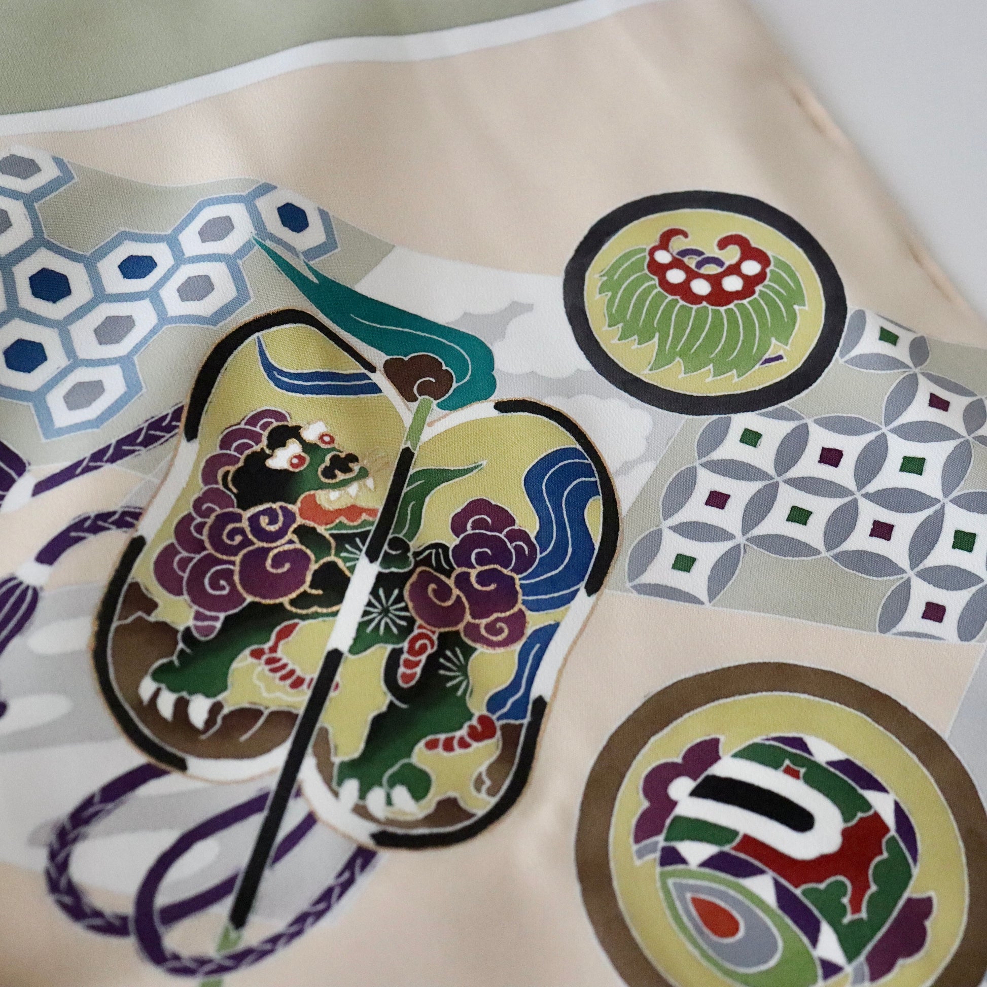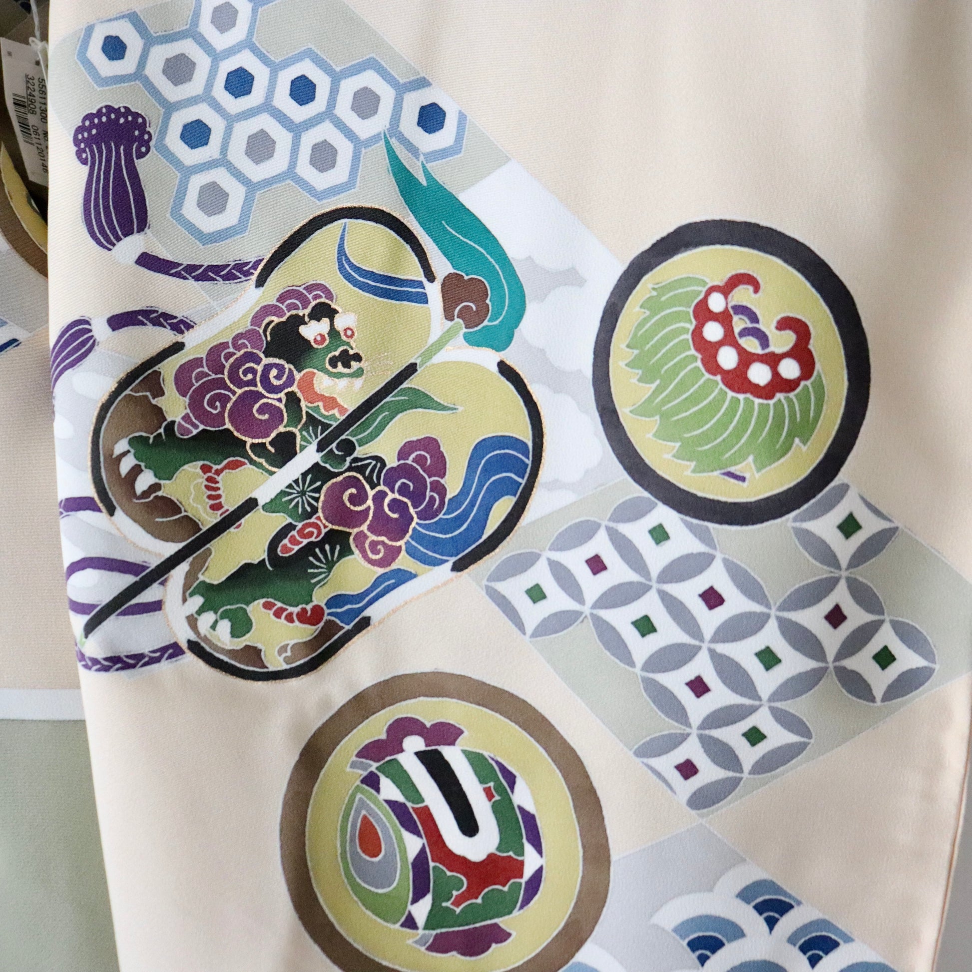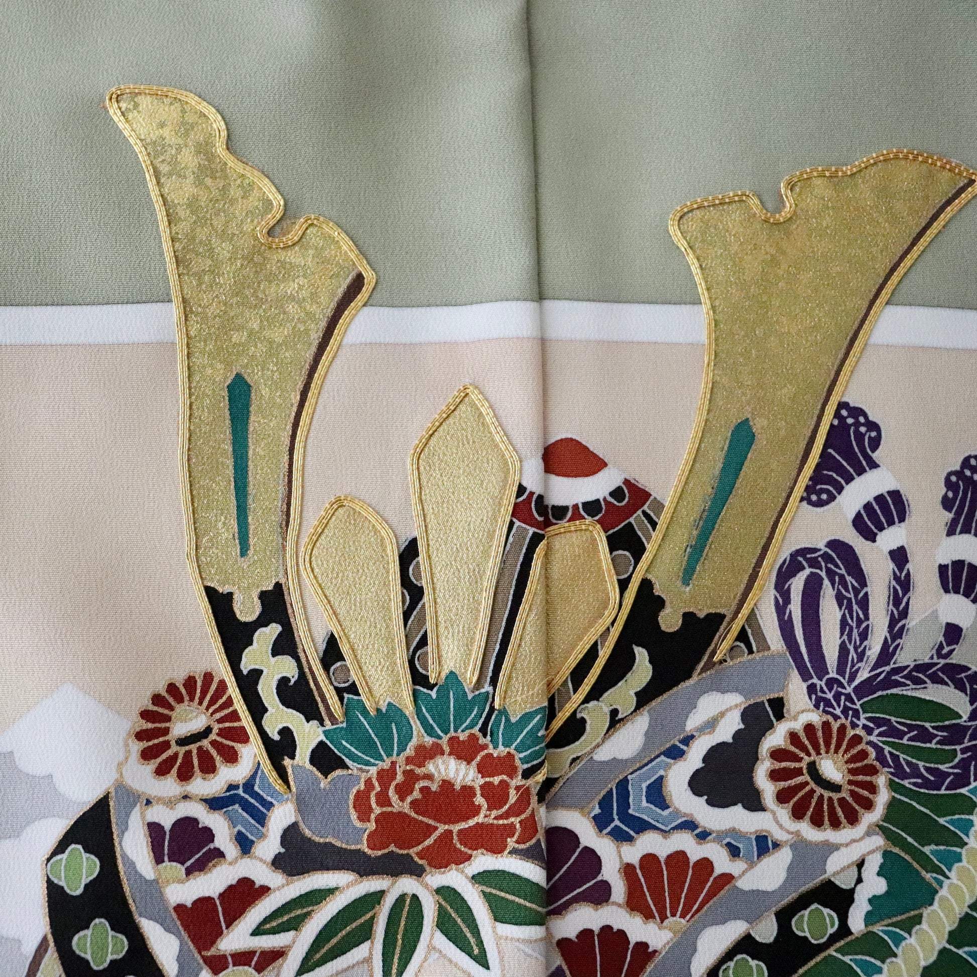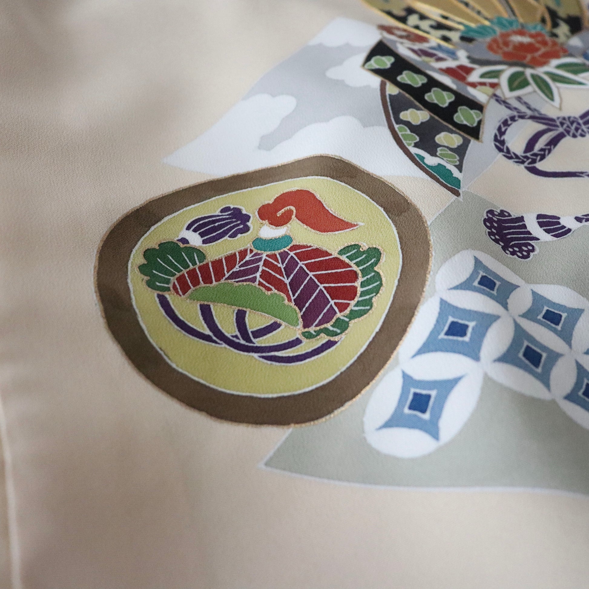 男児祝着の定番『兜』を基調にした一枚。淡色のコントラストが品のある雰囲気を醸し出す本作は柄一つ一つを丁寧な手描き友禅で染め上げています。「災いから身を守る」「立身出世」などの意味合いが込められた”兜”に「願いを叶える」とされる”小槌”。そして「決断力と行動力」を象徴する”軍配”。大切なご子息の健やかで明るい将来を願うご家族様の思いが美しく表現された御祝着セットです。