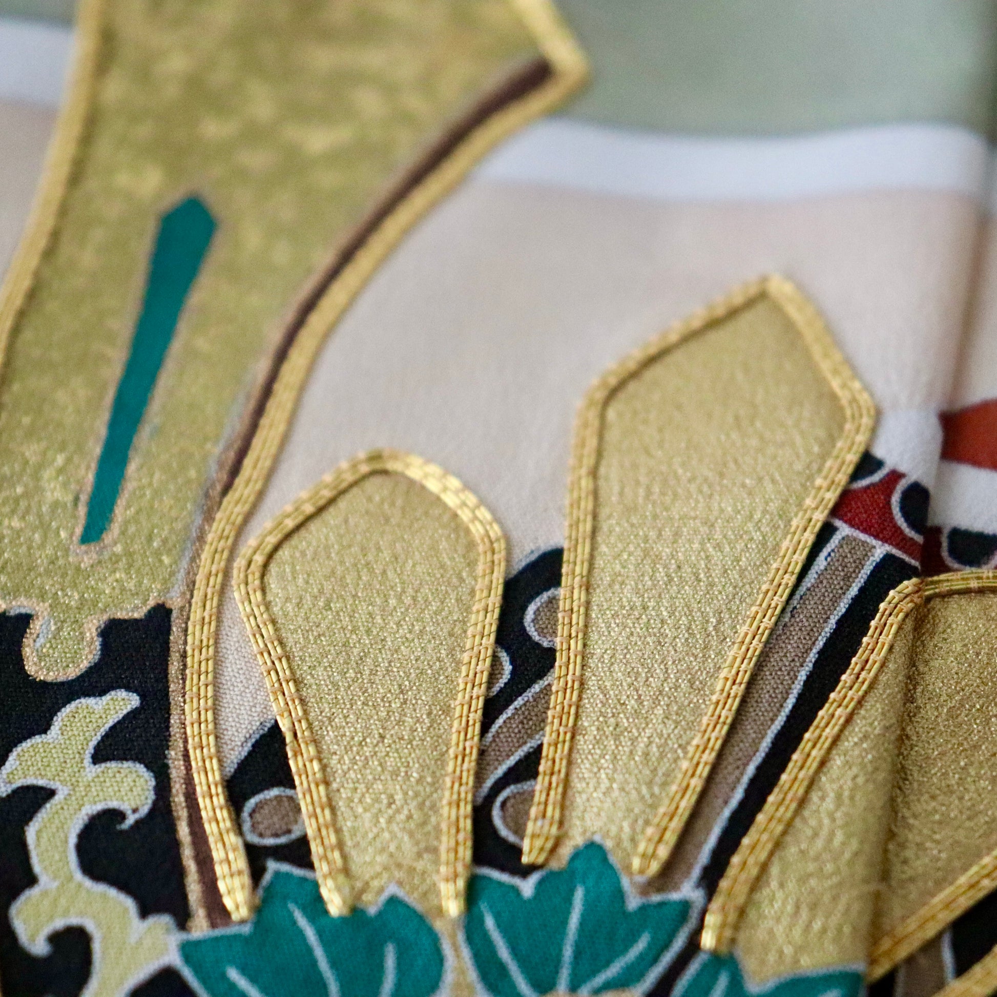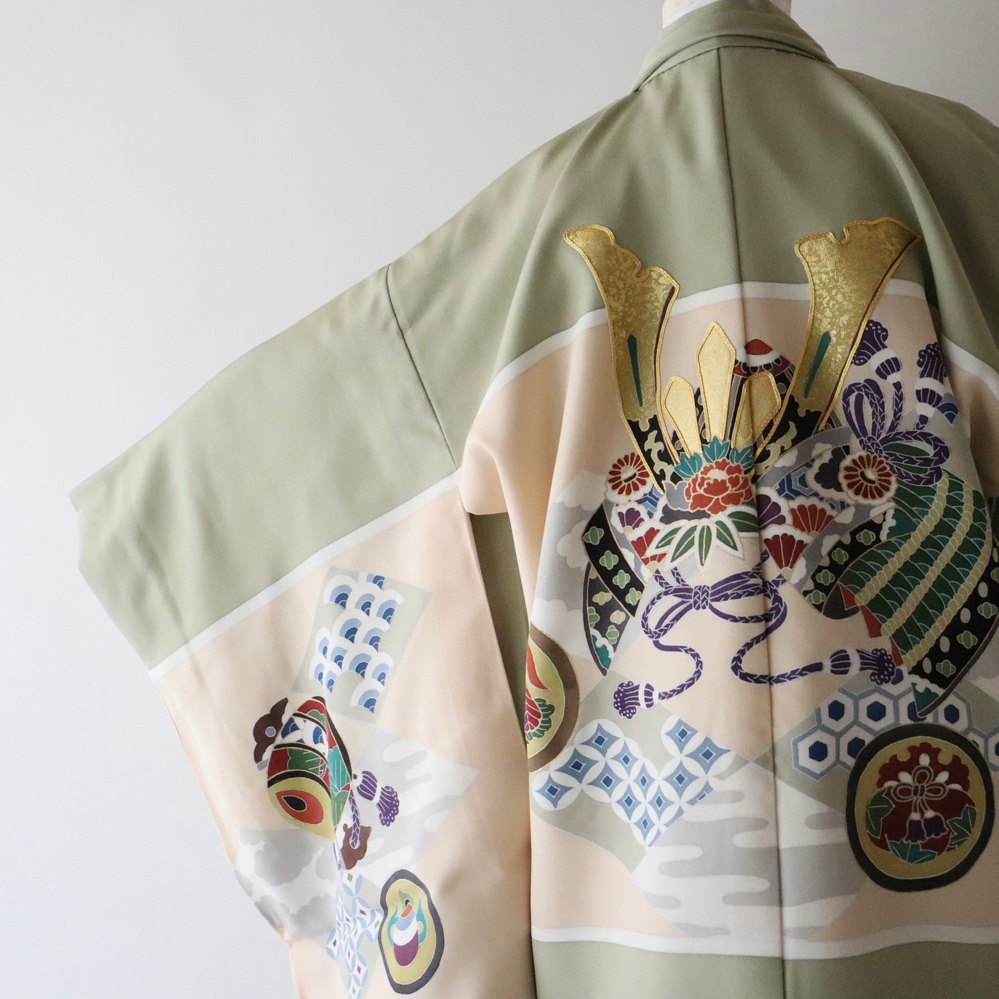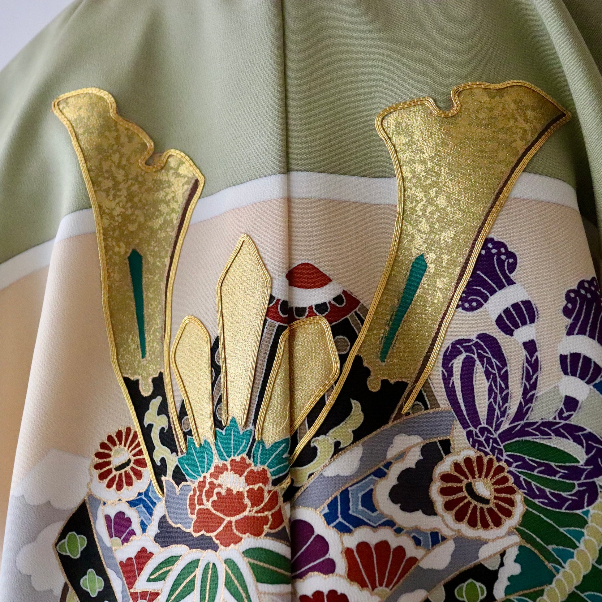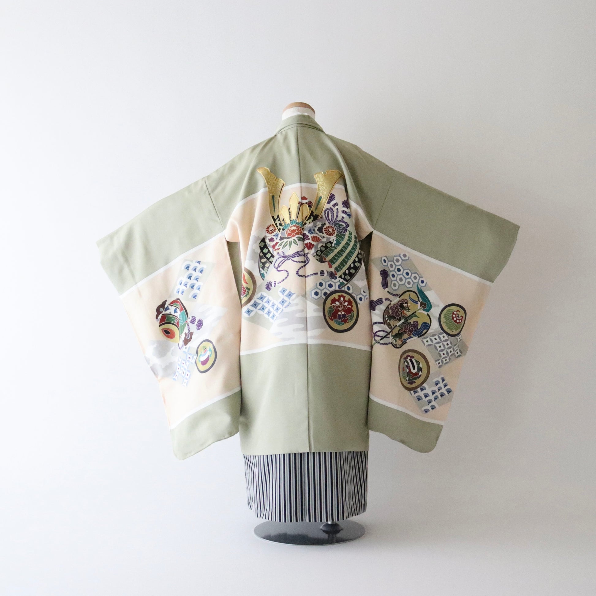 男児祝着の定番『兜』を基調にした一枚。淡色のコントラストが品のある雰囲気を醸し出す本作は柄一つ一つを丁寧な手描き友禅で染め上げています。「災いから身を守る」「立身出世」などの意味合いが込められた”兜”に「願いを叶える」とされる”小槌”。そして「決断力と行動力」を象徴する”軍配”。大切なご子息の健やかで明るい将来を願うご家族様の思いが美しく表現された御祝着セットです。