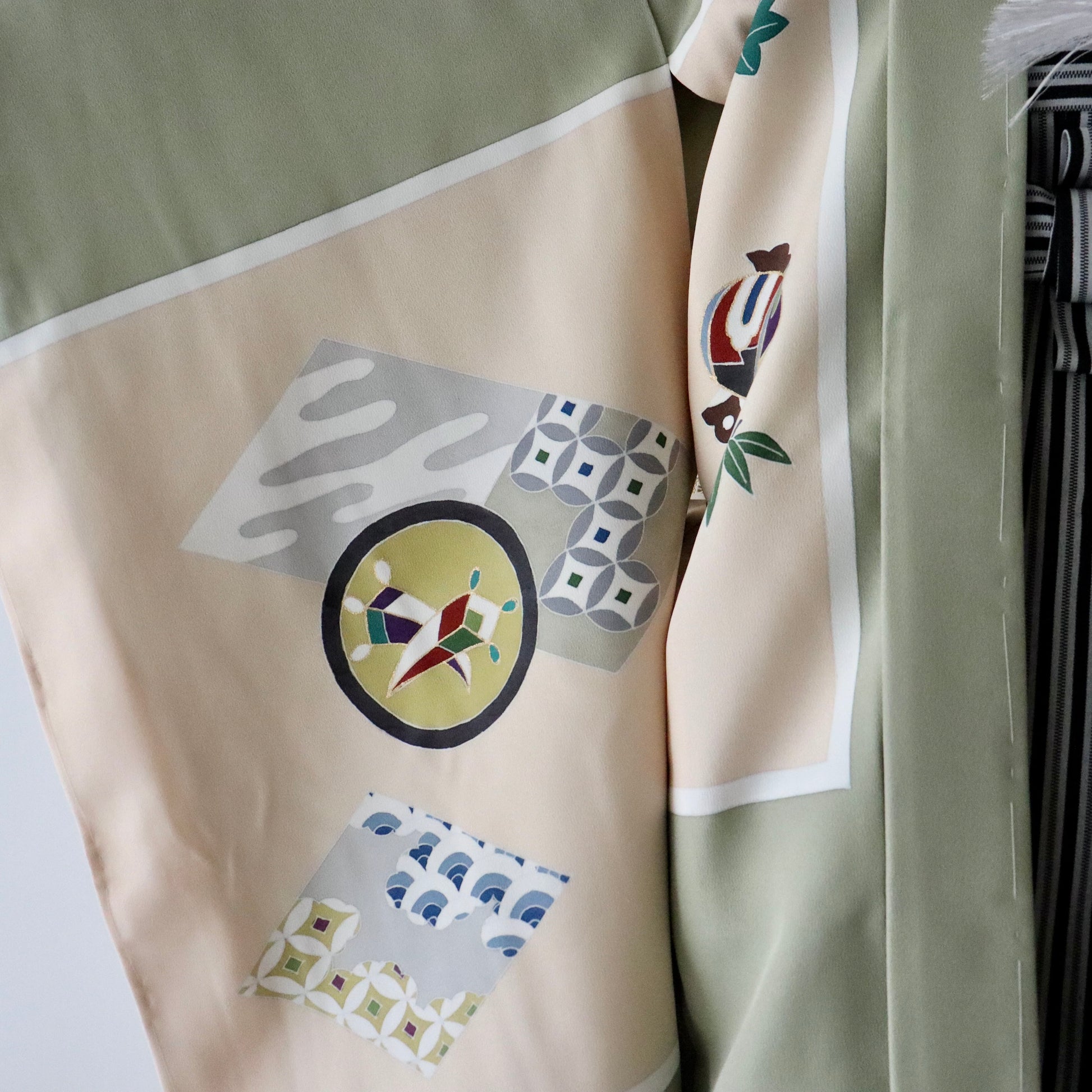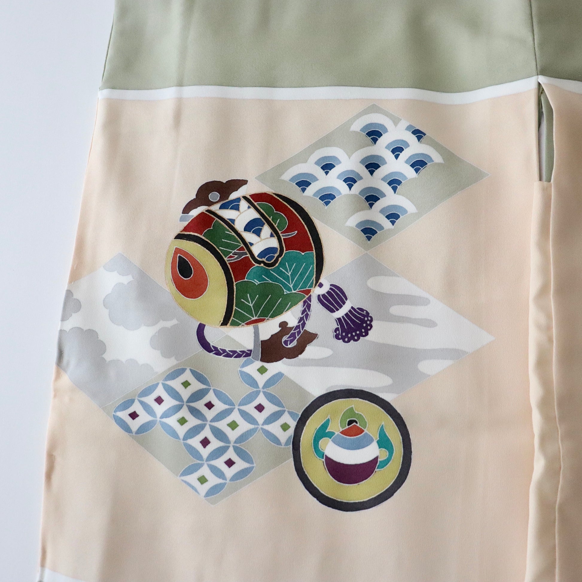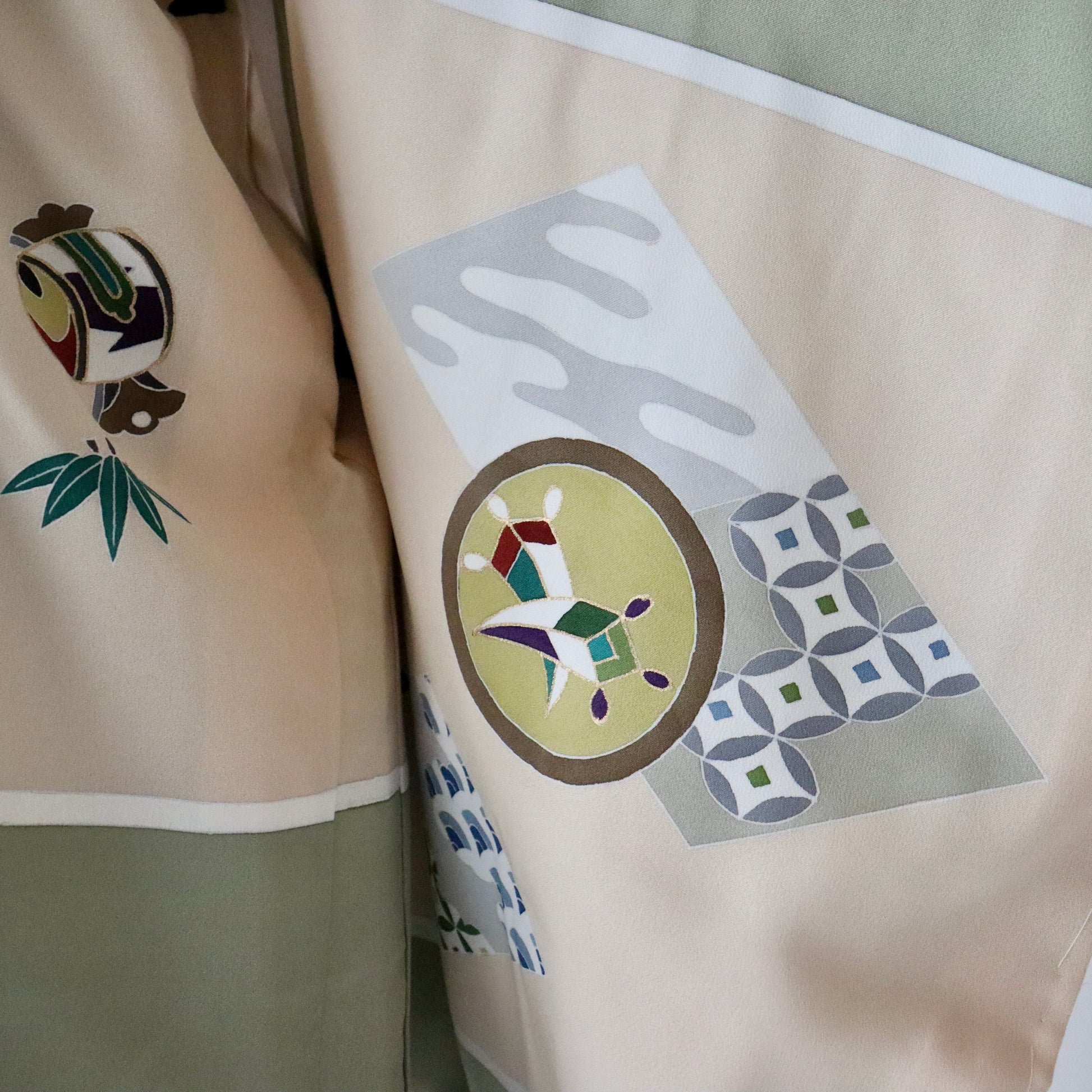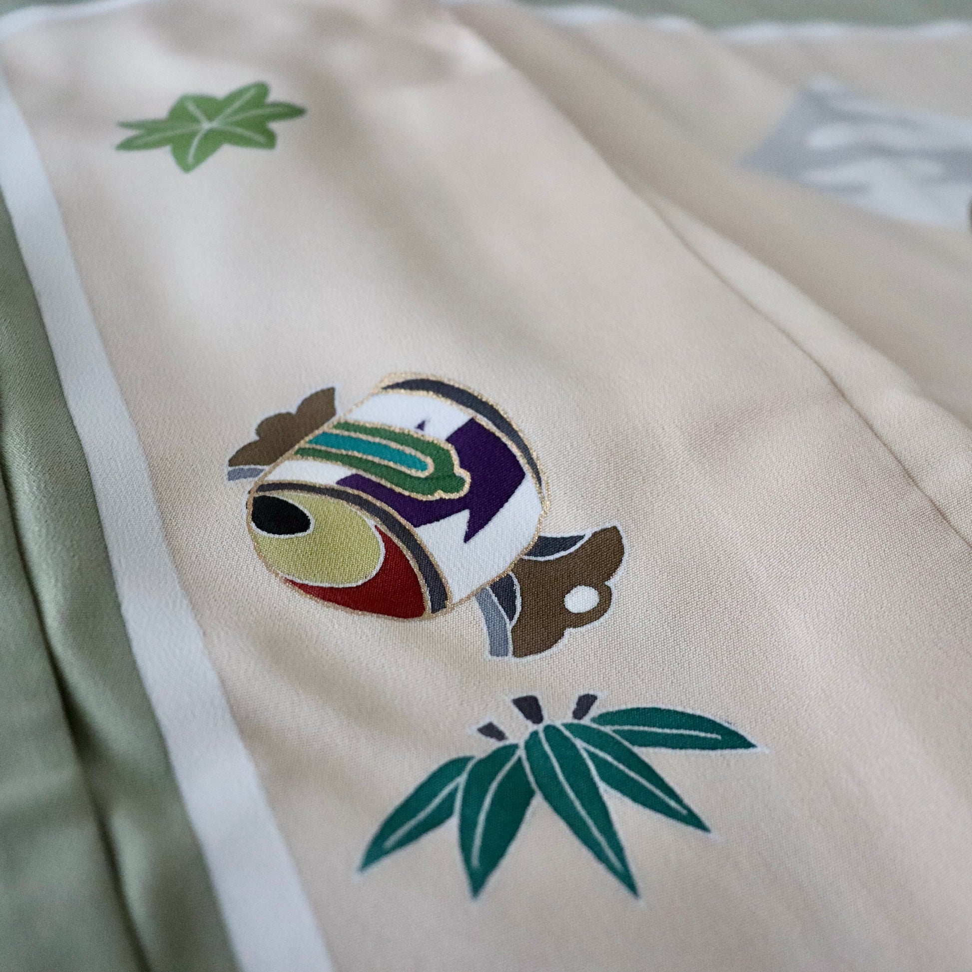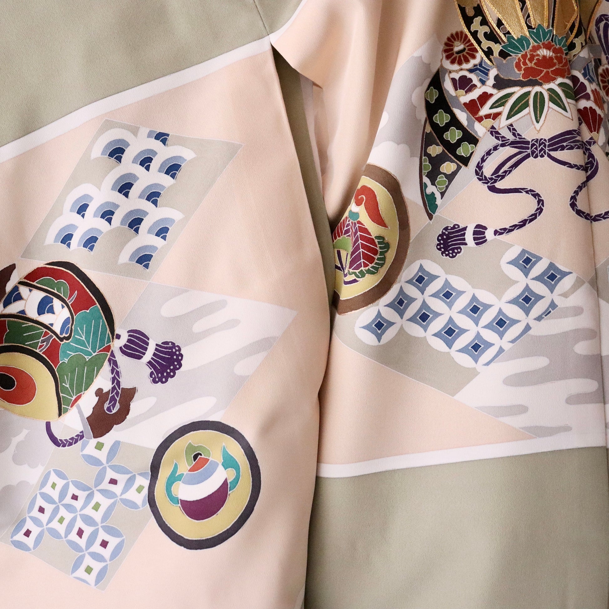 男児祝着の定番『兜』を基調にした一枚。淡色のコントラストが品のある雰囲気を醸し出す本作は柄一つ一つを丁寧な手描き友禅で染め上げています。「災いから身を守る」「立身出世」などの意味合いが込められた”兜”に「願いを叶える」とされる”小槌”。そして「決断力と行動力」を象徴する”軍配”。大切なご子息の健やかで明るい将来を願うご家族様の思いが美しく表現された御祝着セットです。
