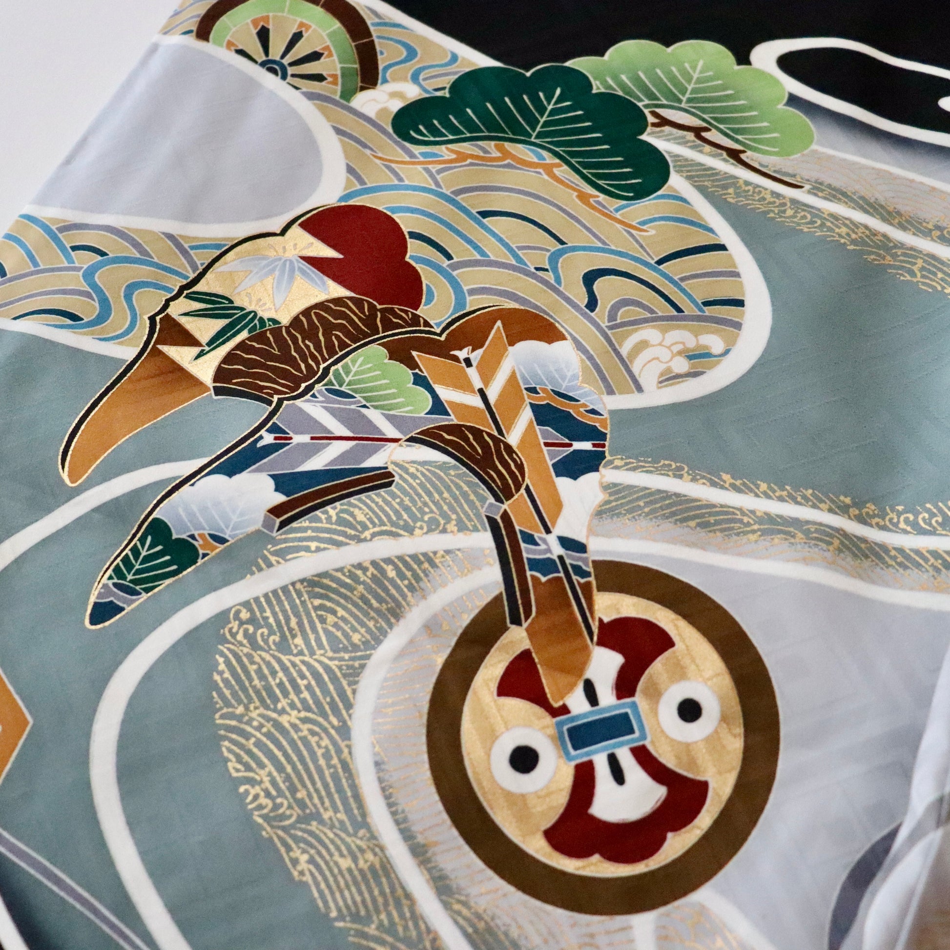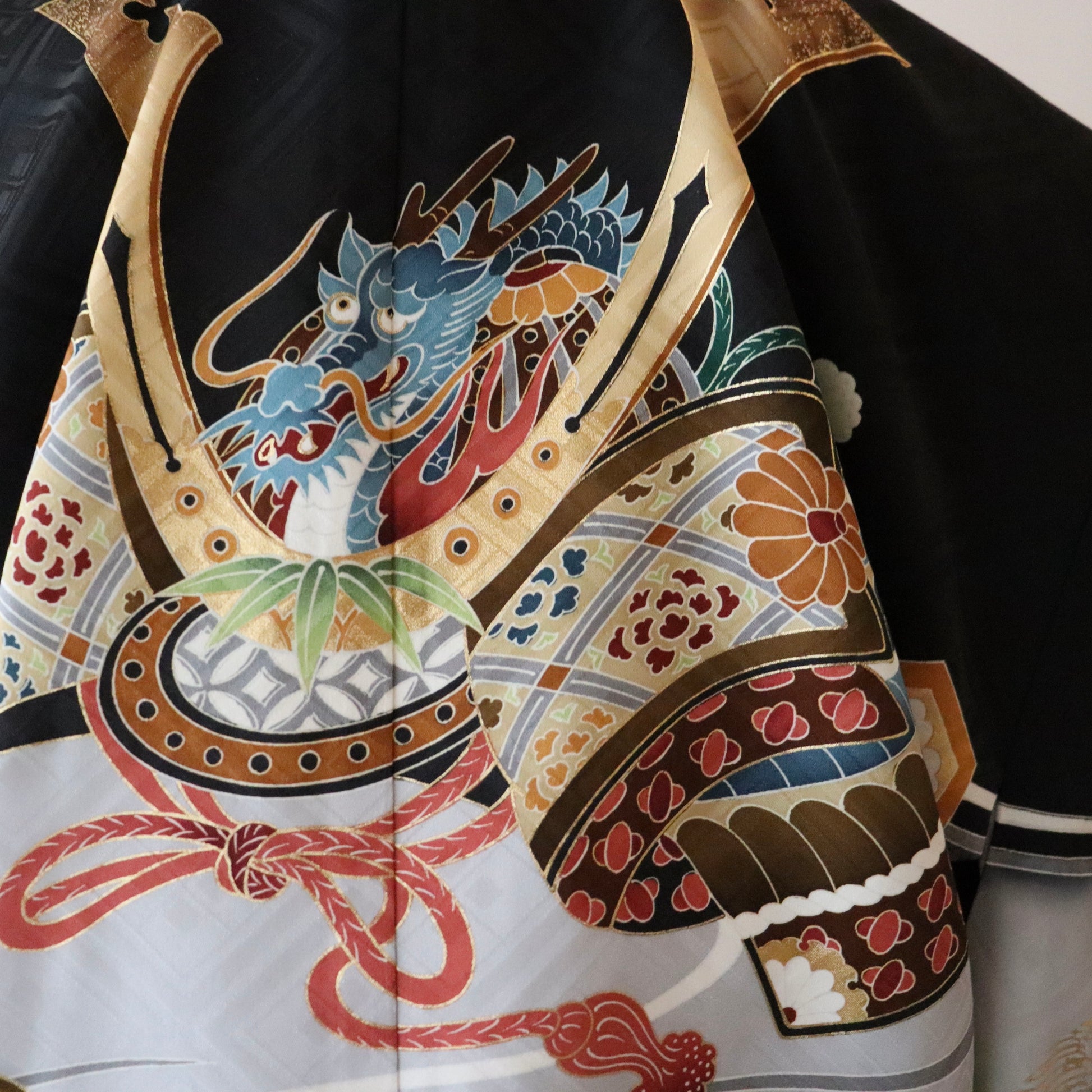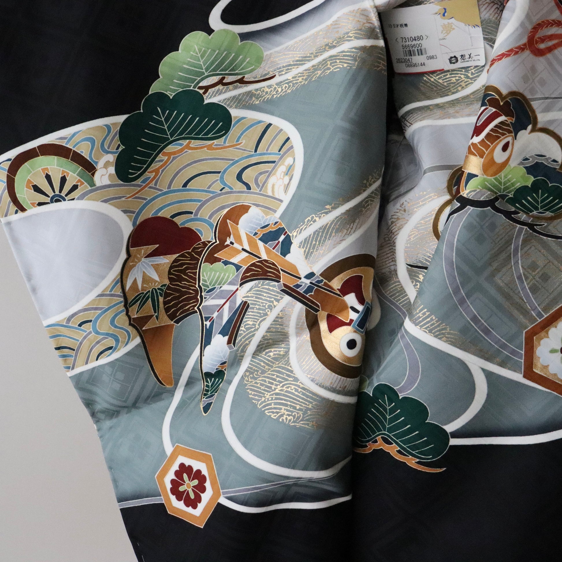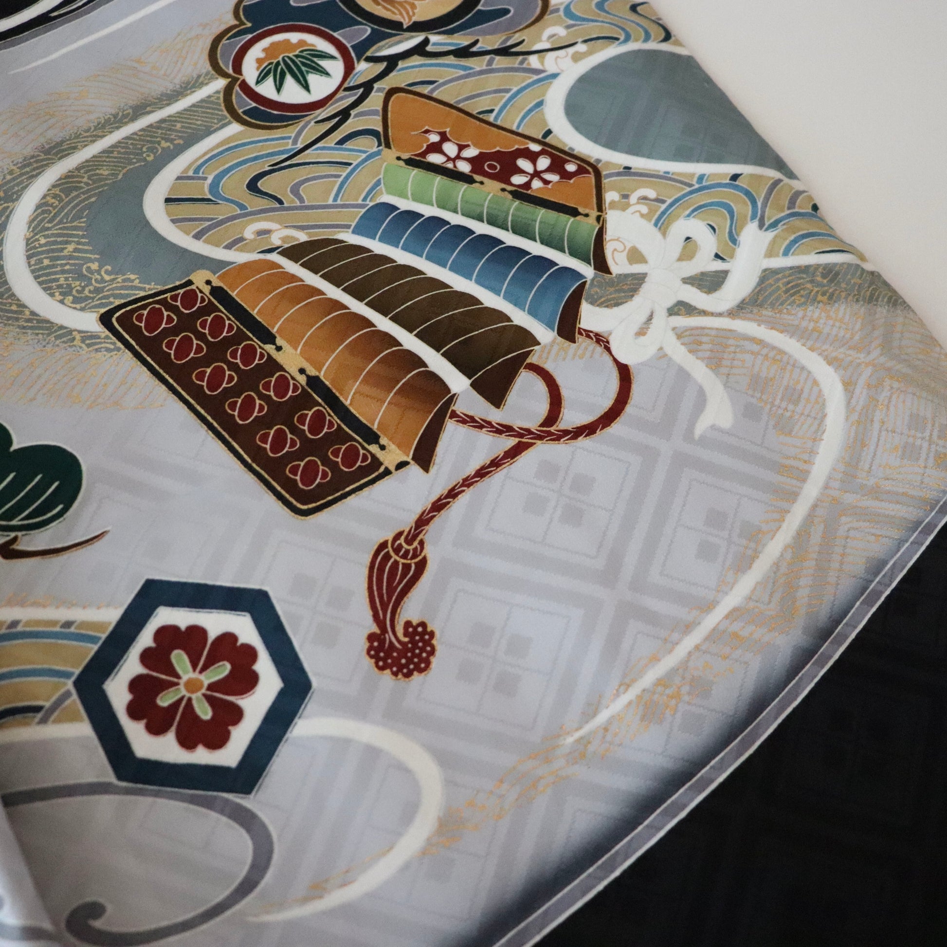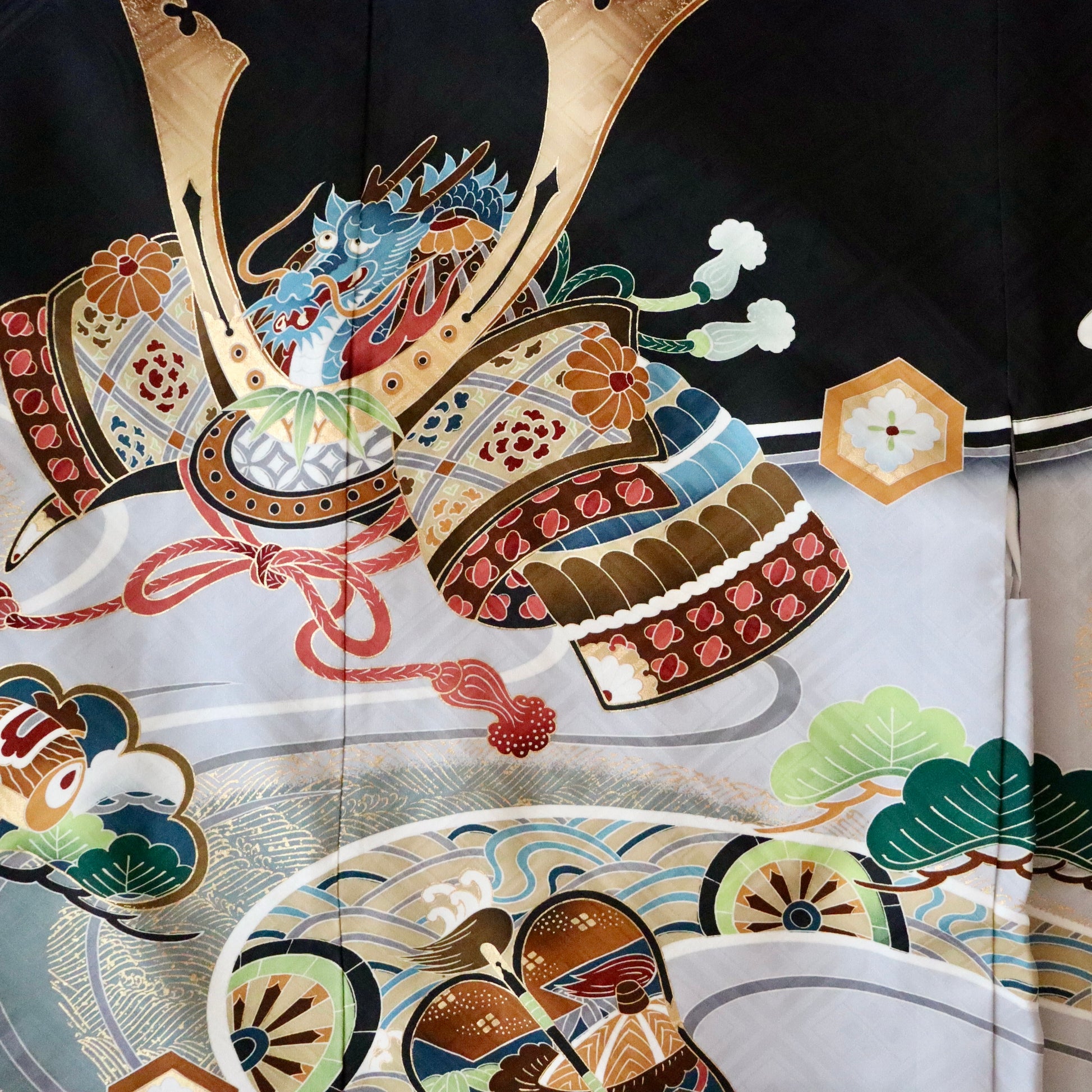 男児祝着の定番「兜」を基調に「軍配」「鞍」を描いた本作。それら勇壮な柄を各所に配した「松」が格調高くまとめた見事な柄付。大切なご子息の幸せを願う親御様の想いが詰め込まれた御祝着セットです。