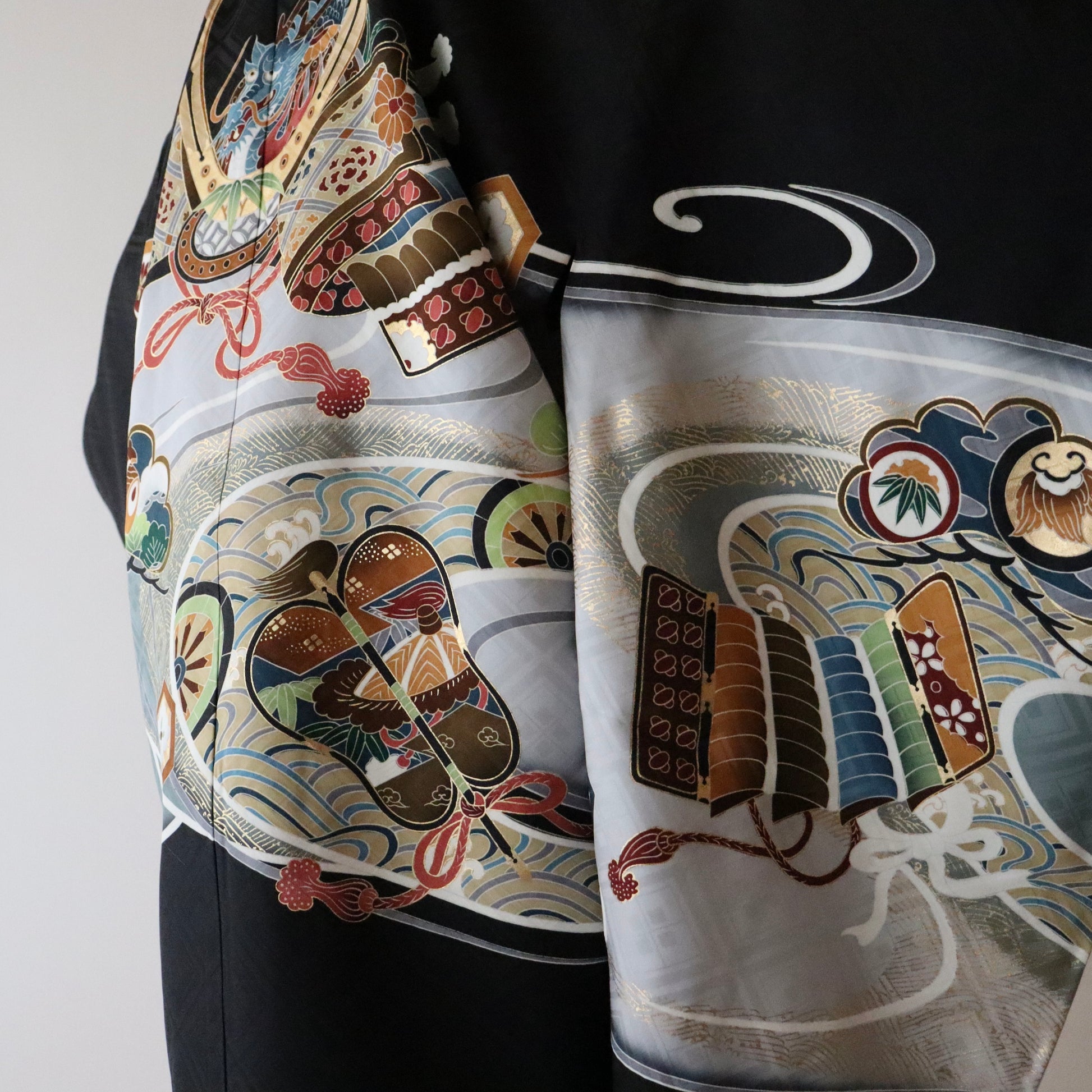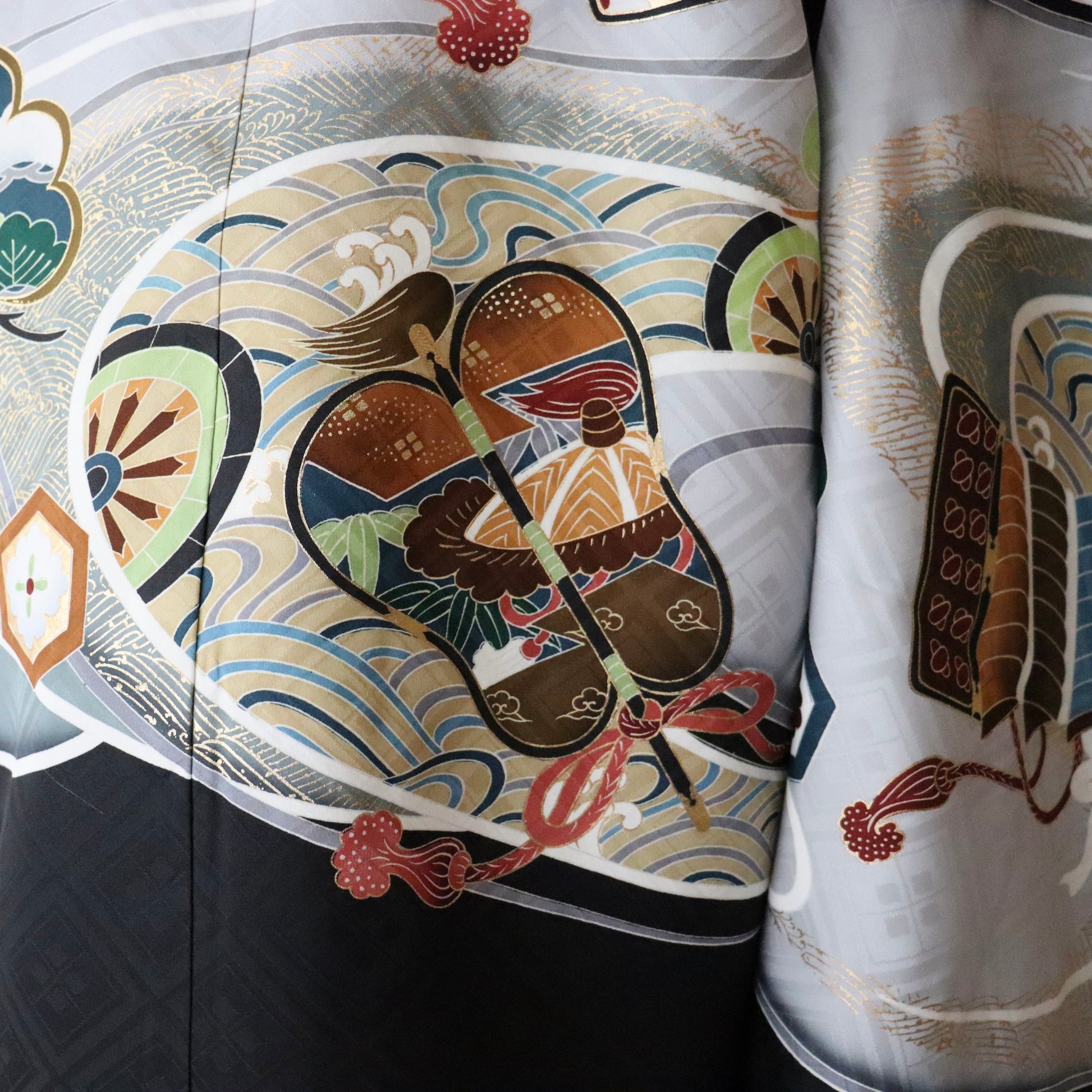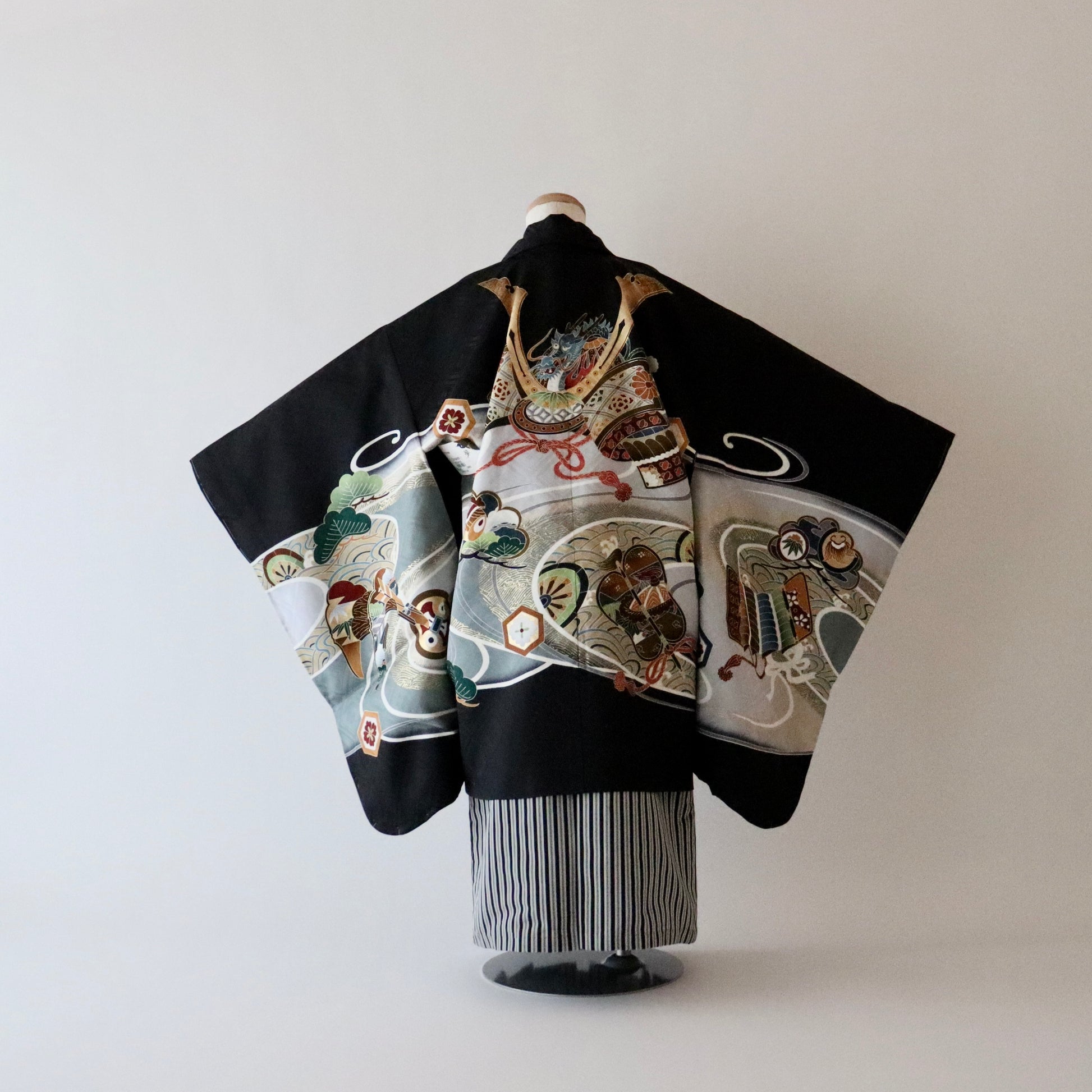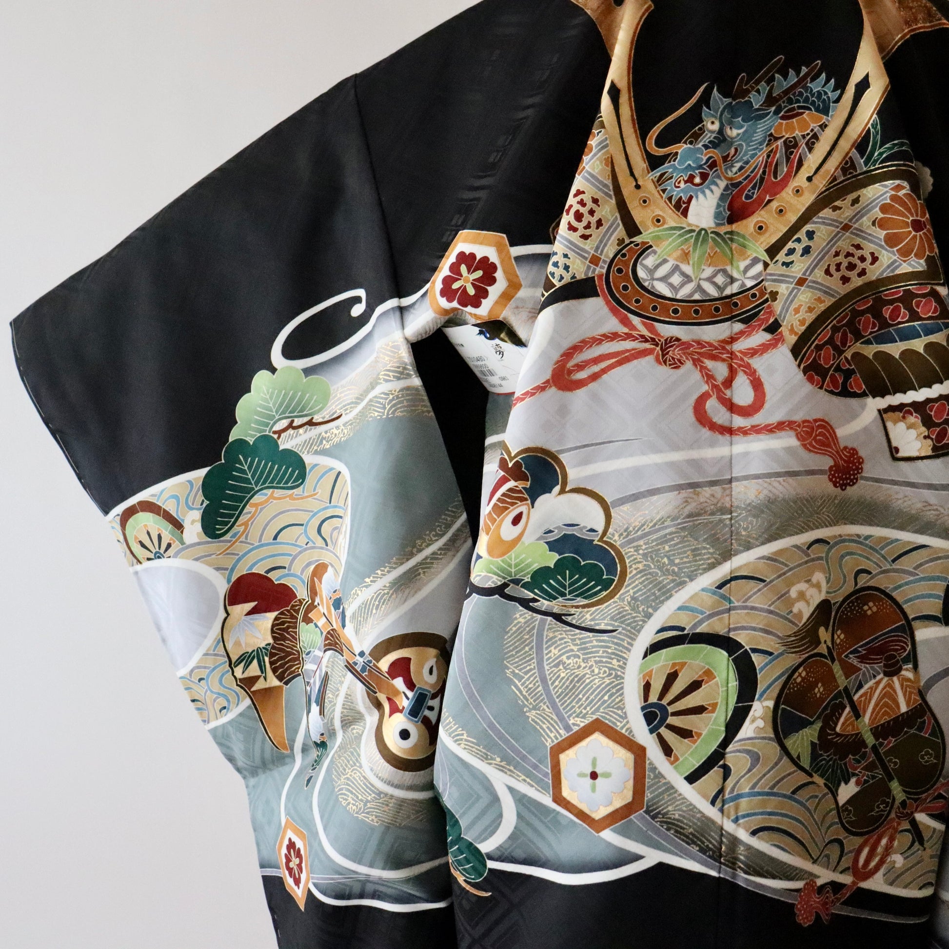 男児祝着の定番「兜」を基調に「軍配」「鞍」を描いた本作。それら勇壮な柄を各所に配した「松」が格調高くまとめた見事な柄付。大切なご子息の幸せを願う親御様の想いが詰め込まれた御祝着セットです。