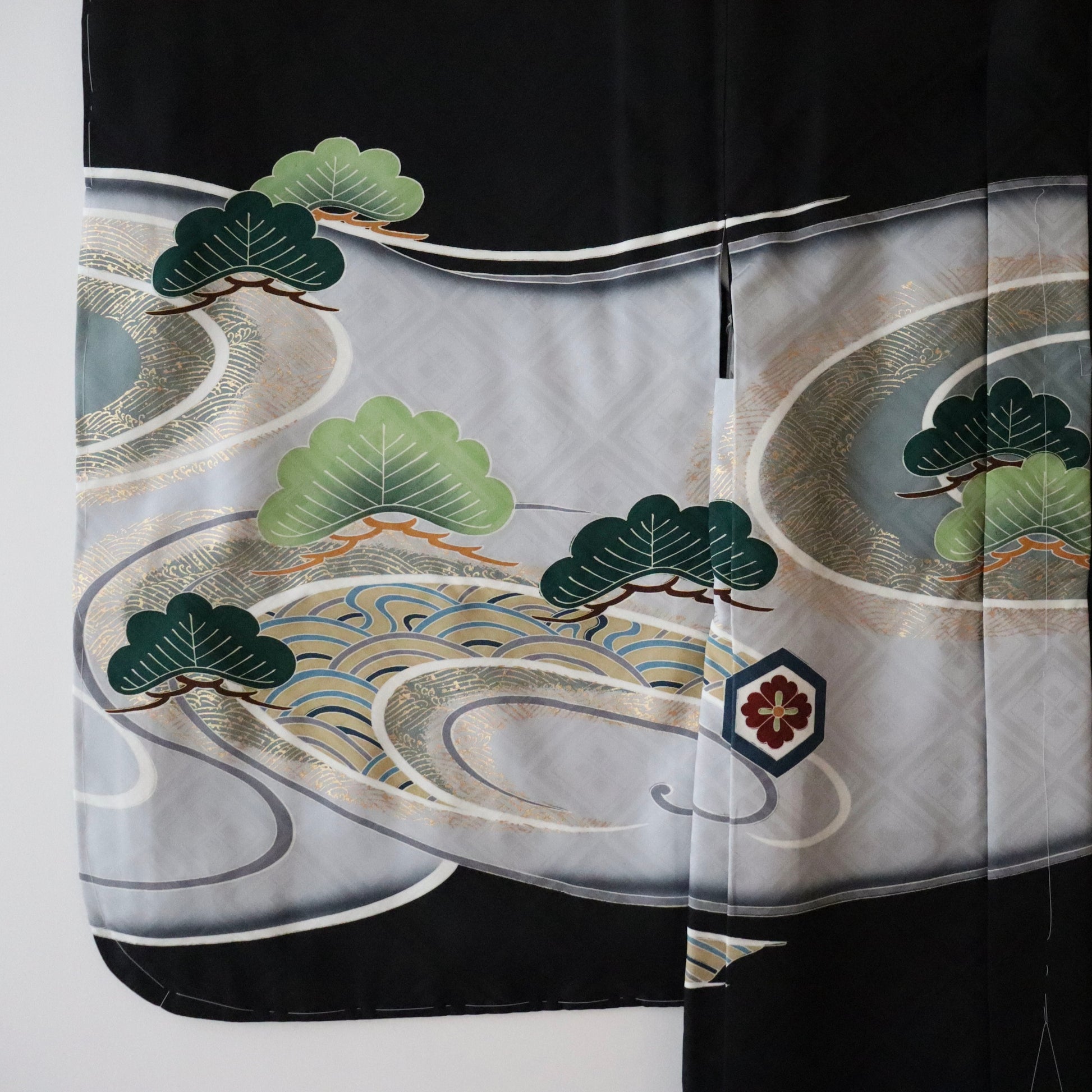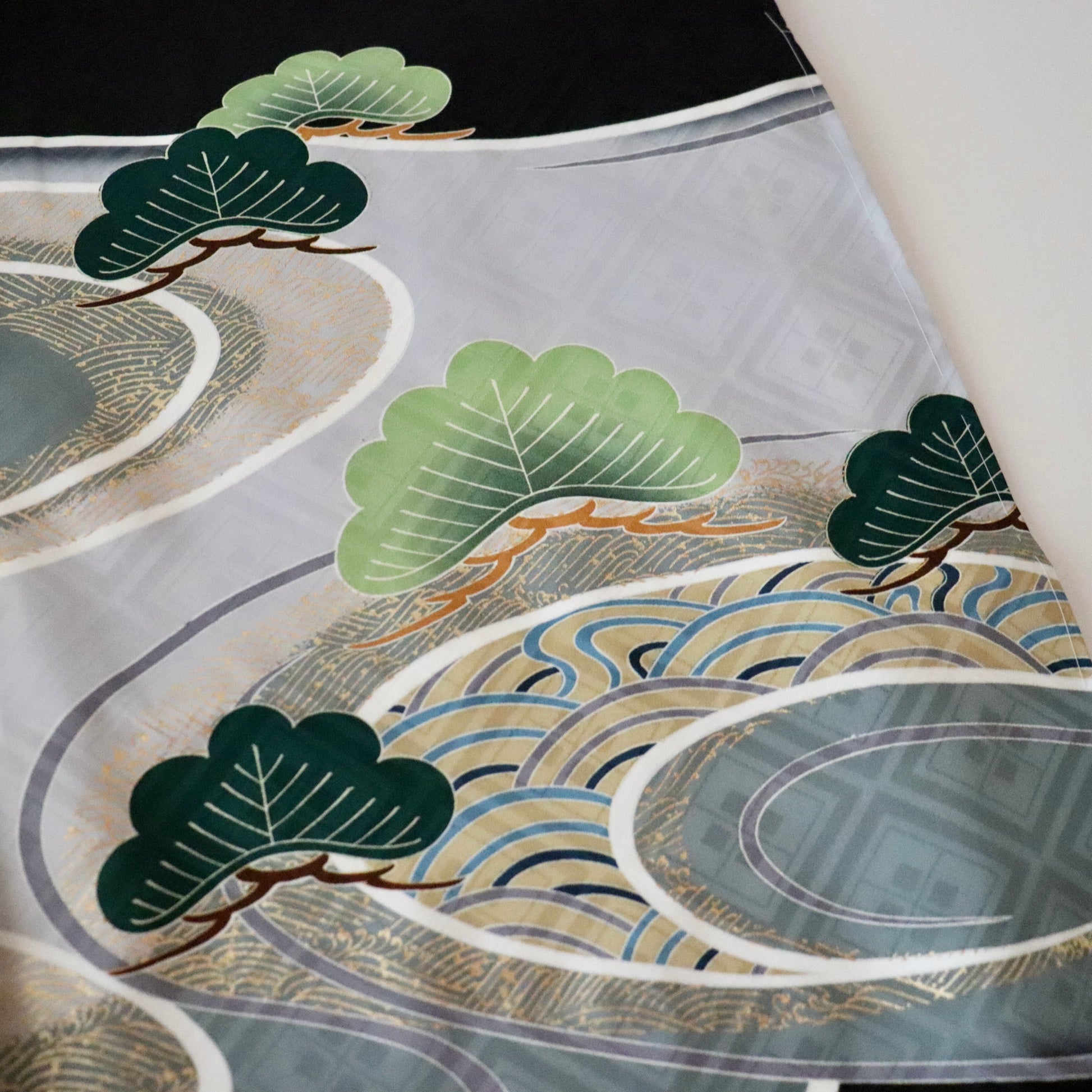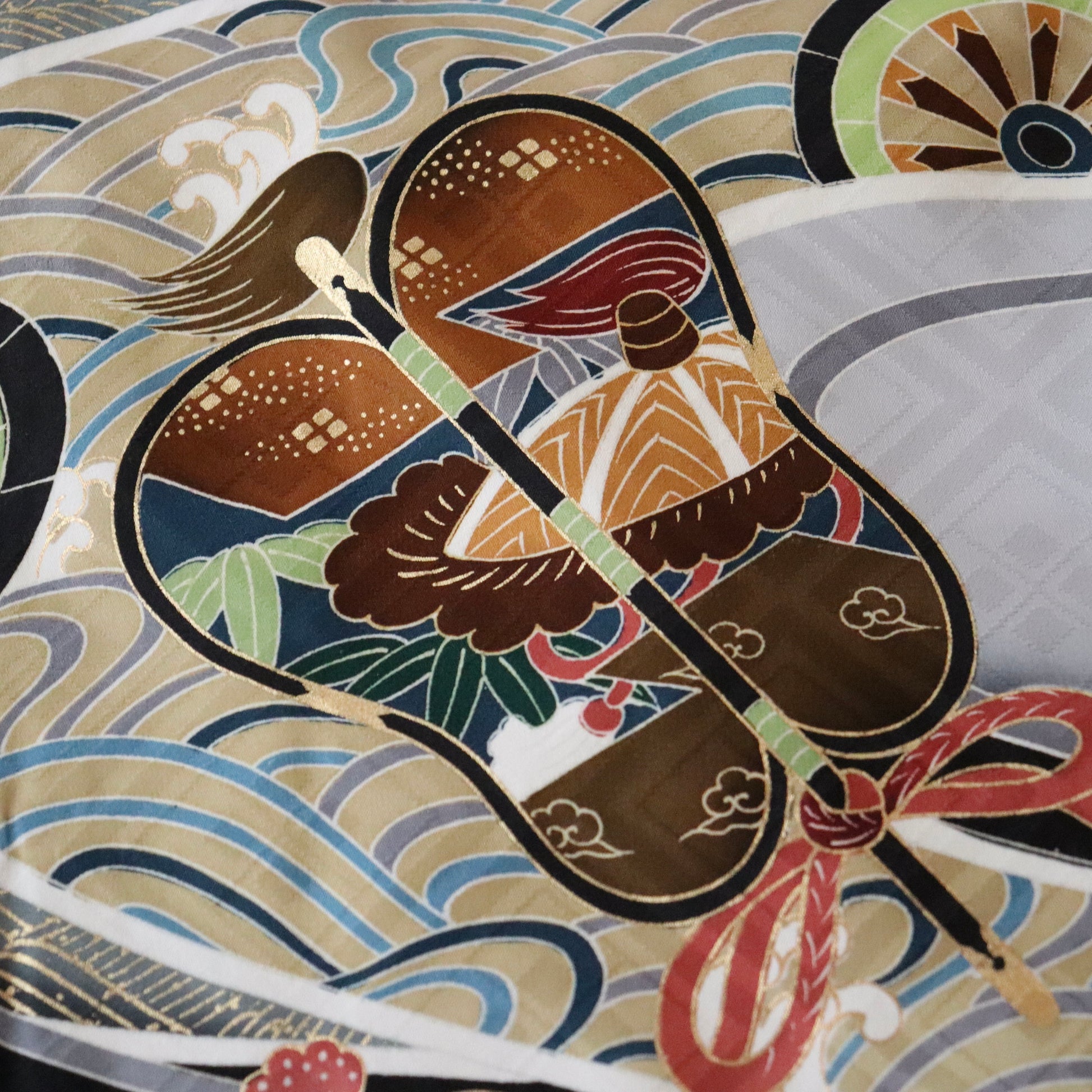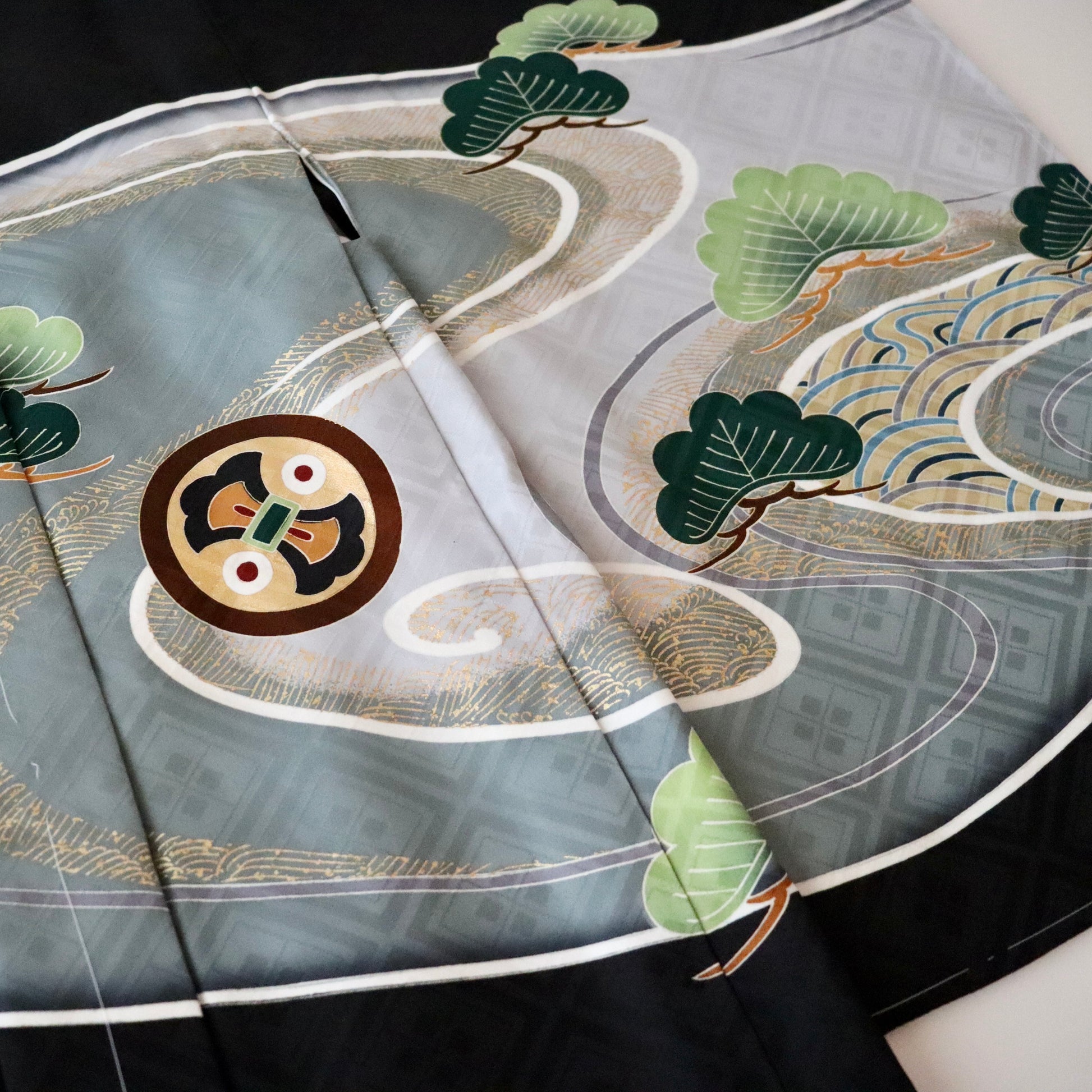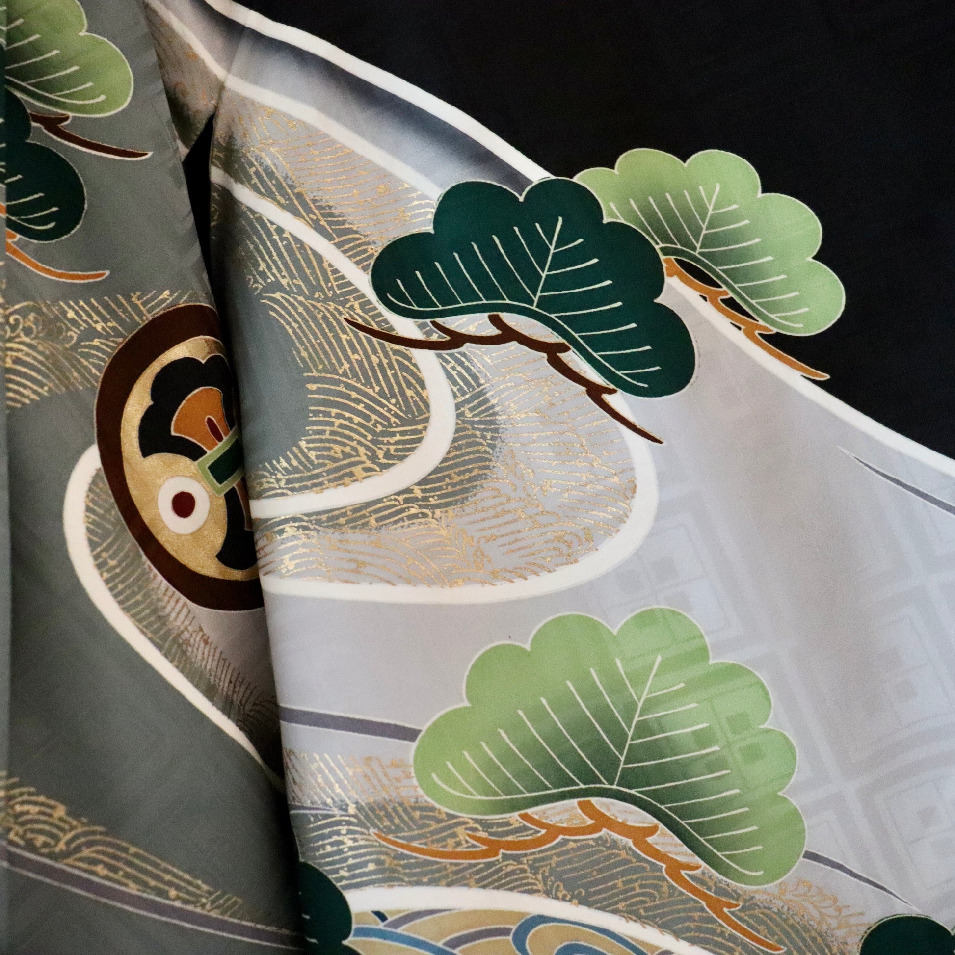 男児祝着の定番「兜」を基調に「軍配」「鞍」を描いた本作。それら勇壮な柄を各所に配した「松」が格調高くまとめた見事な柄付。大切なご子息の幸せを願う親御様の想いが詰め込まれた御祝着セットです。