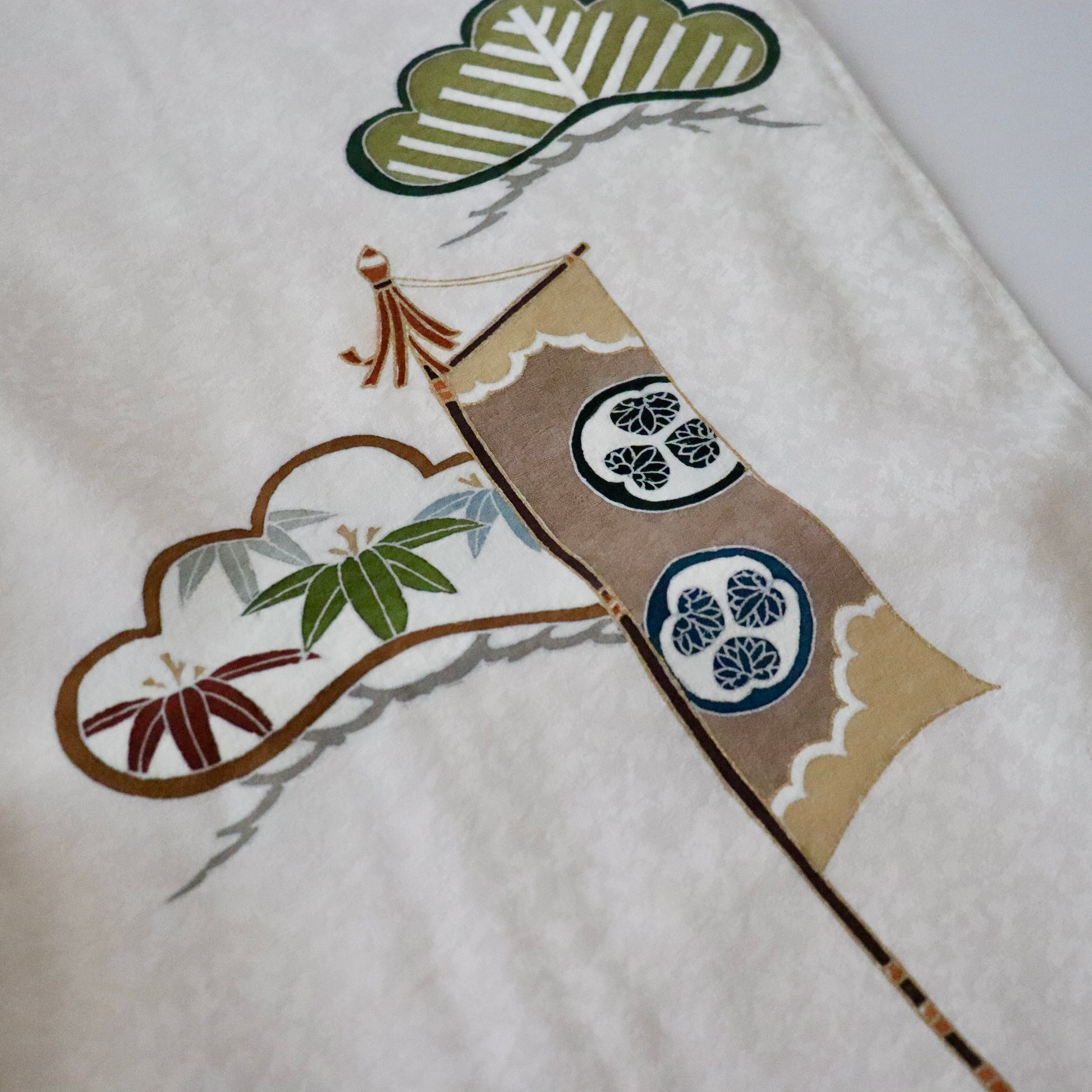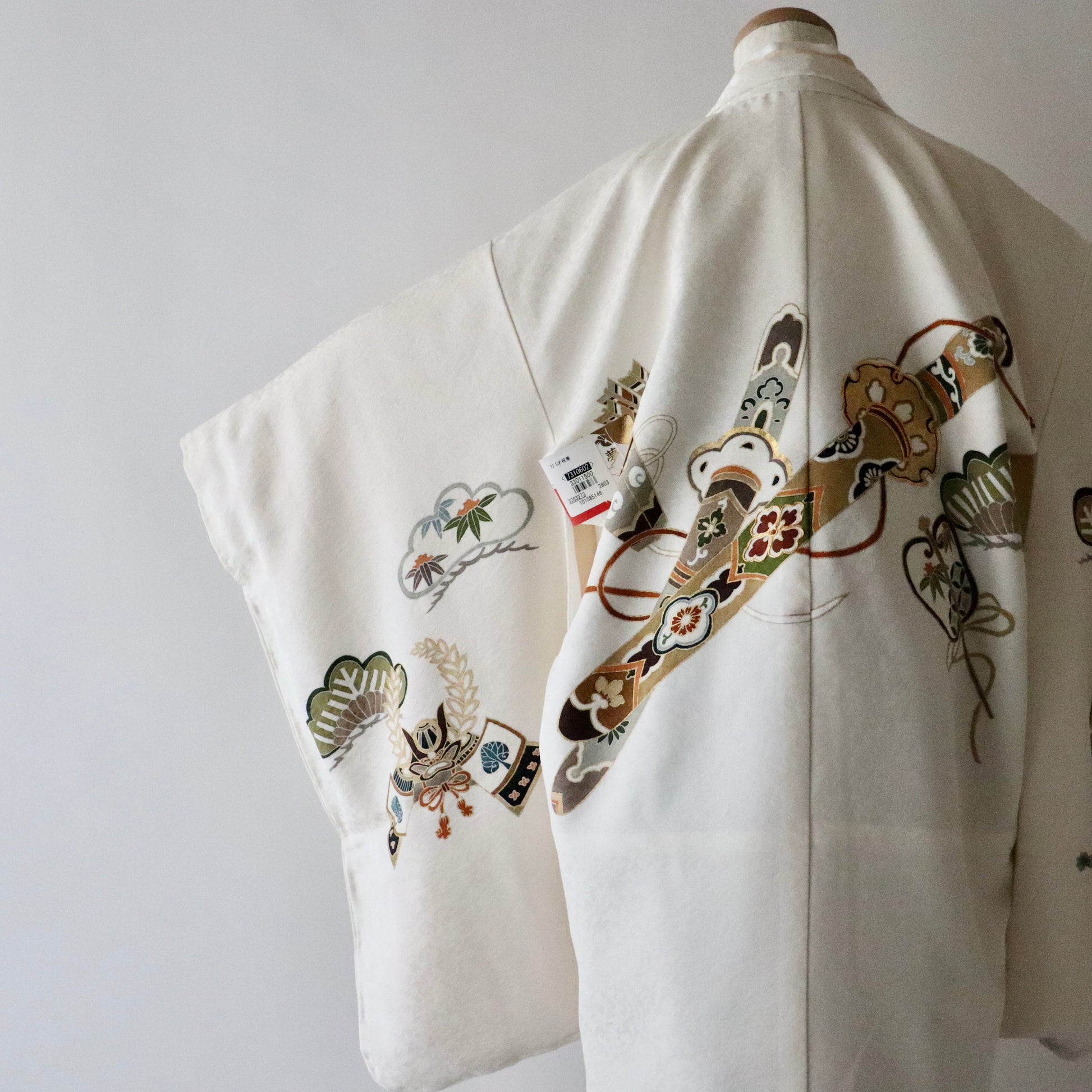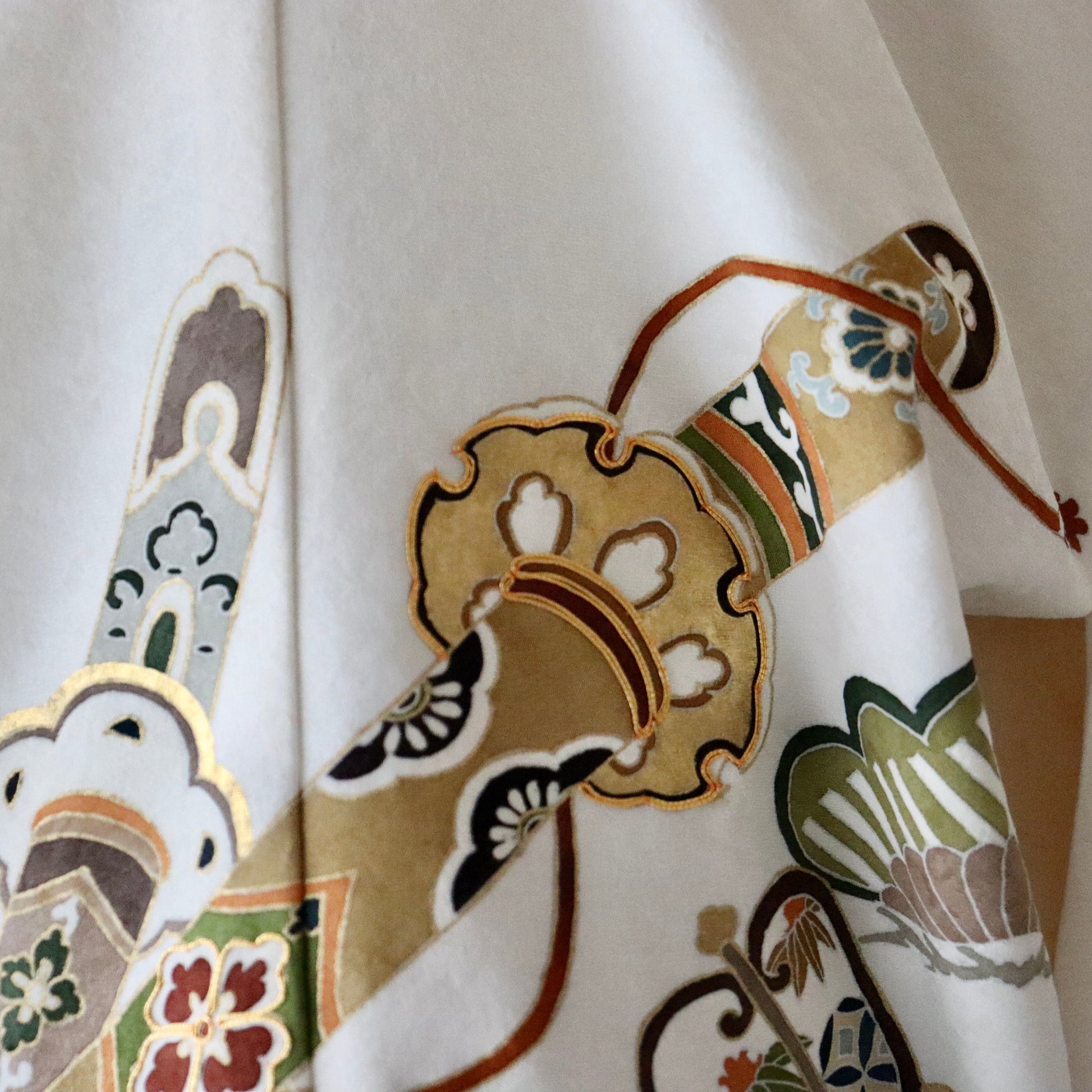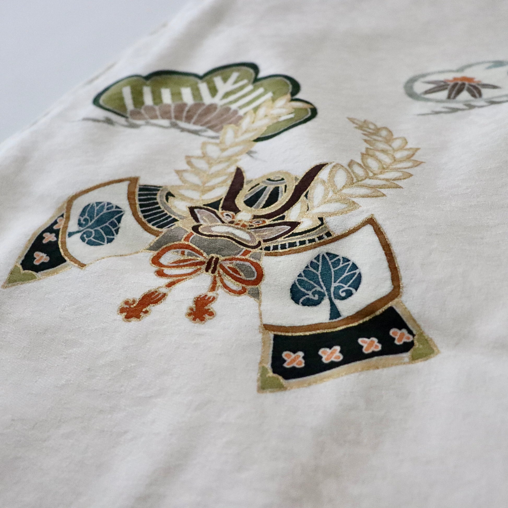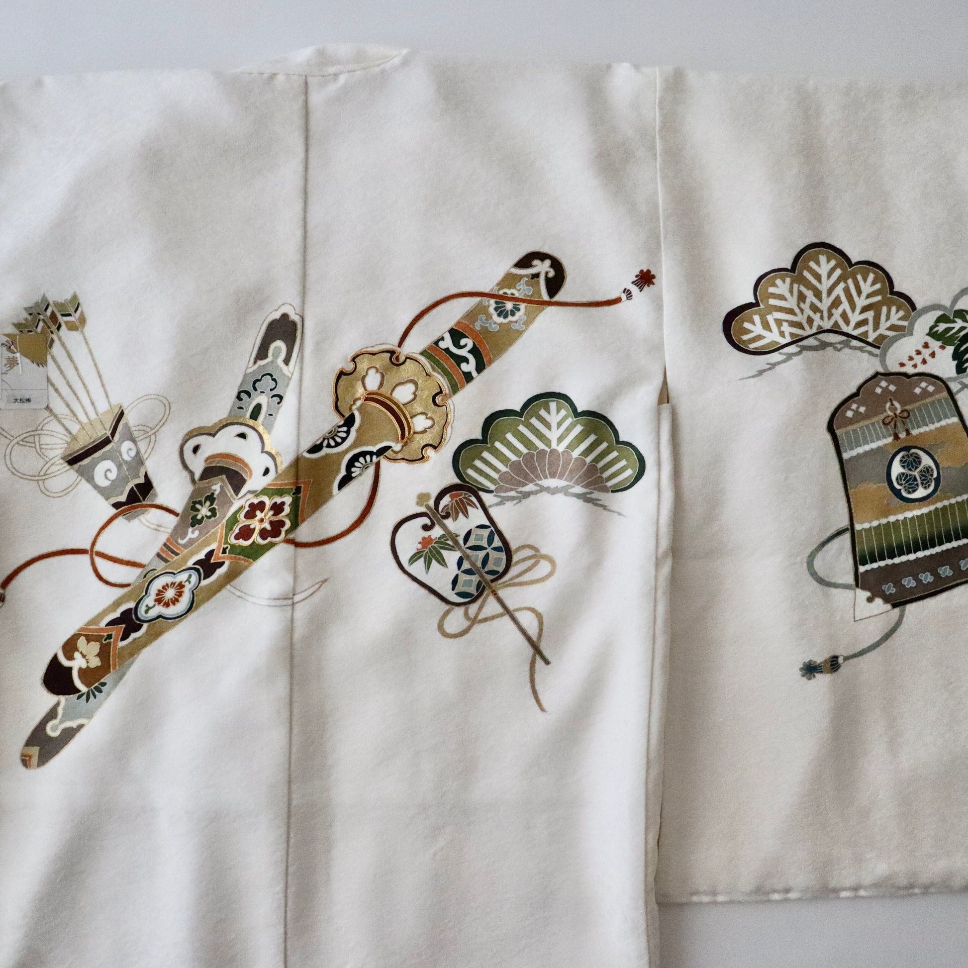 鞘に美しい装飾がほどこされた刀を基調に、兜や軍配などの武具を勇壮に染め描いた本作。象牙色の着物に白い羽織と色彩コントラストも美しく凛とした佇まいの仕上がり。手描き友禅ならではの品格も漂う逸品です。