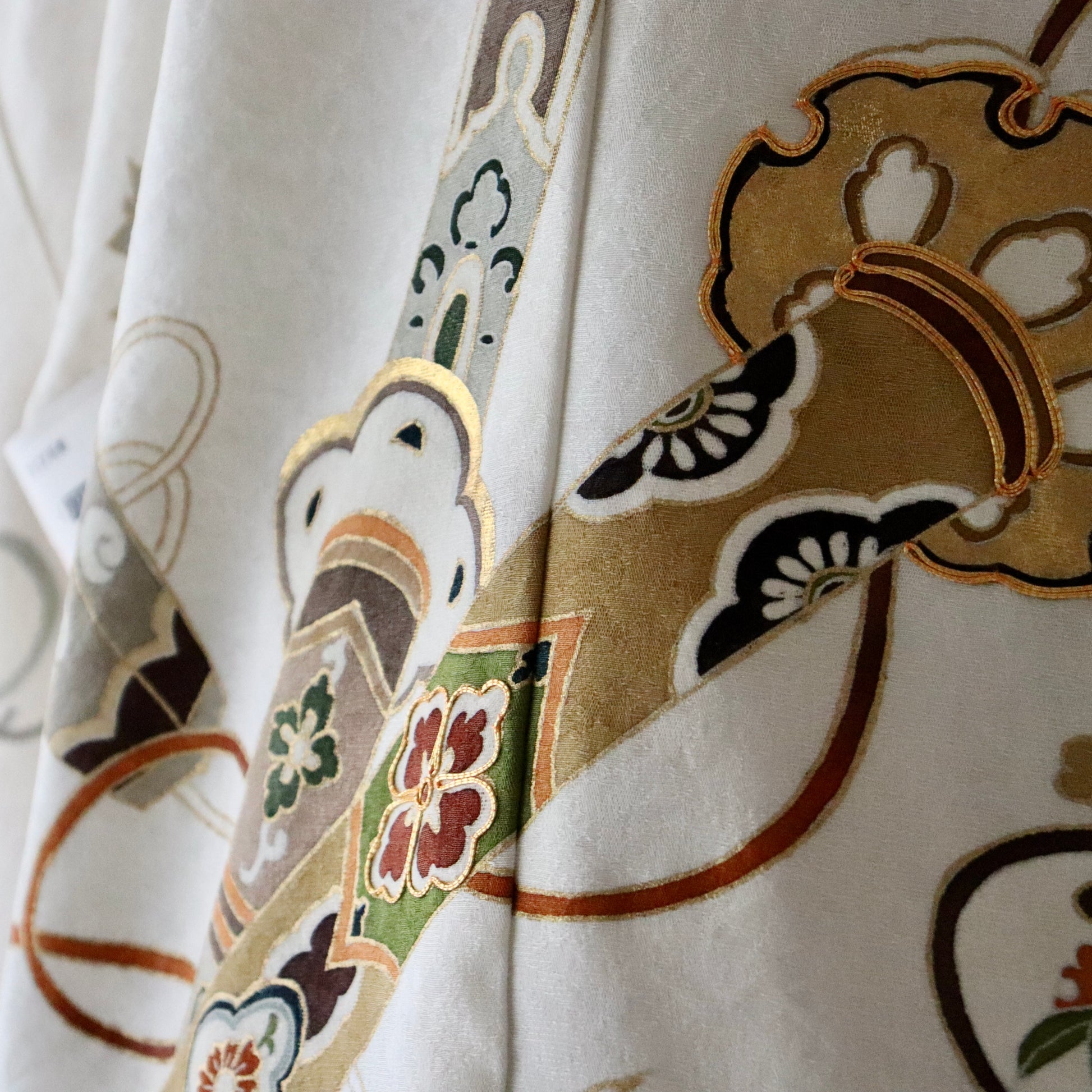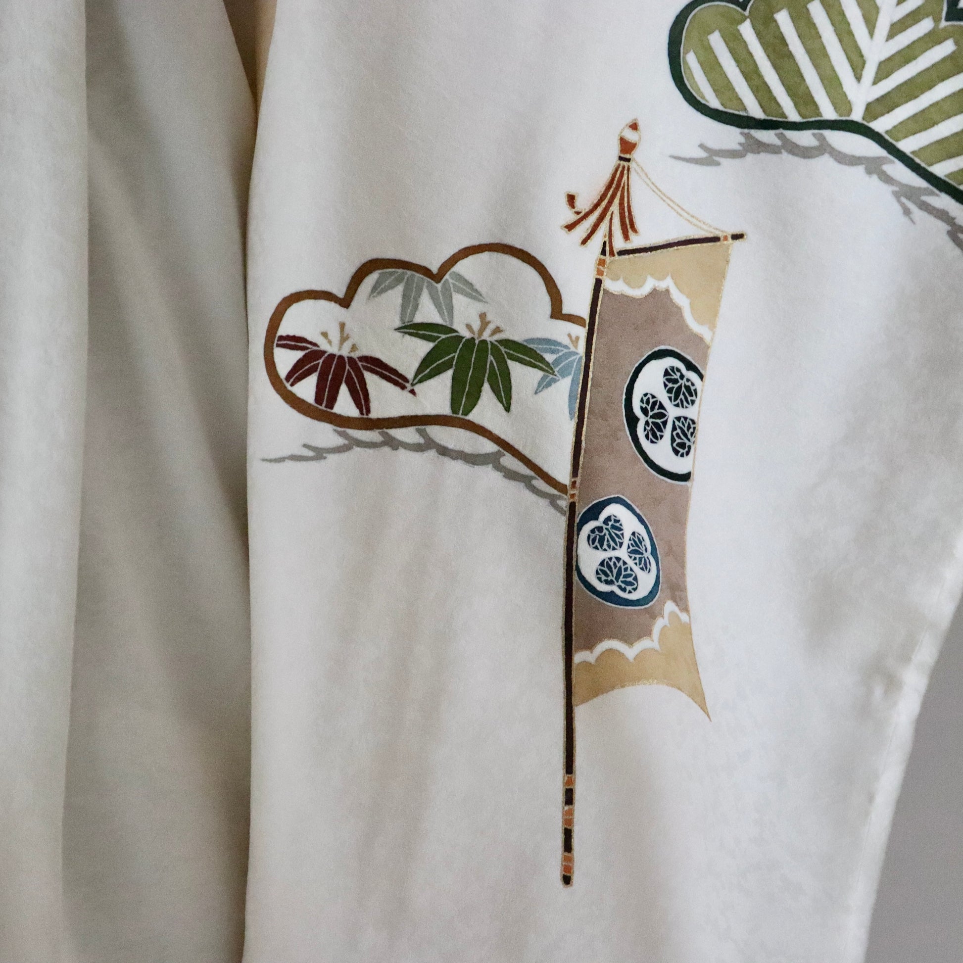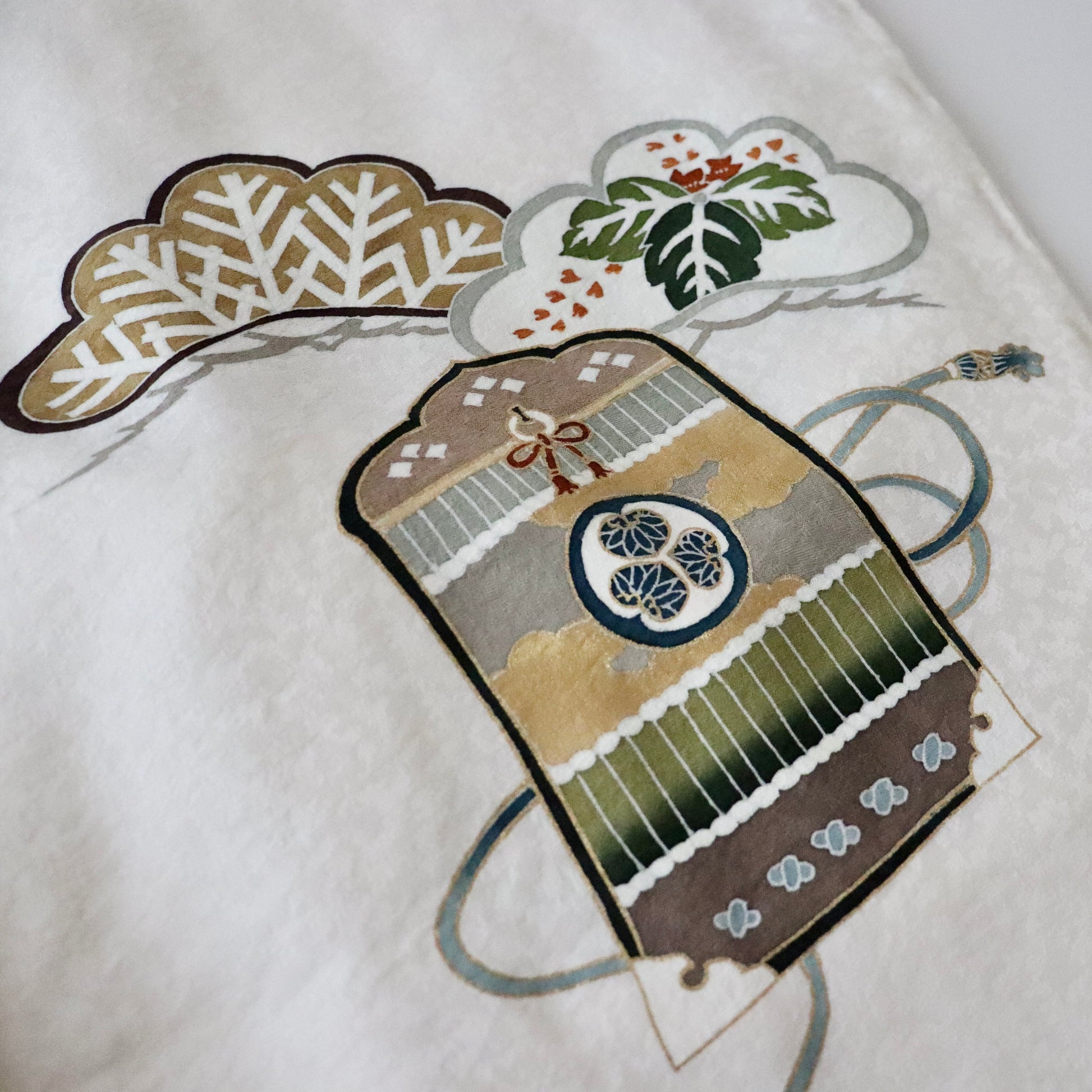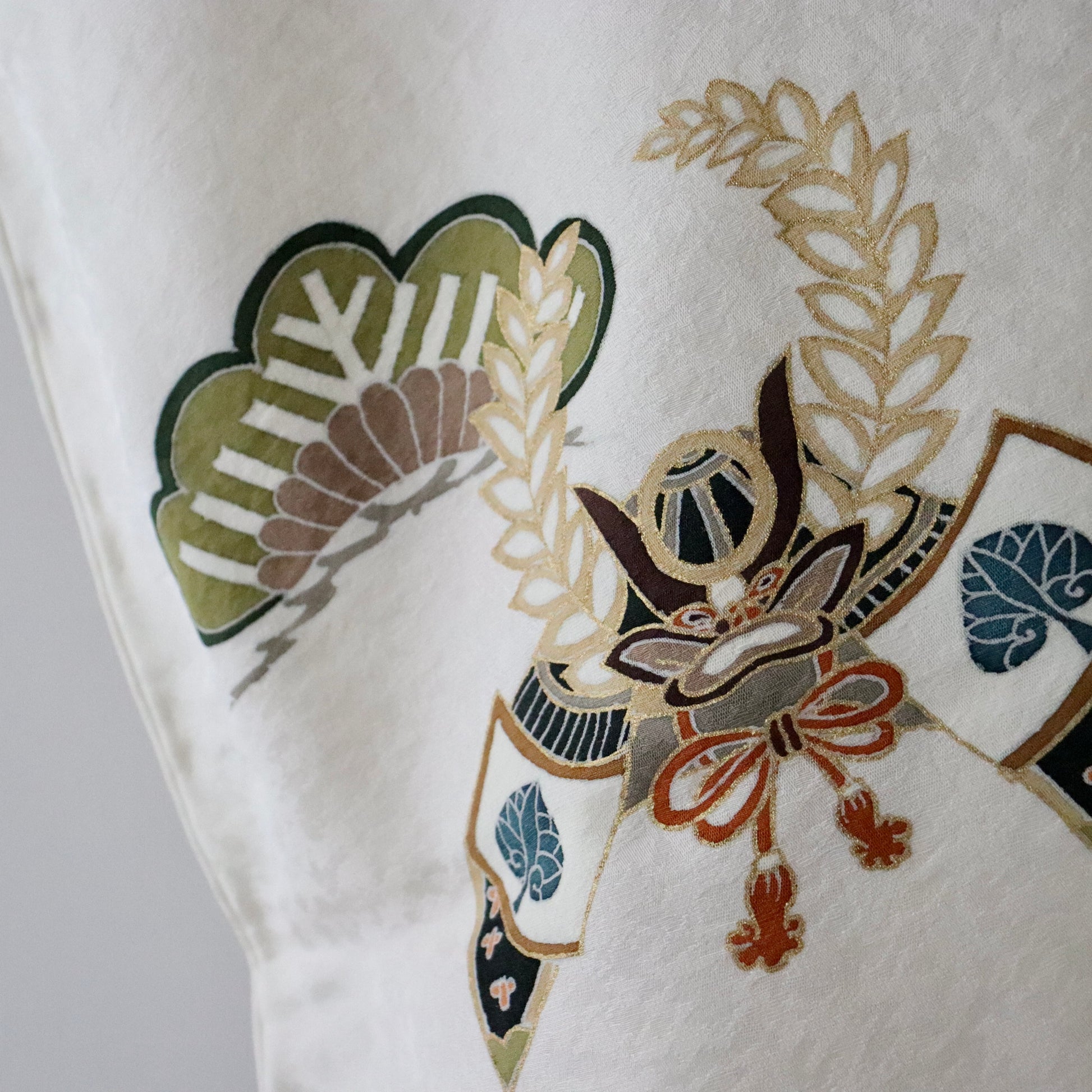 鞘に美しい装飾がほどこされた刀を基調に、兜や軍配などの武具を勇壮に染め描いた本作。象牙色の着物に白い羽織と色彩コントラストも美しく凛とした佇まいの仕上がり。手描き友禅ならではの品格も漂う逸品です。