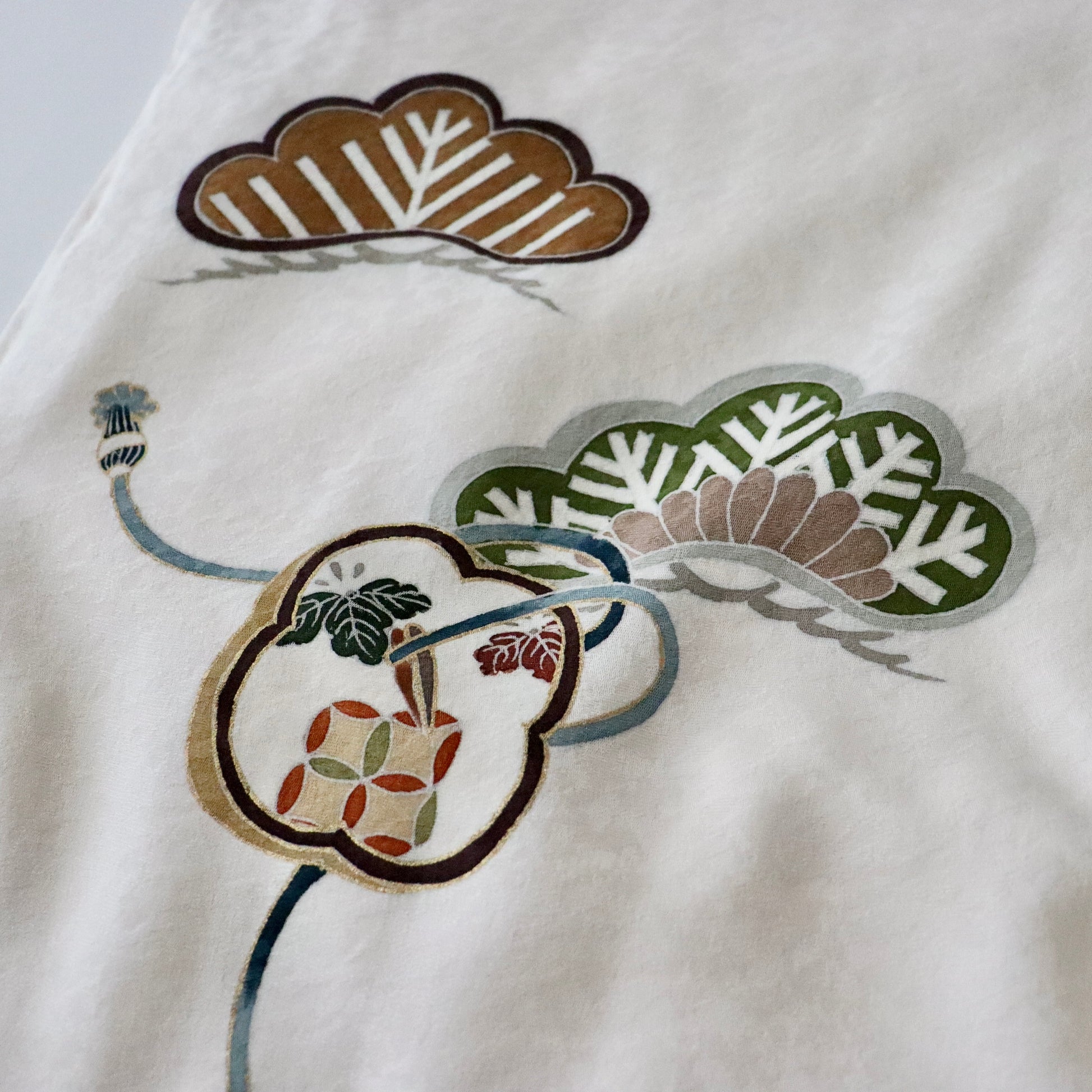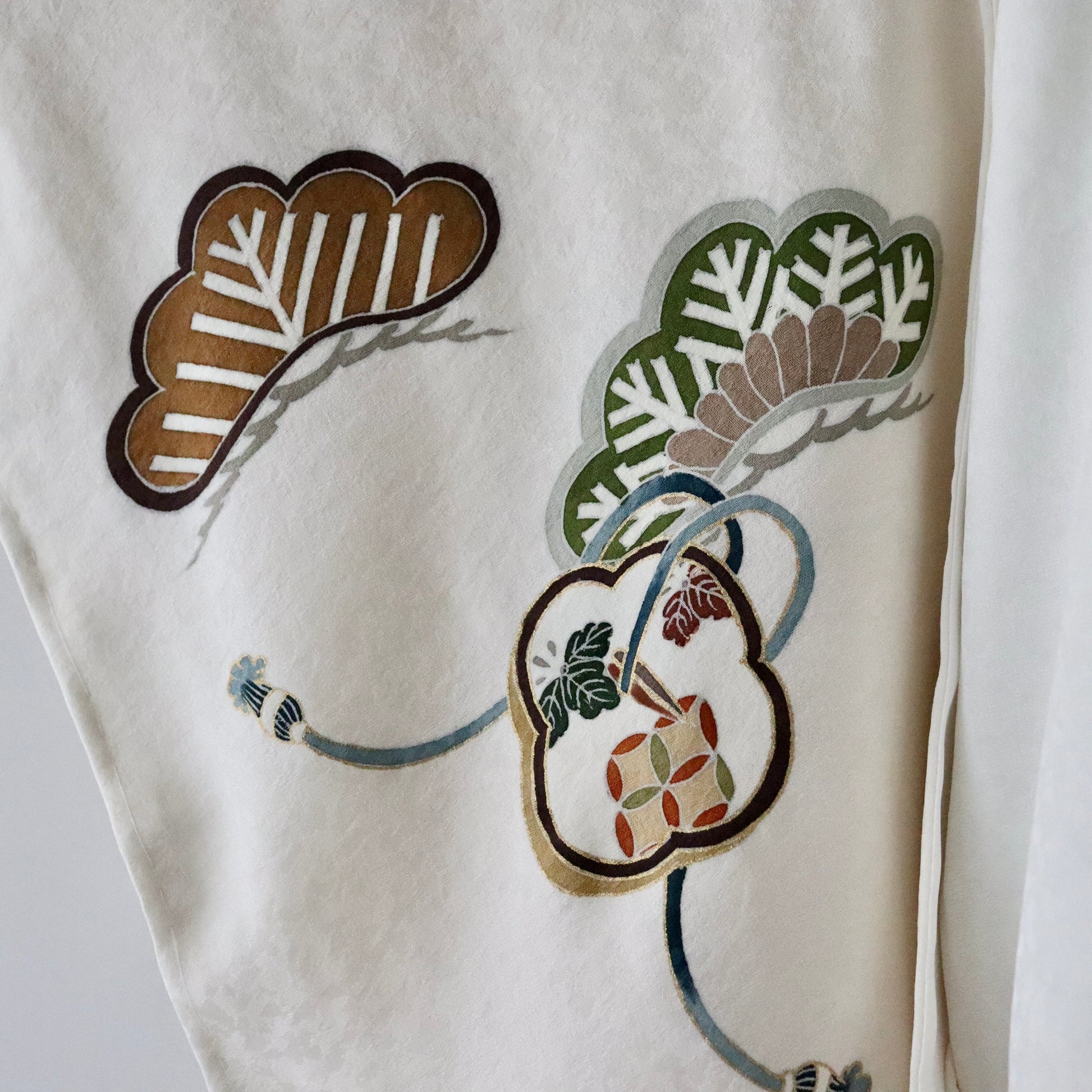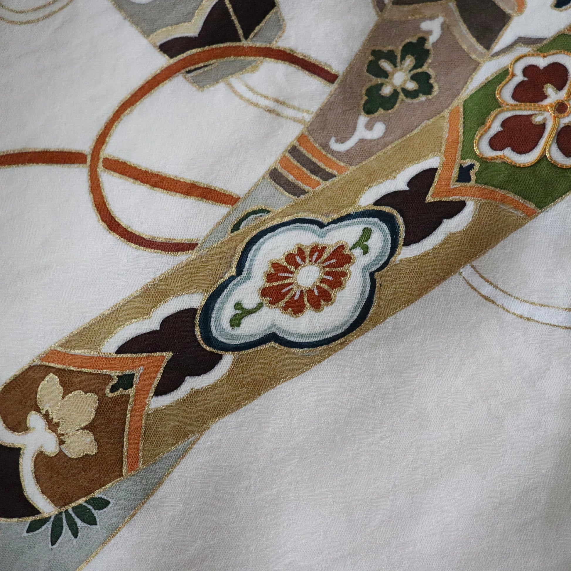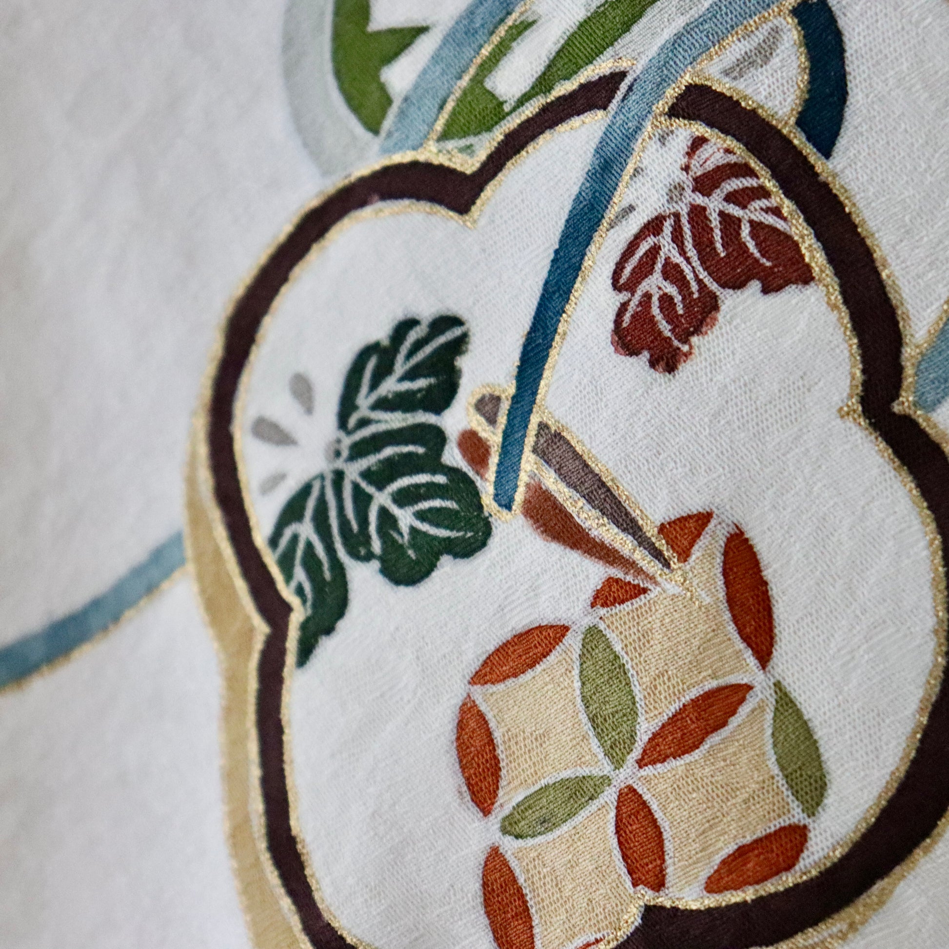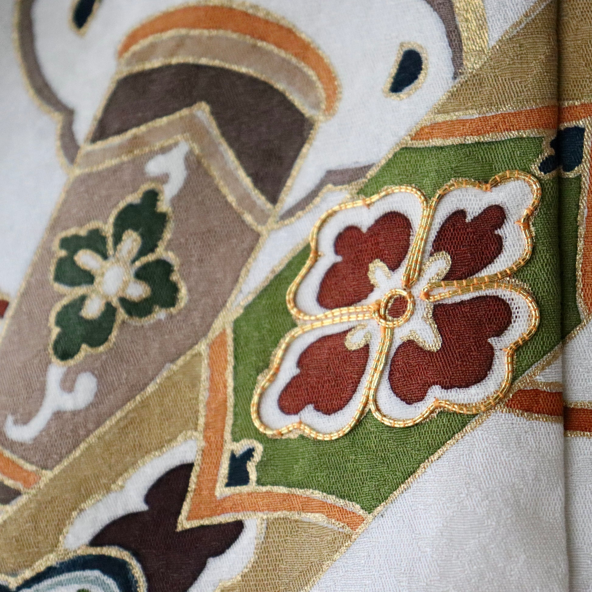 鞘に美しい装飾がほどこされた刀を基調に、兜や軍配などの武具を勇壮に染め描いた本作。象牙色の着物に白い羽織と色彩コントラストも美しく凛とした佇まいの仕上がり。手描き友禅ならではの品格も漂う逸品です。