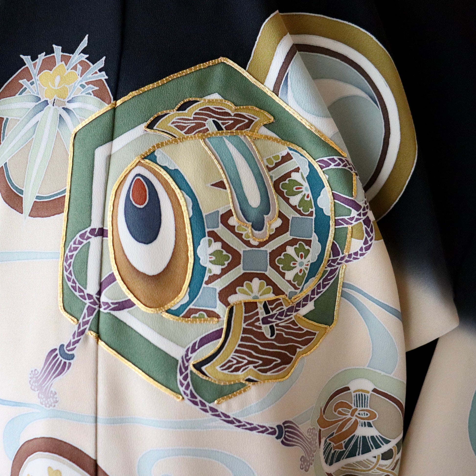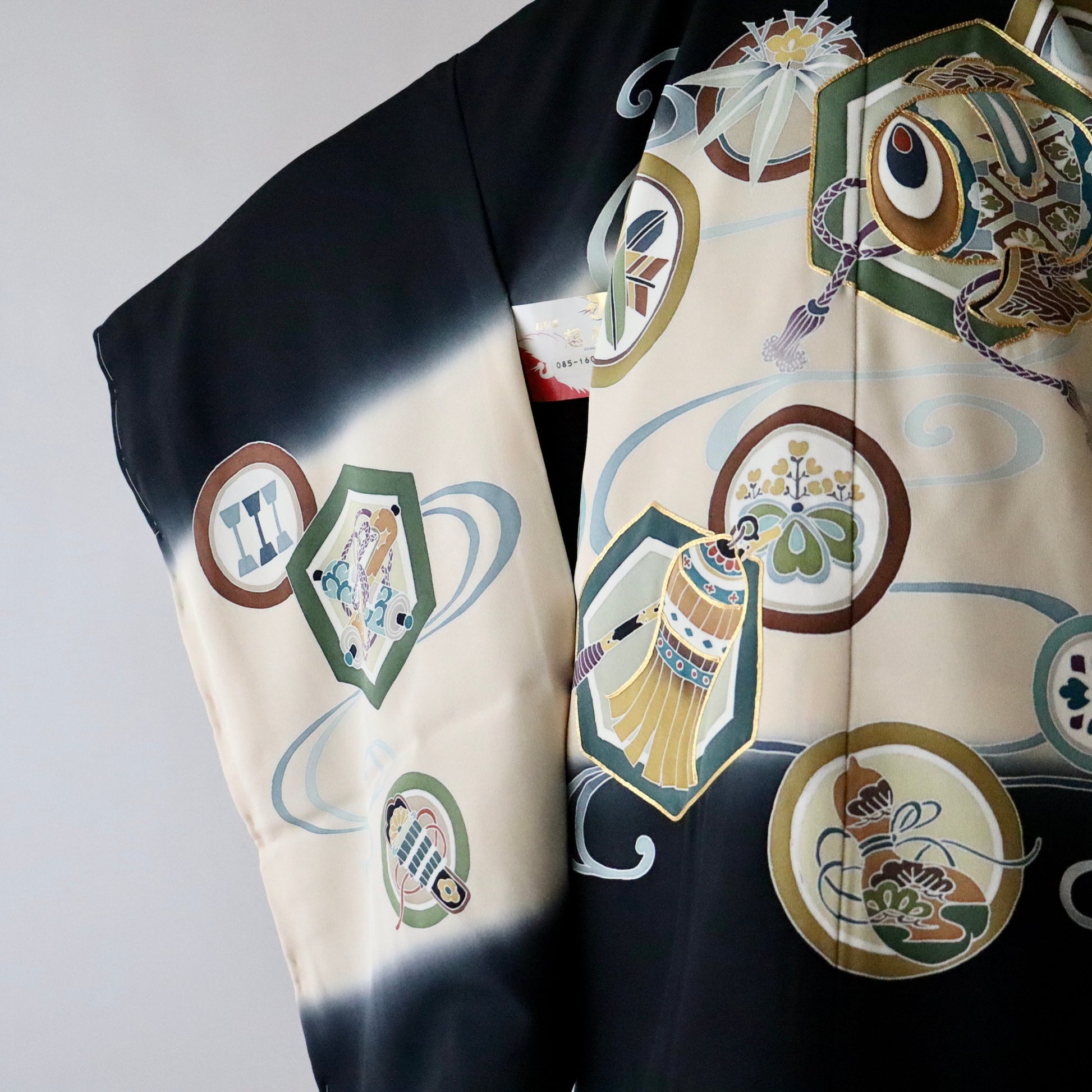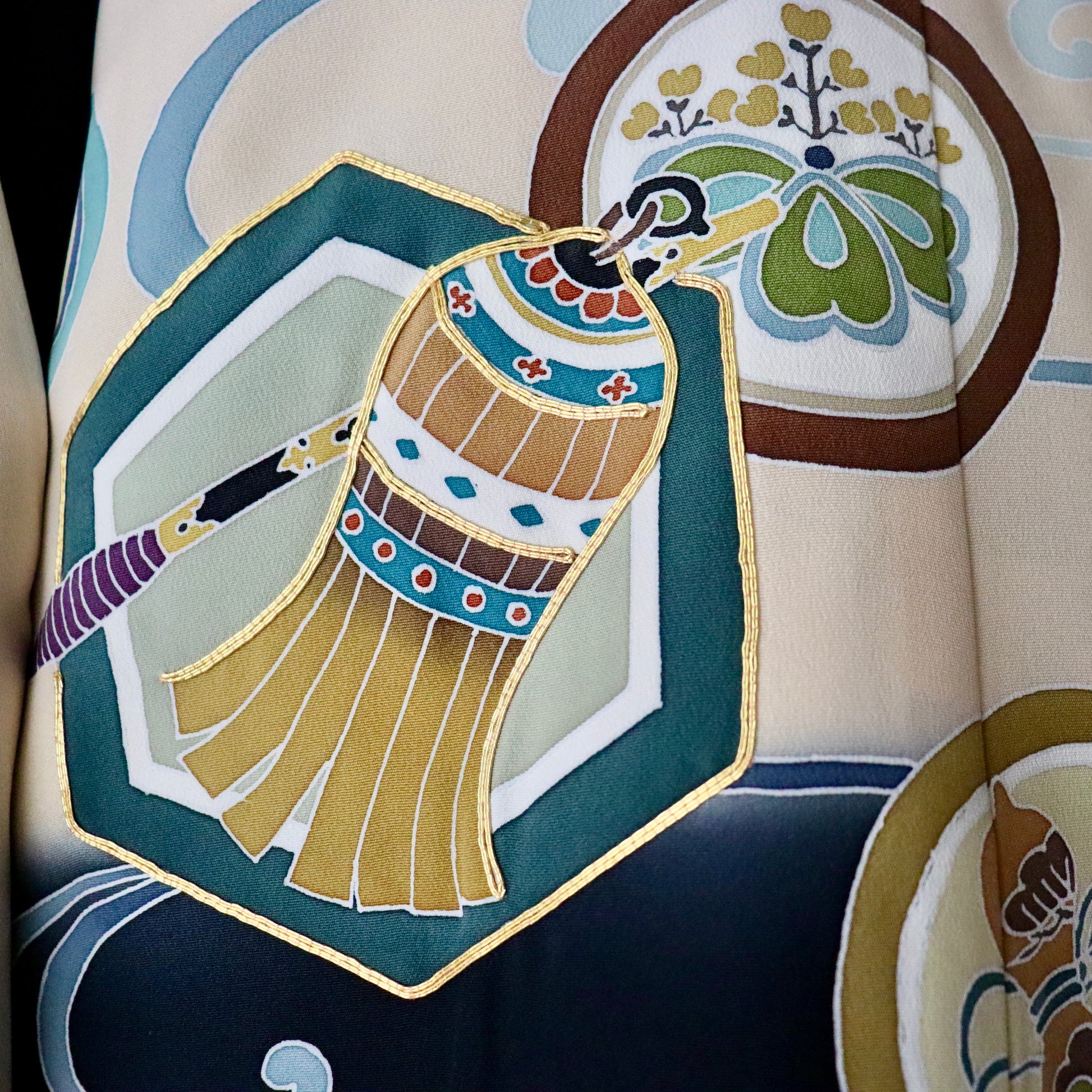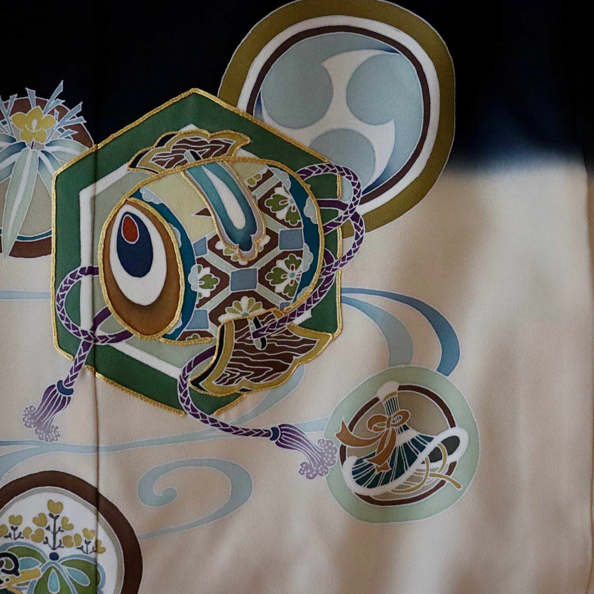 古典的柄構図「熨斗目」に小槌や瓢箪の「亀甲文」「丸文」を御祝着らしく上品かつ可愛げに染め描いた本作。手描き友禅による美しい柄描写と色彩、そして品のある金彩。男児の御祝着らしい潔く凛とした印象が美事な御祝着セットです。