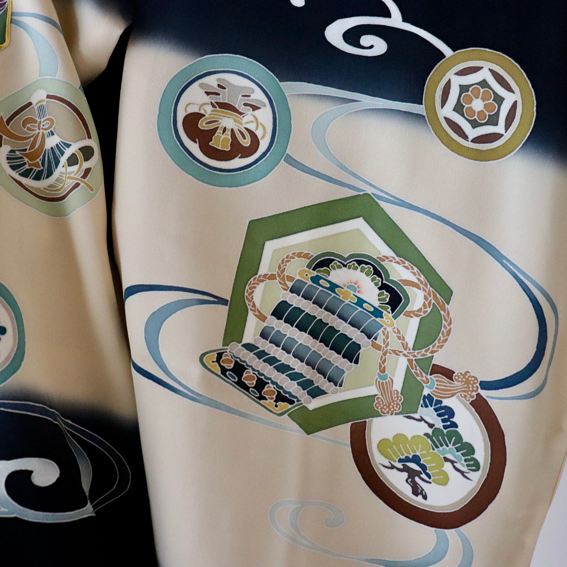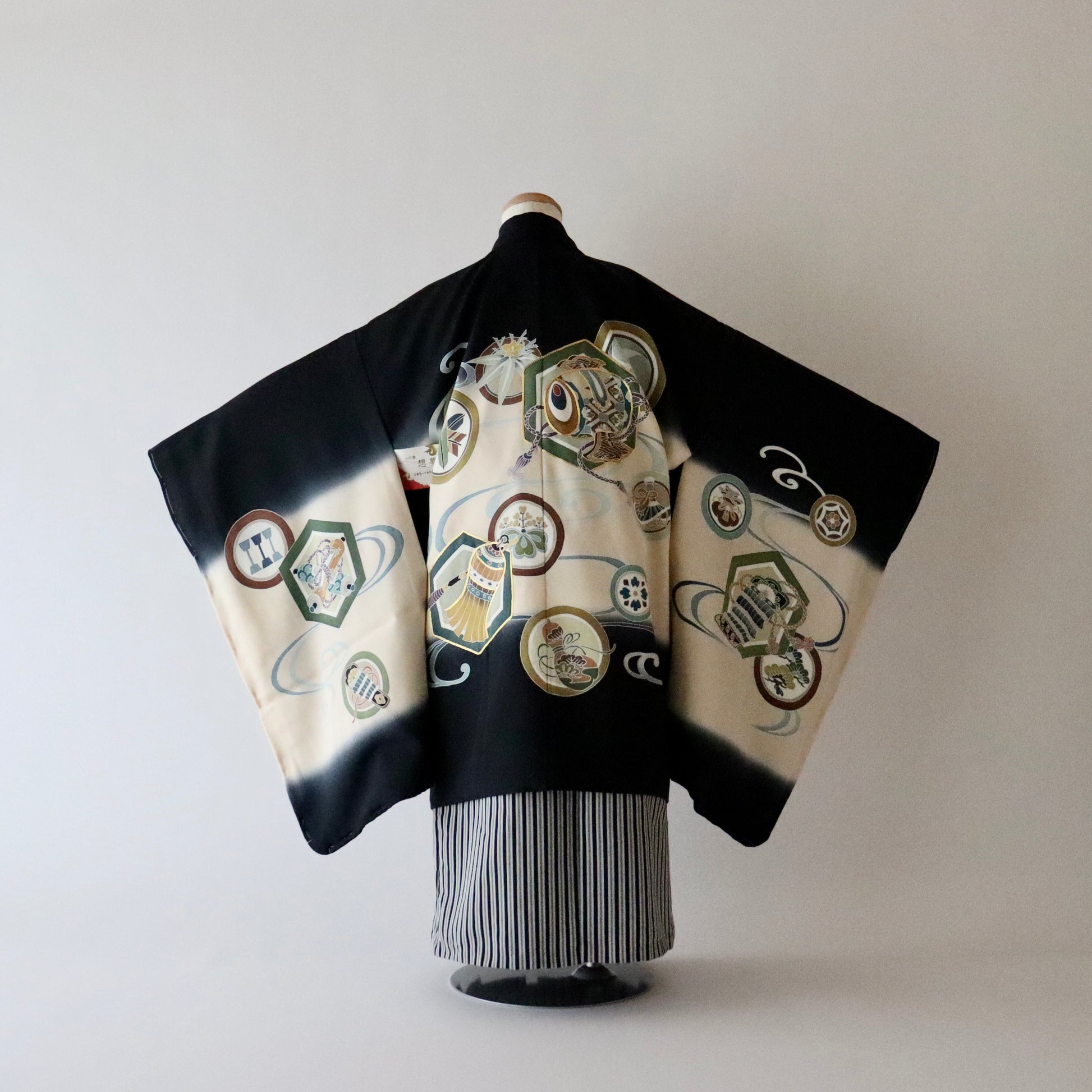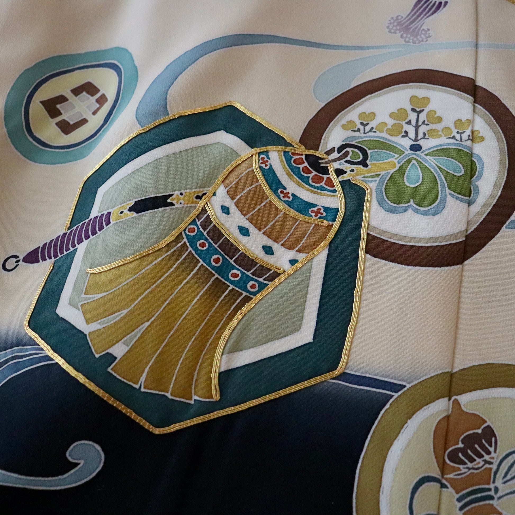 古典的柄構図「熨斗目」に小槌や瓢箪の「亀甲文」「丸文」を御祝着らしく上品かつ可愛げに染め描いた本作。手描き友禅による美しい柄描写と色彩、そして品のある金彩。男児の御祝着らしい潔く凛とした印象が美事な御祝着セットです。