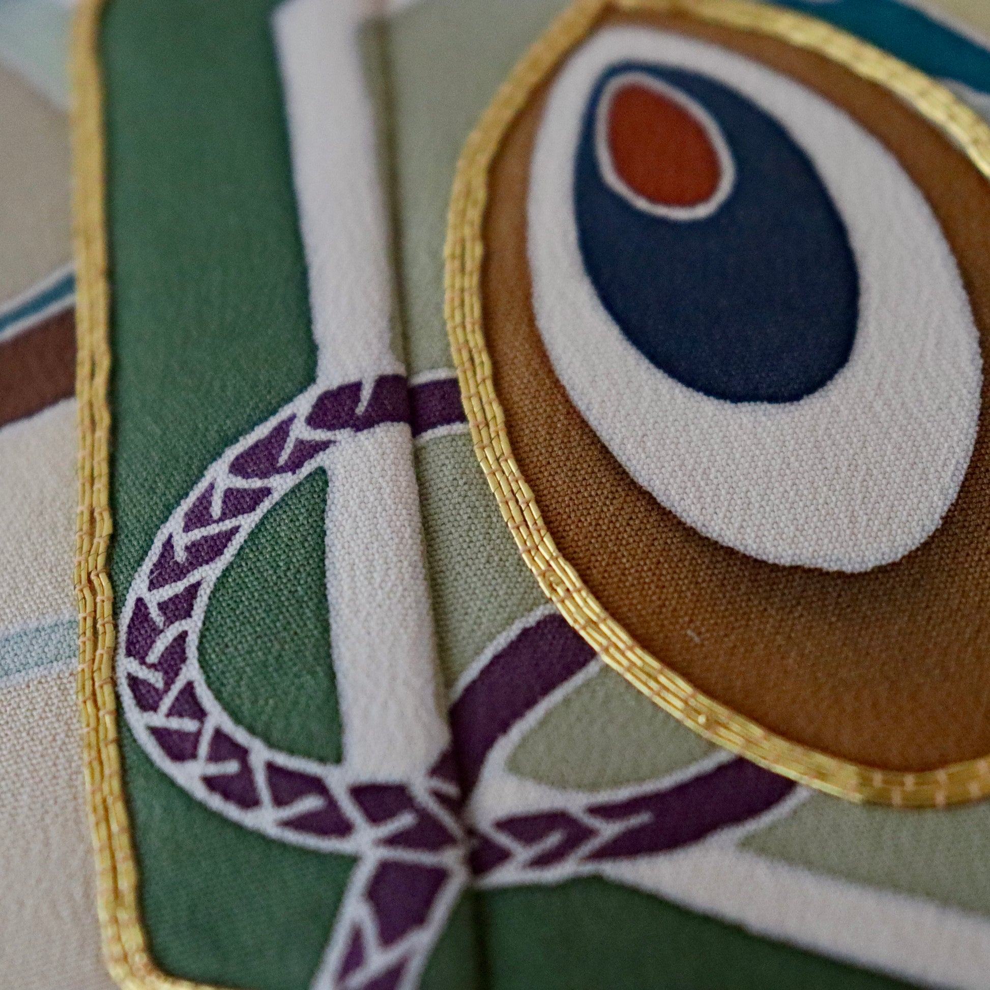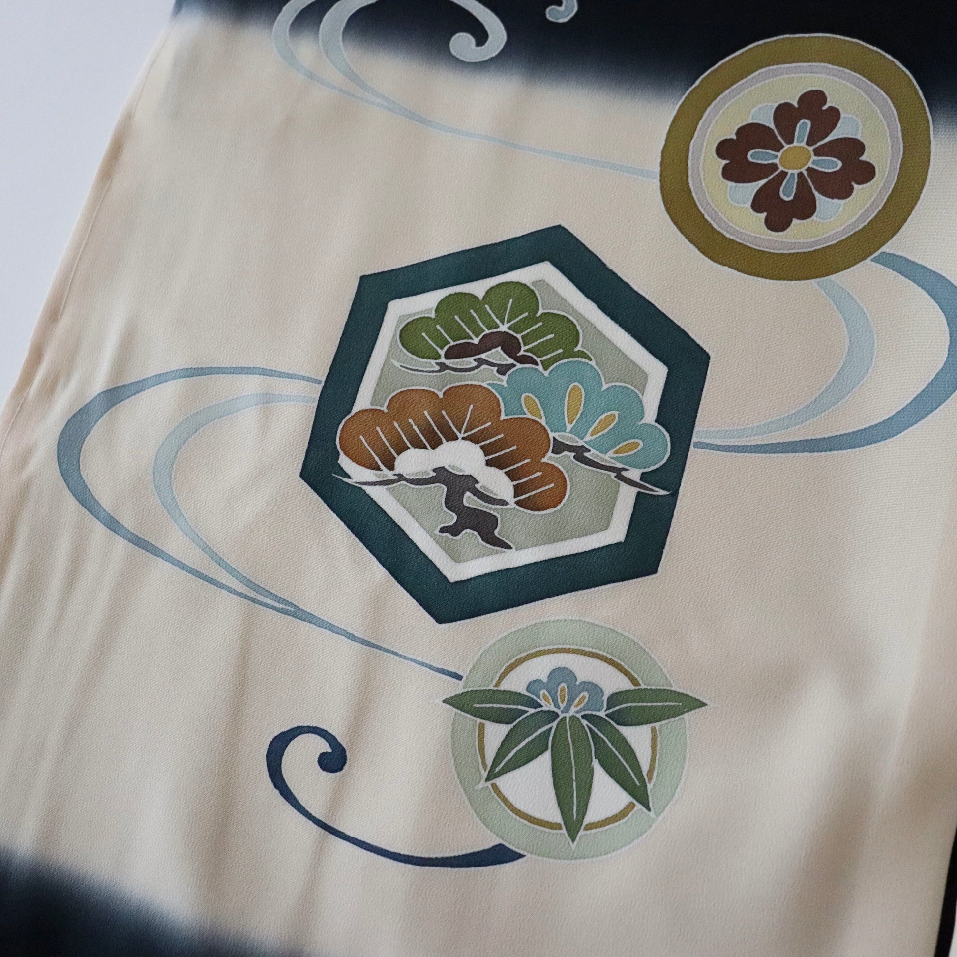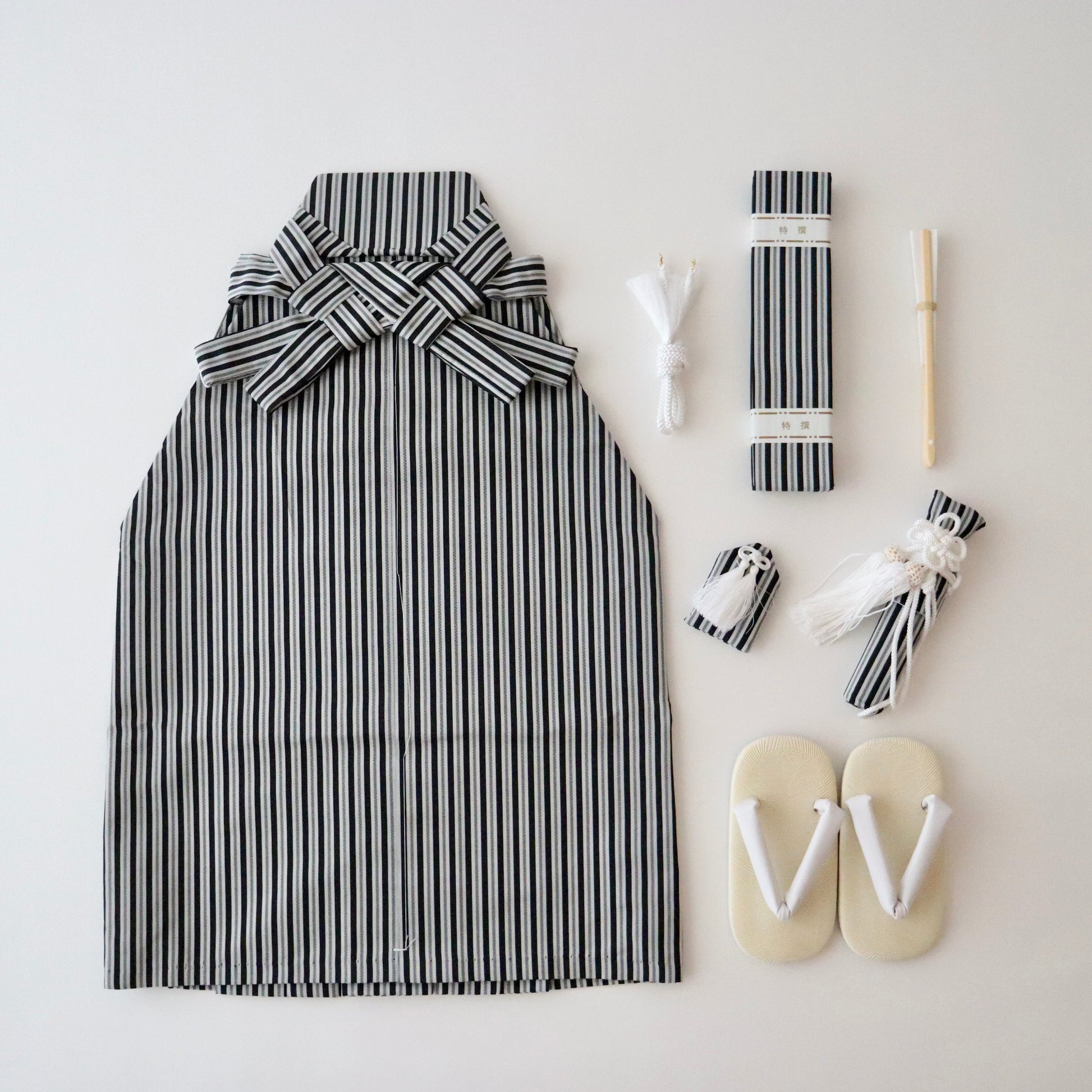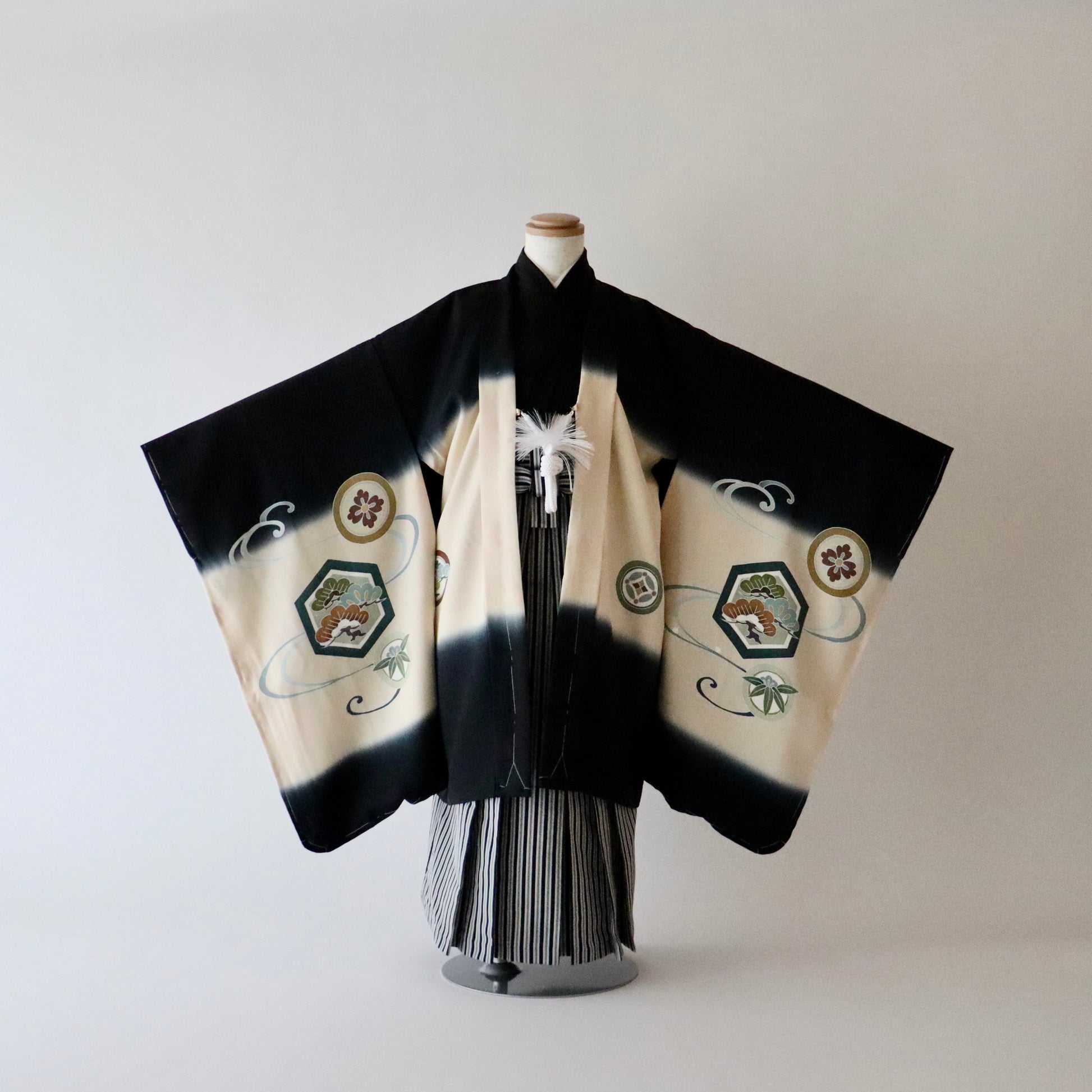 古典的柄構図「熨斗目」に小槌や瓢箪の「亀甲文」「丸文」を御祝着らしく上品かつ可愛げに染め描いた本作。手描き友禅による美しい柄描写と色彩、そして品のある金彩。男児の御祝着らしい潔く凛とした印象が美事な御祝着セットです。