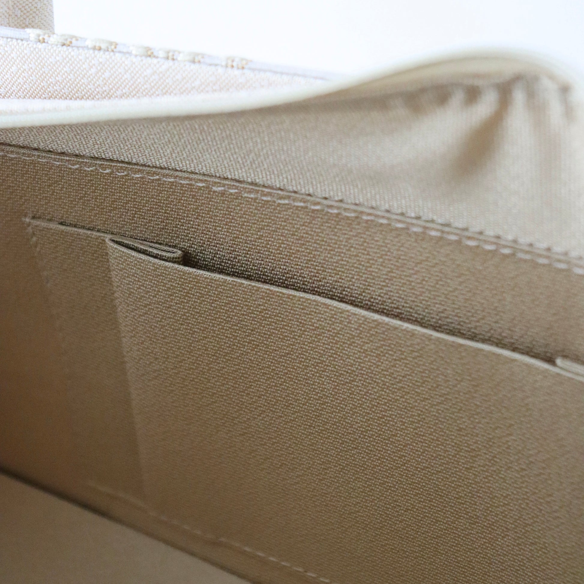 西陣織の帯地を用いた本作。金糸銀糸が織り成す文様が実に美しい表情に仕上がっております。七宝や亀甲、観世水といった文様を重ね意匠化したとても煌びやかで良い柄。「吉祥を持つ・纏う」という意味合いも込めて、慶事の装い、祝賀パーティーなどに相応しいお品物です。