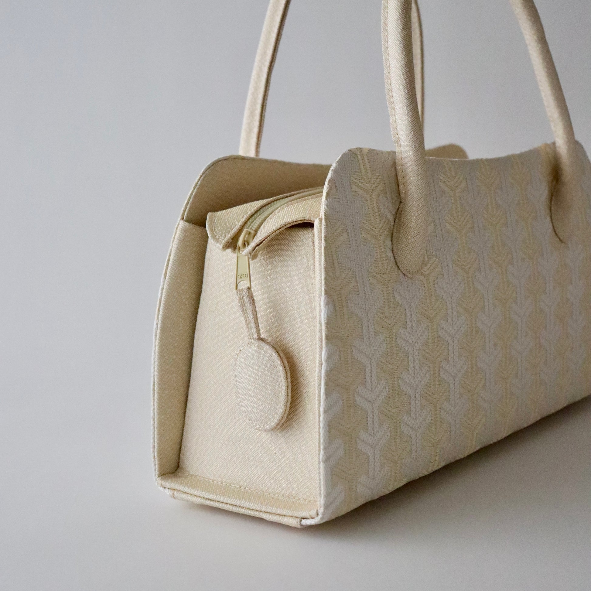 西陣織の帯地を用いた本作。金糸銀糸が織り成す文様が実に美しい表情に仕上がっております。亀の甲羅を重ね意匠化した毘沙門亀甲は「毘沙門天」の甲冑に描かれている事からその名が付いた非常に縁起の良い柄。「吉祥を持つ・纏う」という意味合いも込めて、慶事の装い、祝賀パーティーなどに相応しいお品物です。