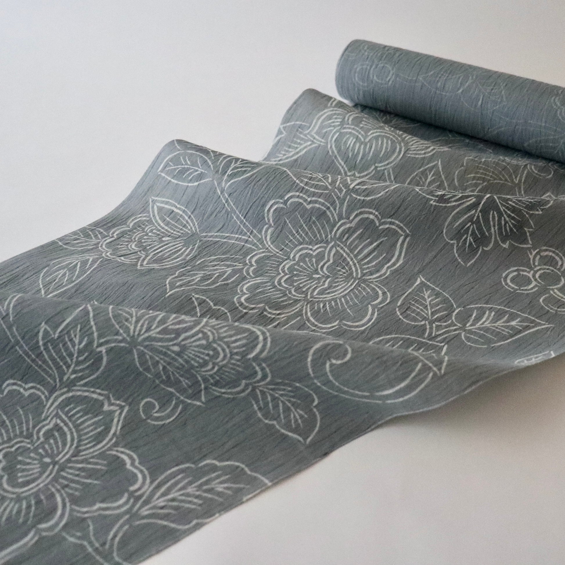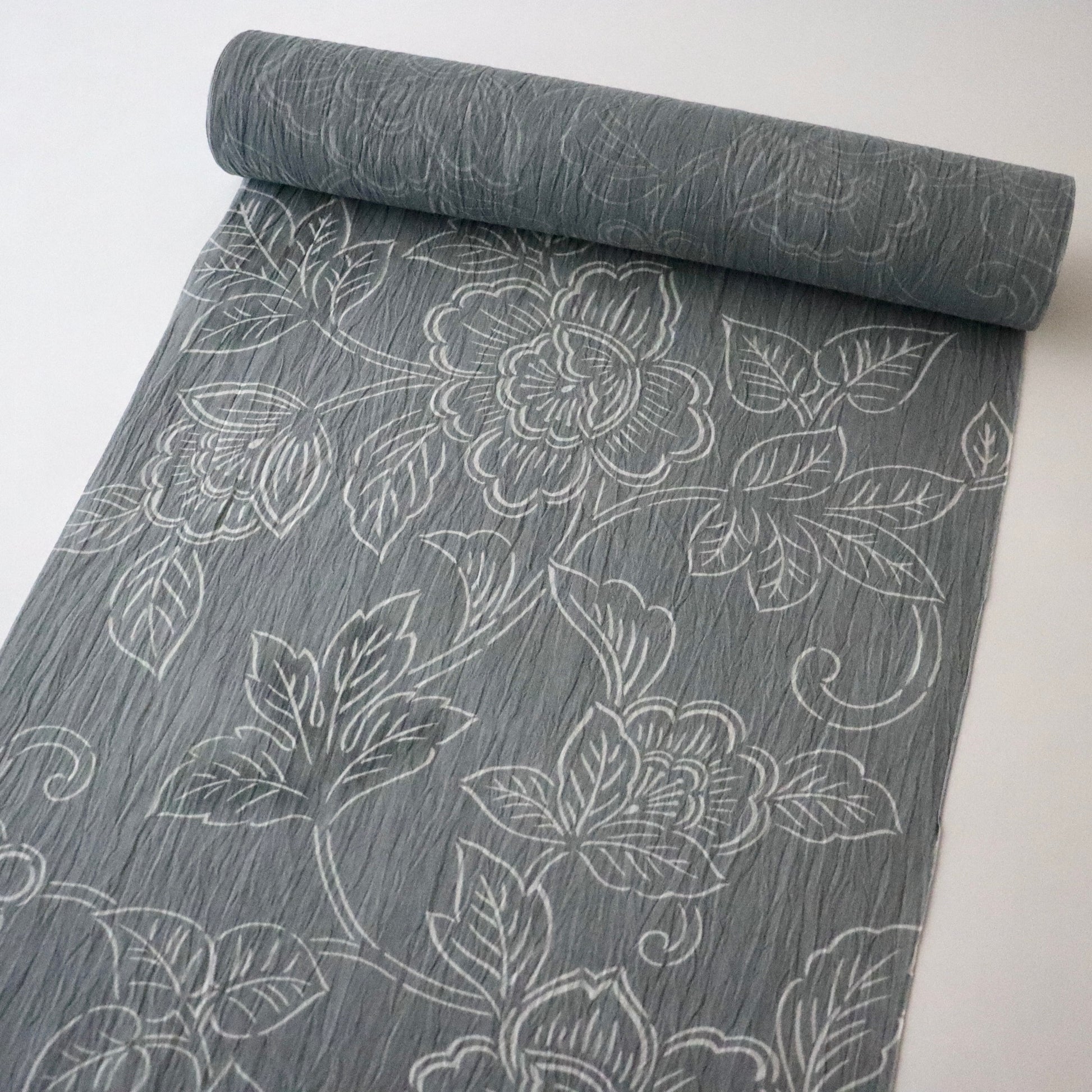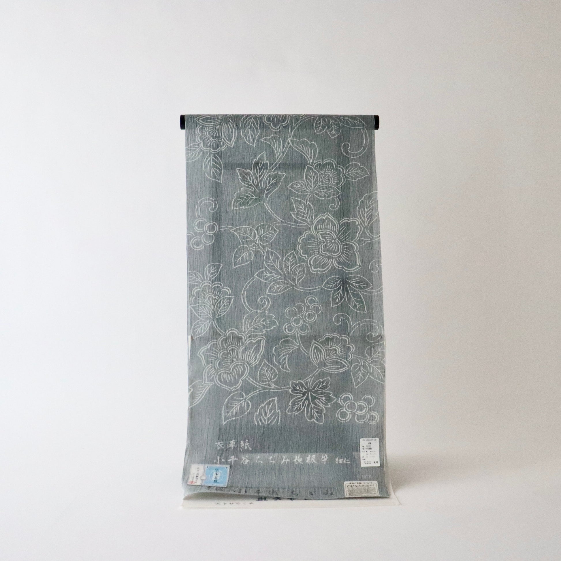 天然の苧麻から紡いだ細糸のみを使用した雪国小千谷の麻織物「小千谷ちぢみ」。先染めが多い小千谷ちぢみですが、本作は型染めで葡萄唐花を染め付けた紺仁ならではの一品。モノトーンの配色に部分的に墨黒のぼかしを入れるなど、洒落た印象の仕上がりです。