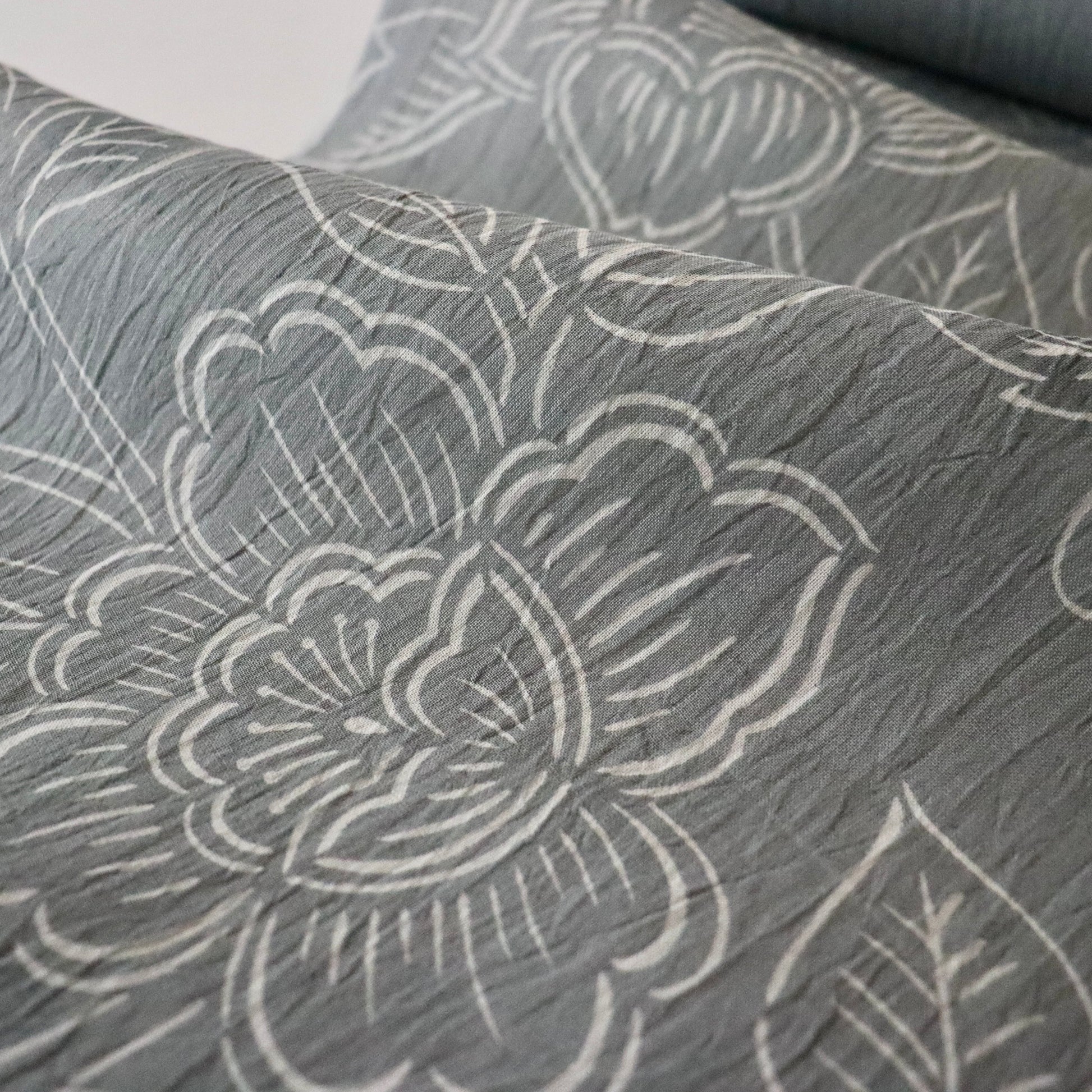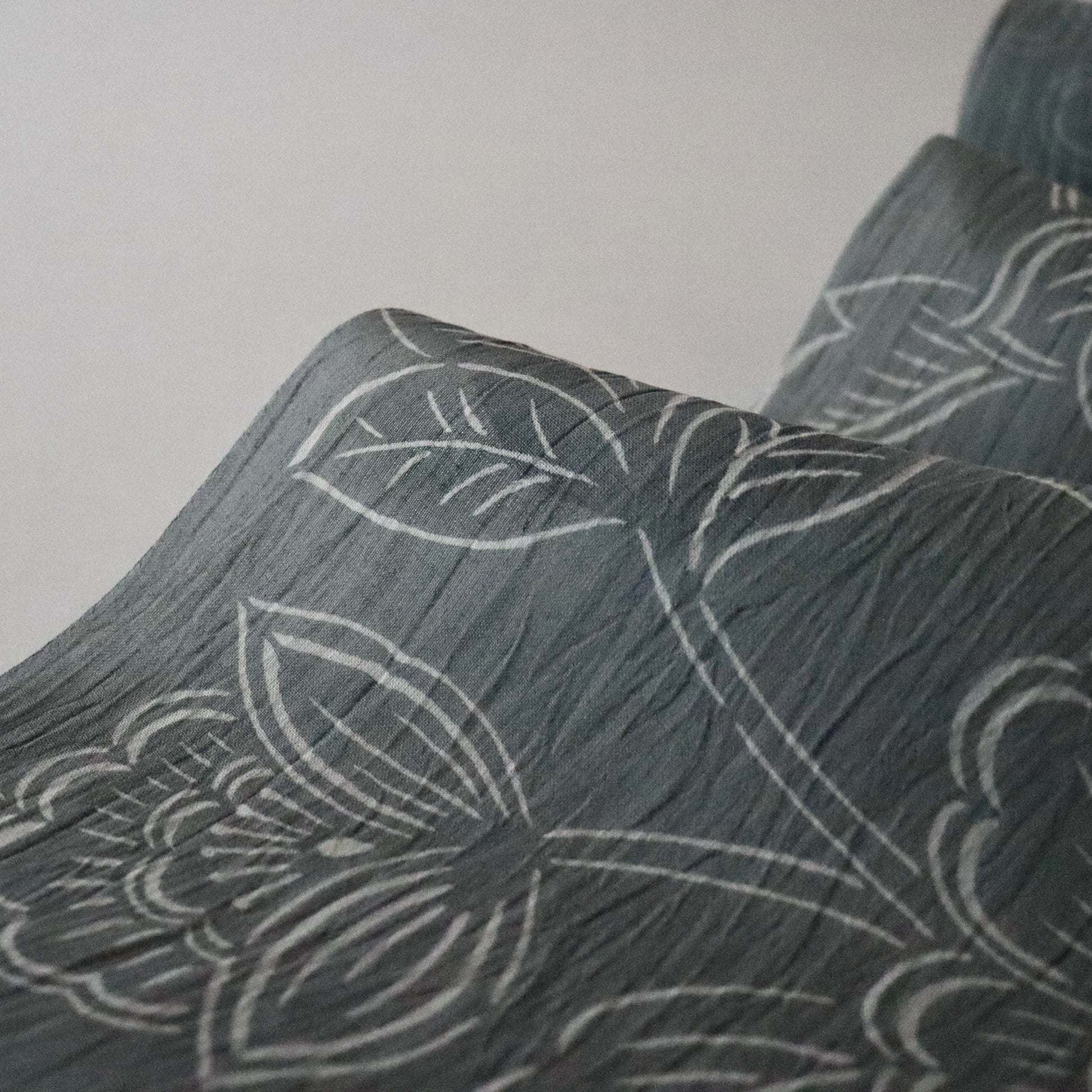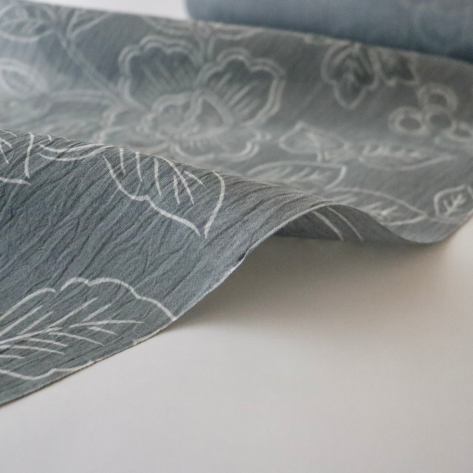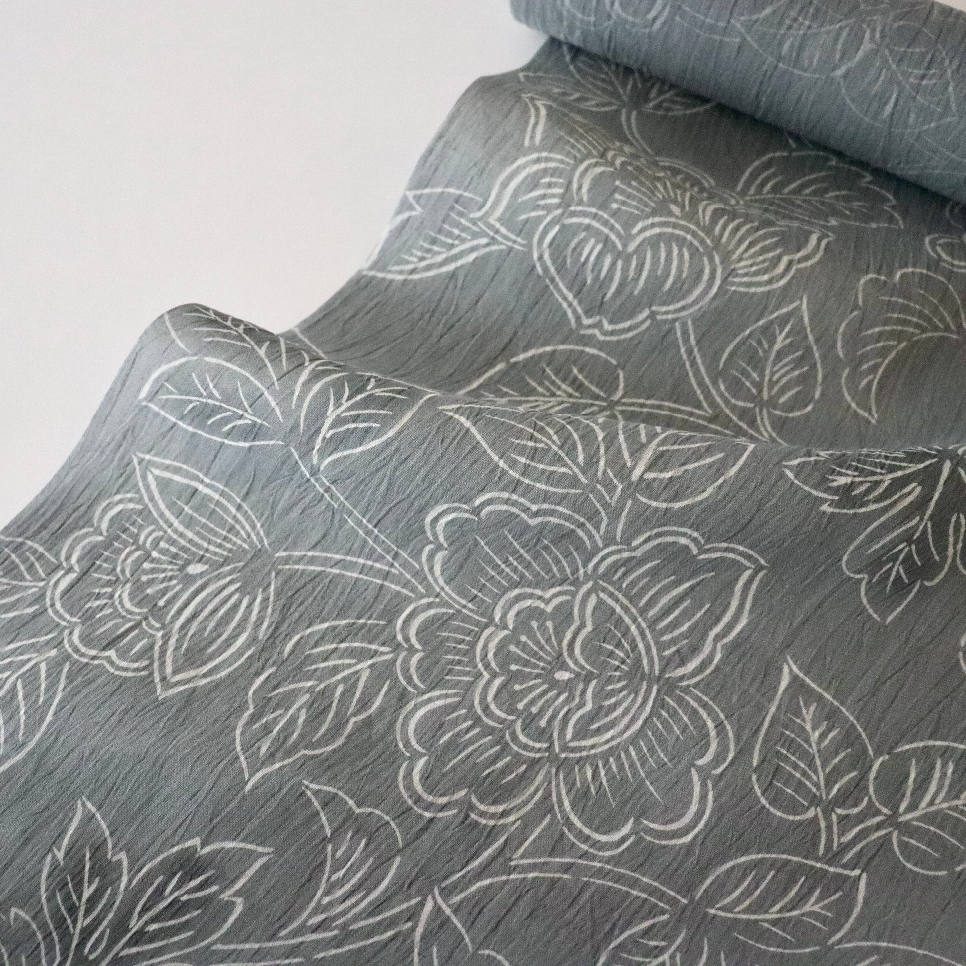 天然の苧麻から紡いだ細糸のみを使用した雪国小千谷の麻織物「小千谷ちぢみ」。先染めが多い小千谷ちぢみですが、本作は型染めで葡萄唐花を染め付けた紺仁ならではの一品。モノトーンの配色に部分的に墨黒のぼかしを入れるなど、洒落た印象の仕上がりです。