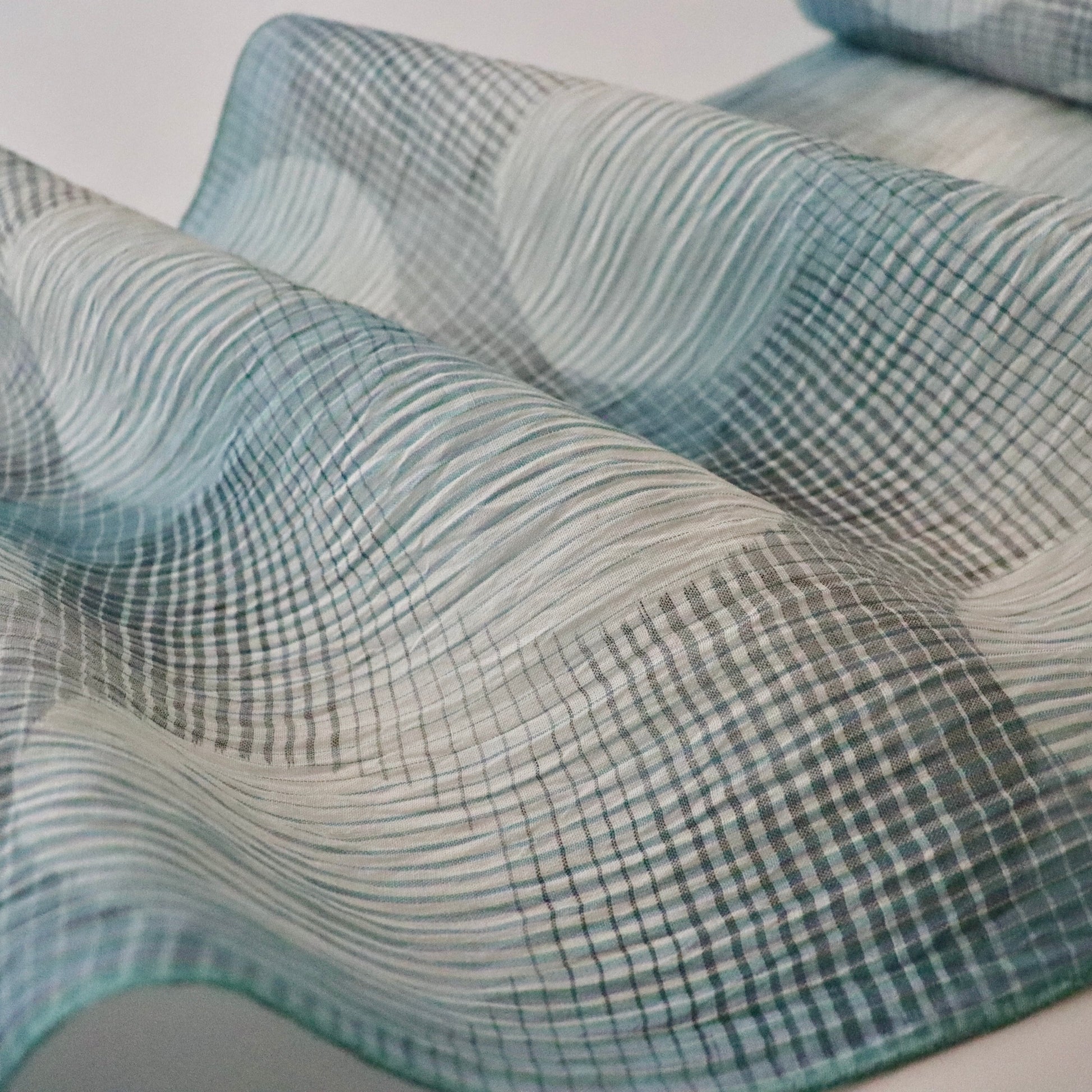 天然の苧麻から紡いだ細糸のみを使用した雪国小千谷の麻織物「小千谷ちぢみ」。本品は絣模様が美しい先染め小千谷縮の制作を得意とする「おだきん」が手掛けた特選品です。麻織物ならではの涼感溢れる質感に爽やかな色彩に染め上げた麻糸が織り成す絣模様がとても美しい仕上がり。熟練の職人の手によって丁寧に制作された温もり溢れる一品です。