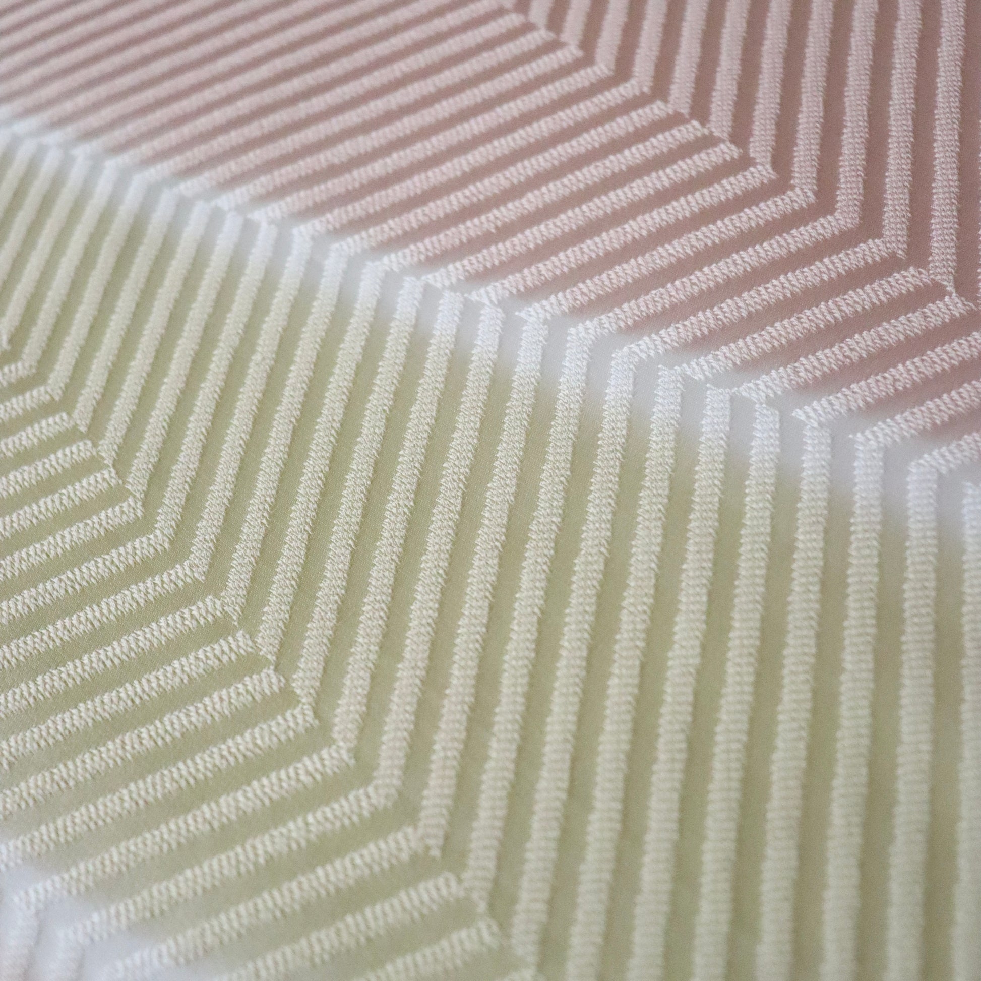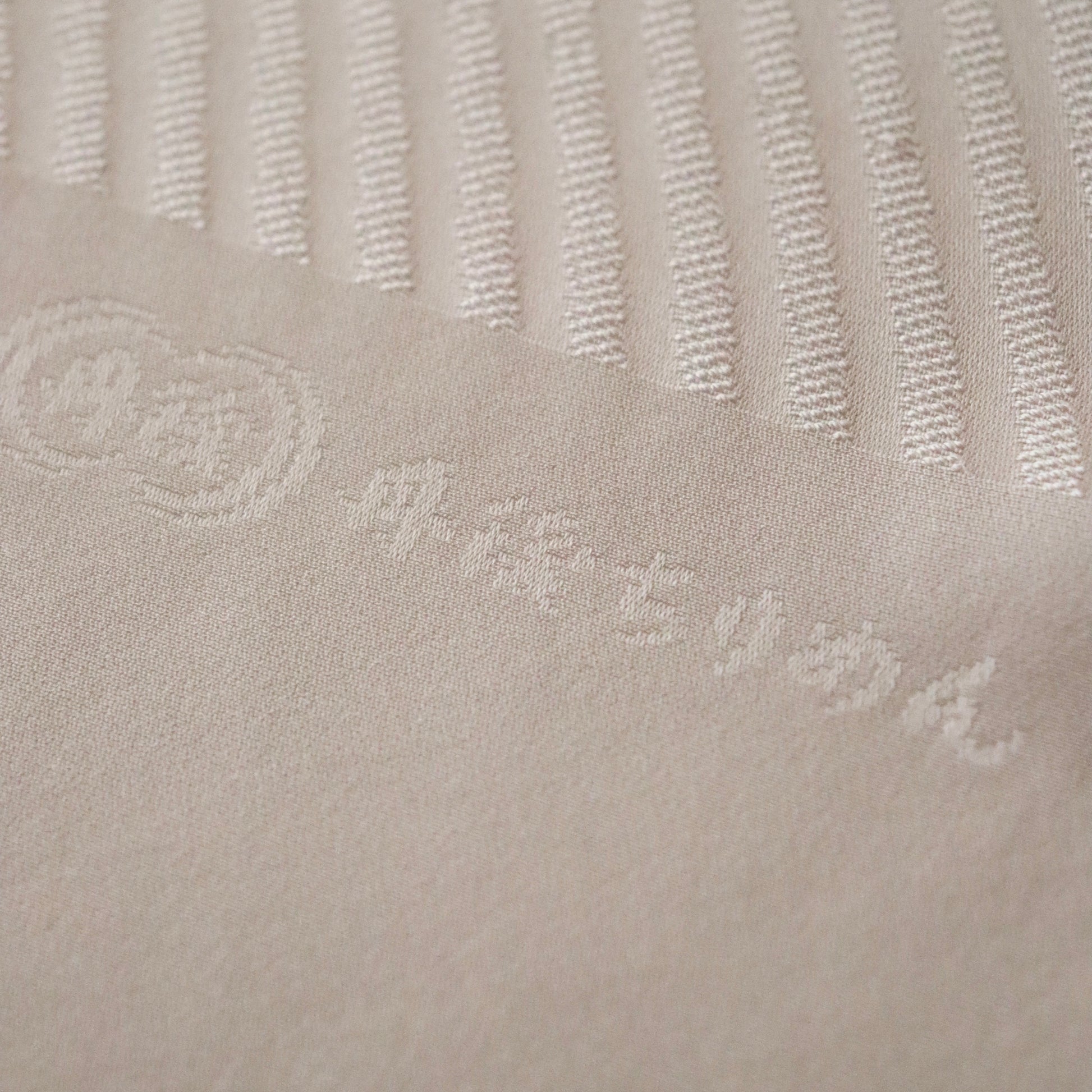 縫取り部分が染まらないよう防染糸を使用した帯揚げです。直線的な染め分けに洒落た配色。ふっくらとした糸の表情もコーディネートの一部としてお楽しみ下さい。