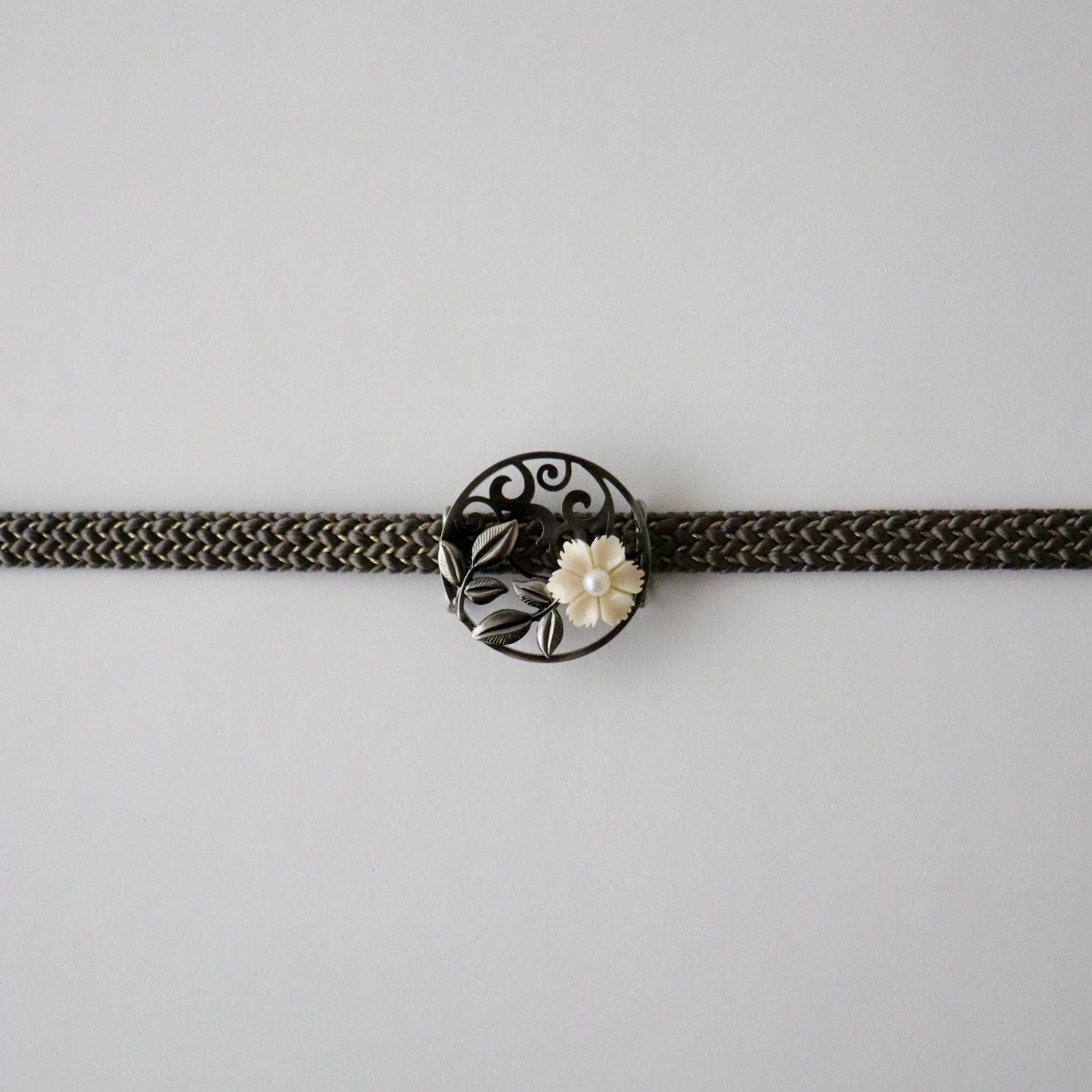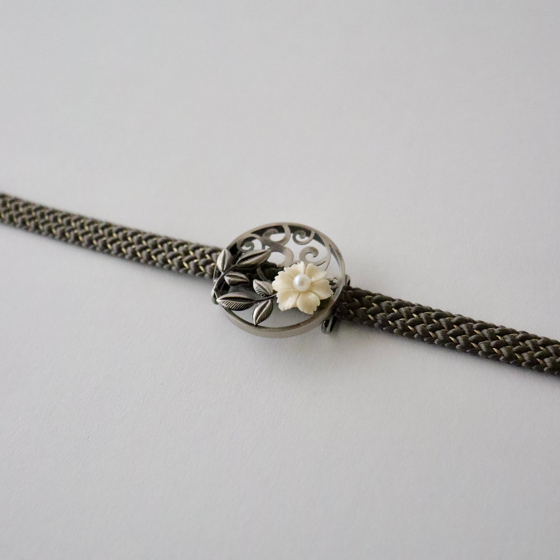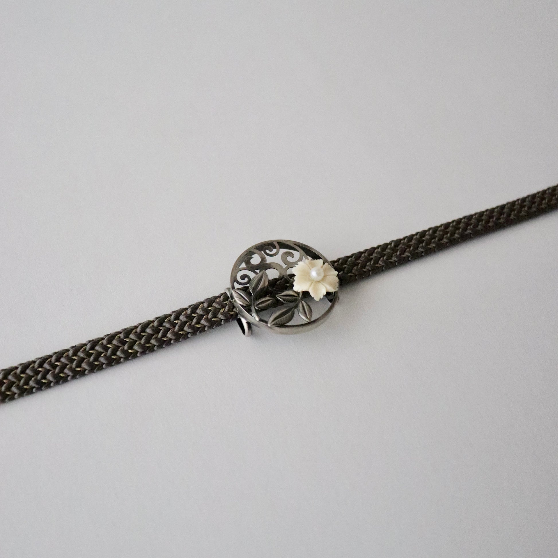 質感のコントラストも意匠の一部としてお楽しみ頂ける帯留です。