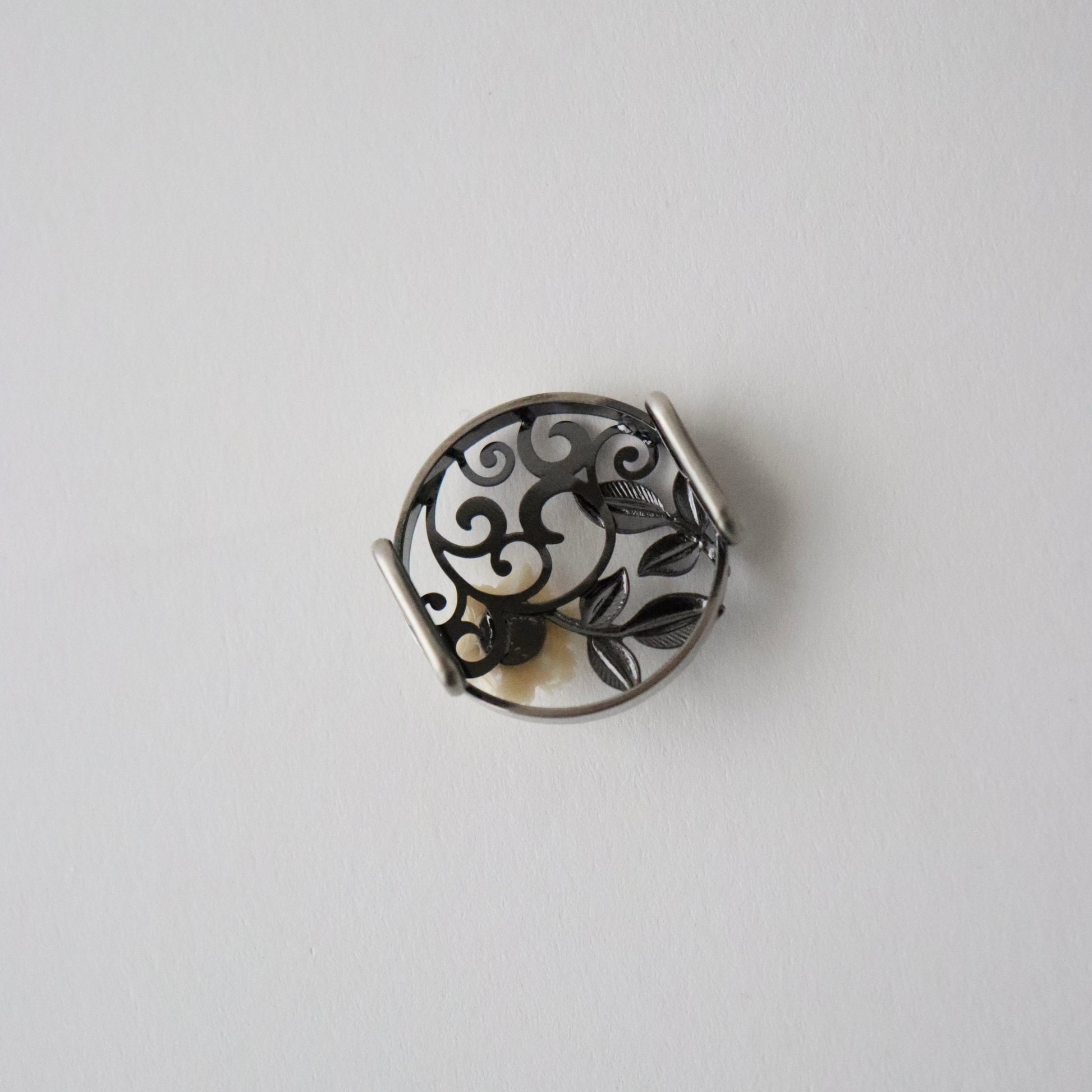真鍮を唐草葉に模った意匠が洒落た雰囲気の帯留。