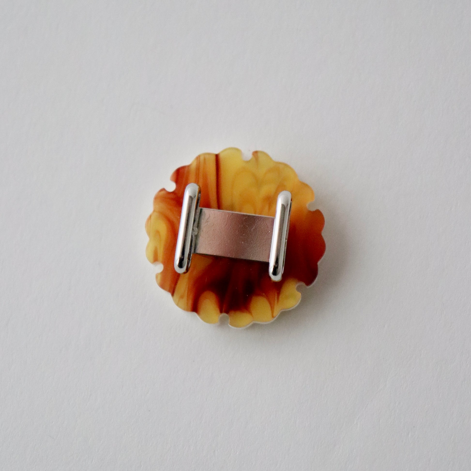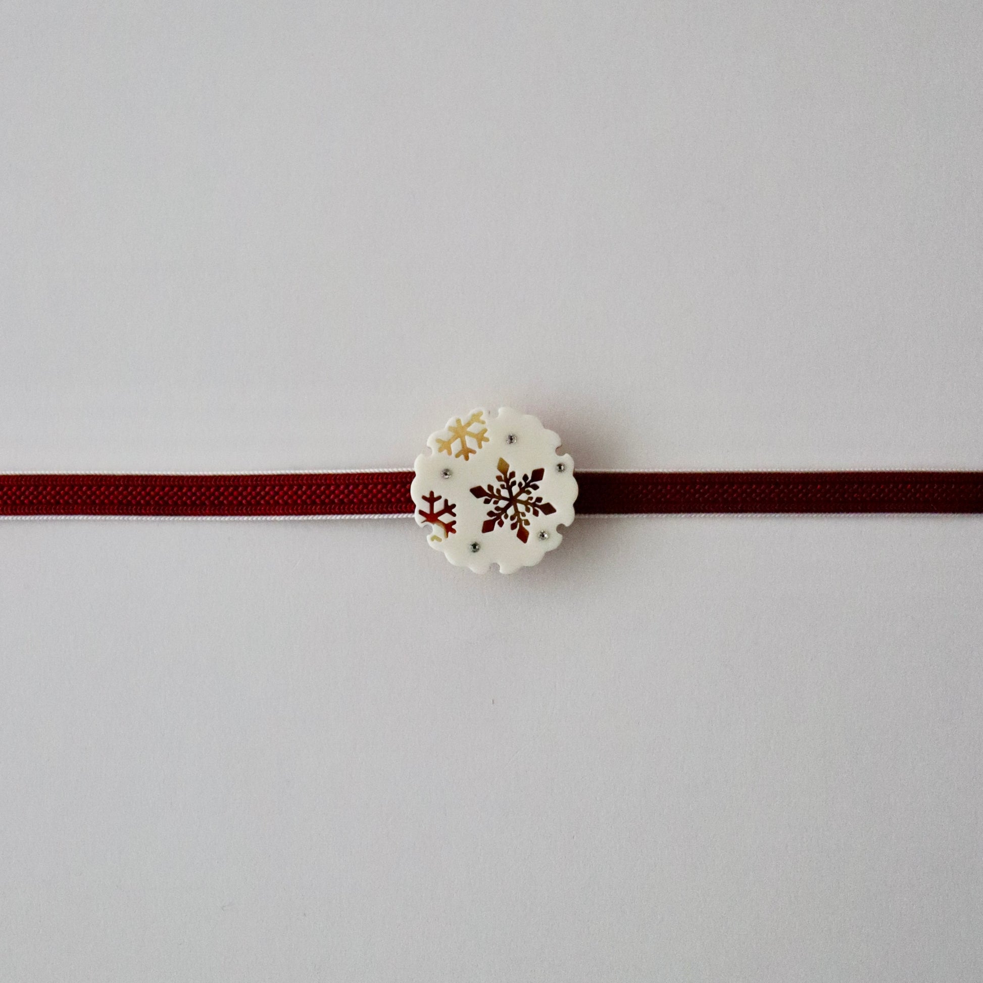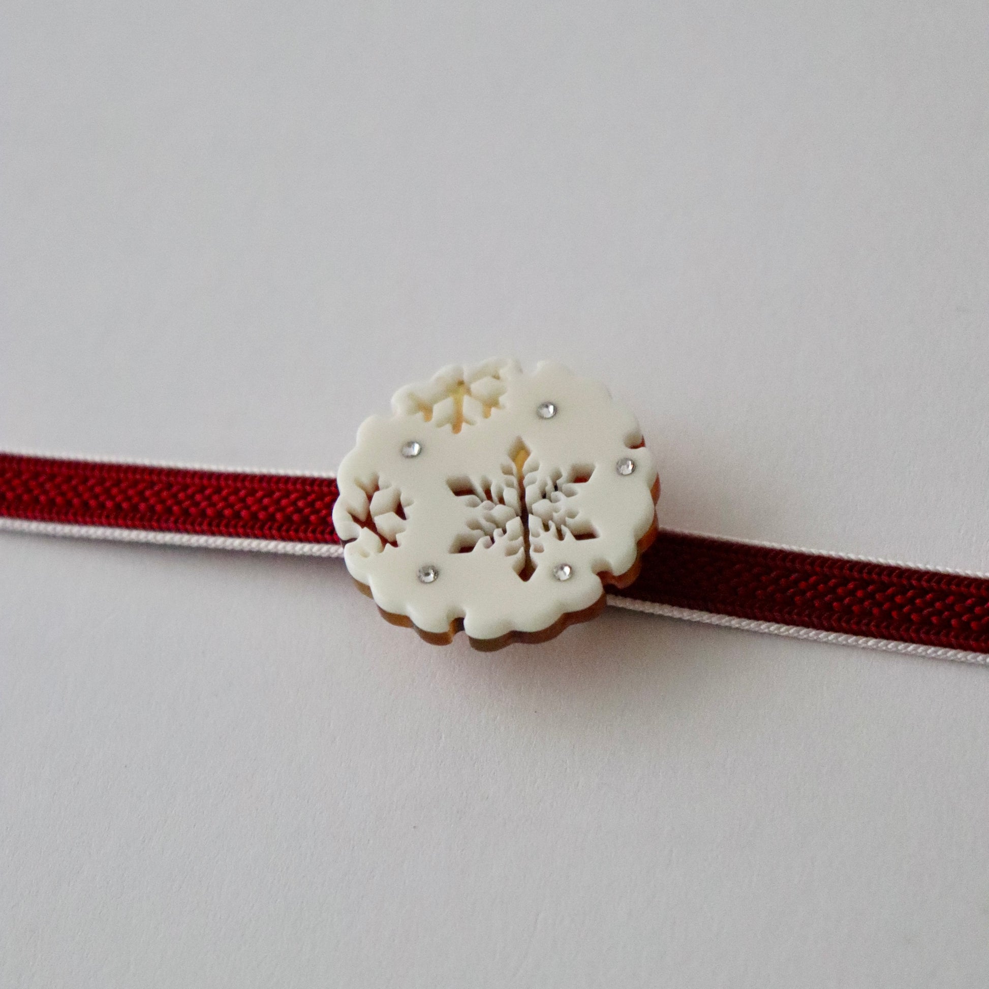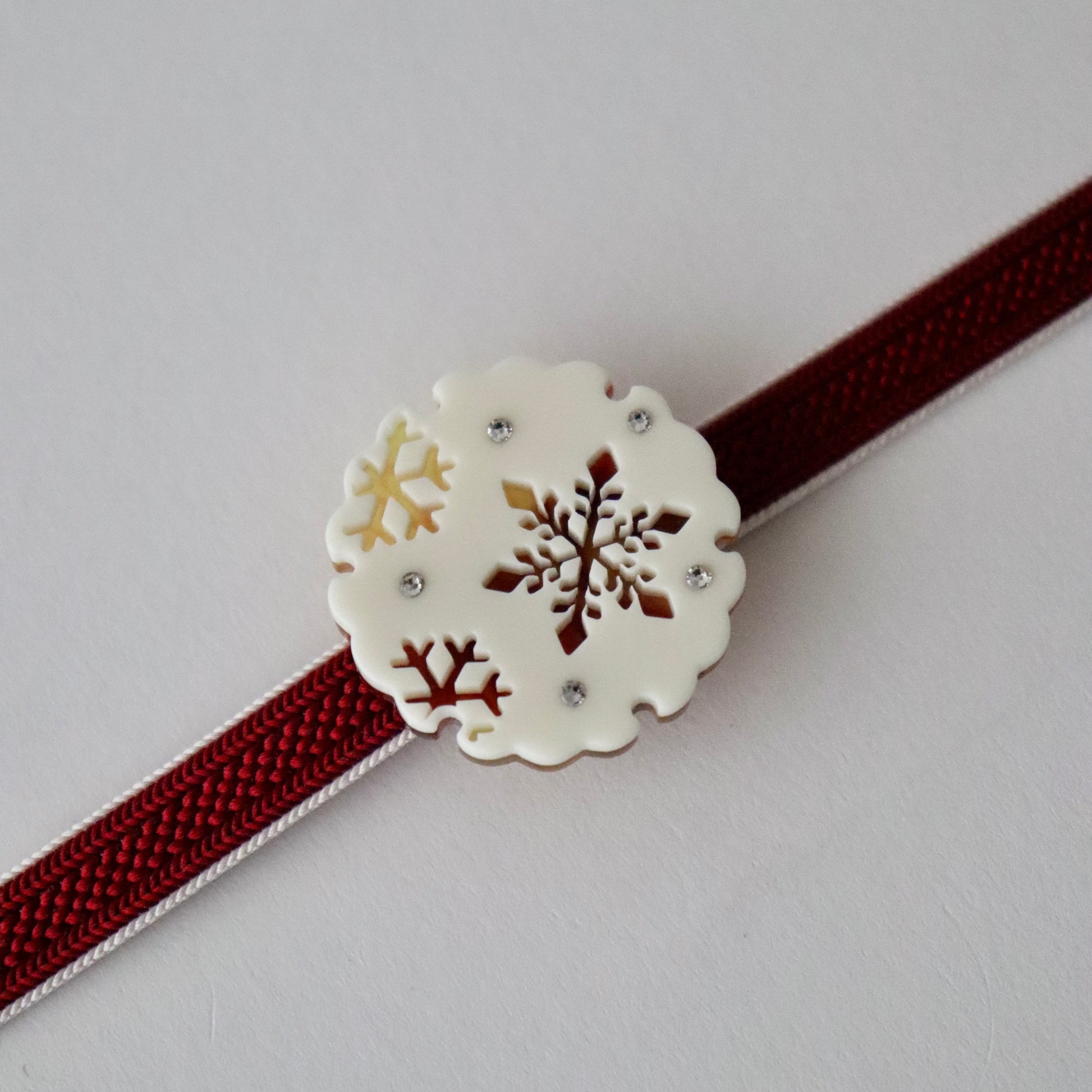 優美な雪輪文を模った本作。鼈甲を模した質感と色がとても洒落た仕上がり。雪輪の中に模られたダイアモンドダストが季節感たっぷりの帯留です。
