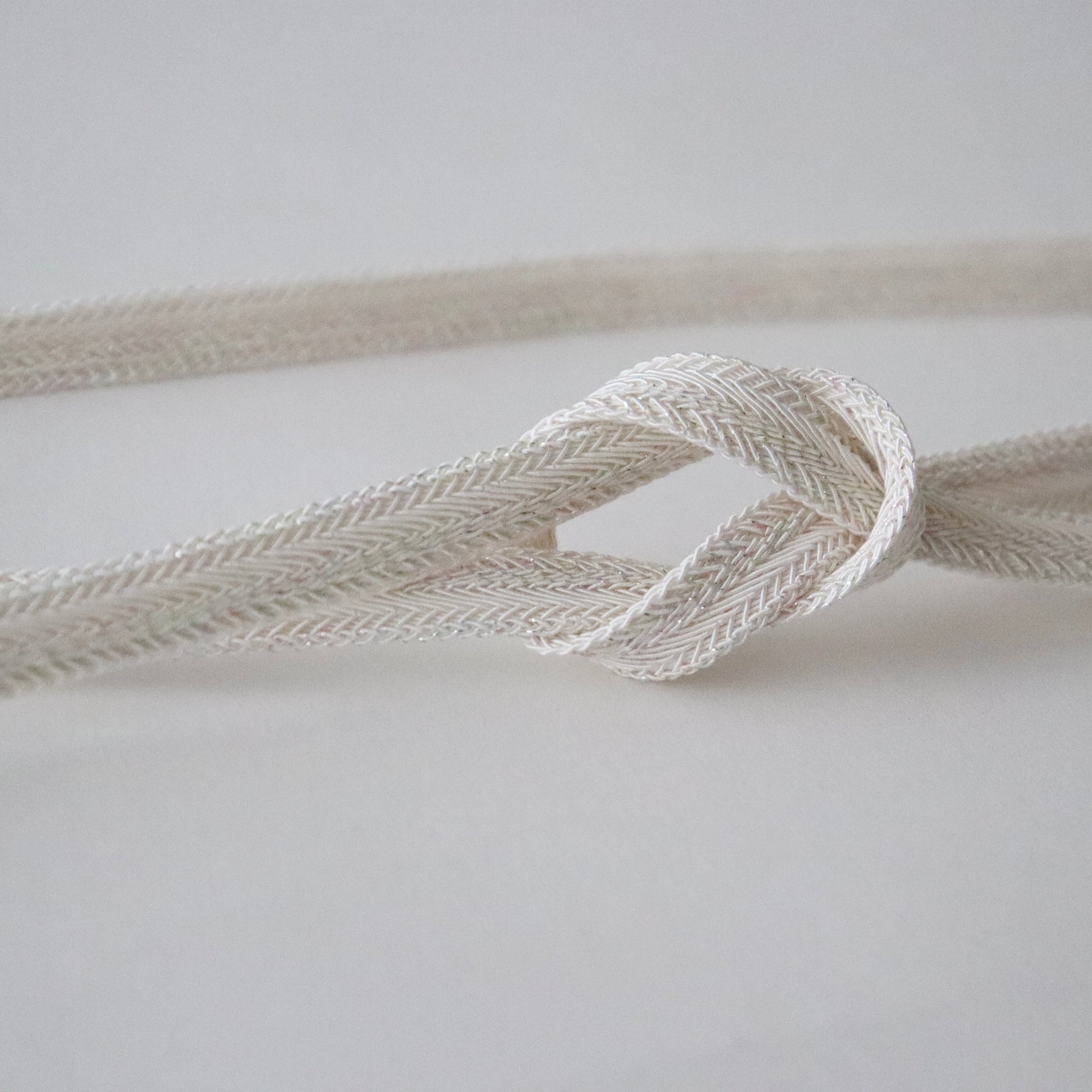 涼しげなレースを丁寧に組み上げた単衣から盛夏向けの本作。光沢を組み交ぜておりますが、織物から染物まで幅広くコーディネート頂けます。爽やかで清涼感のある色彩が美しい帯締めです。