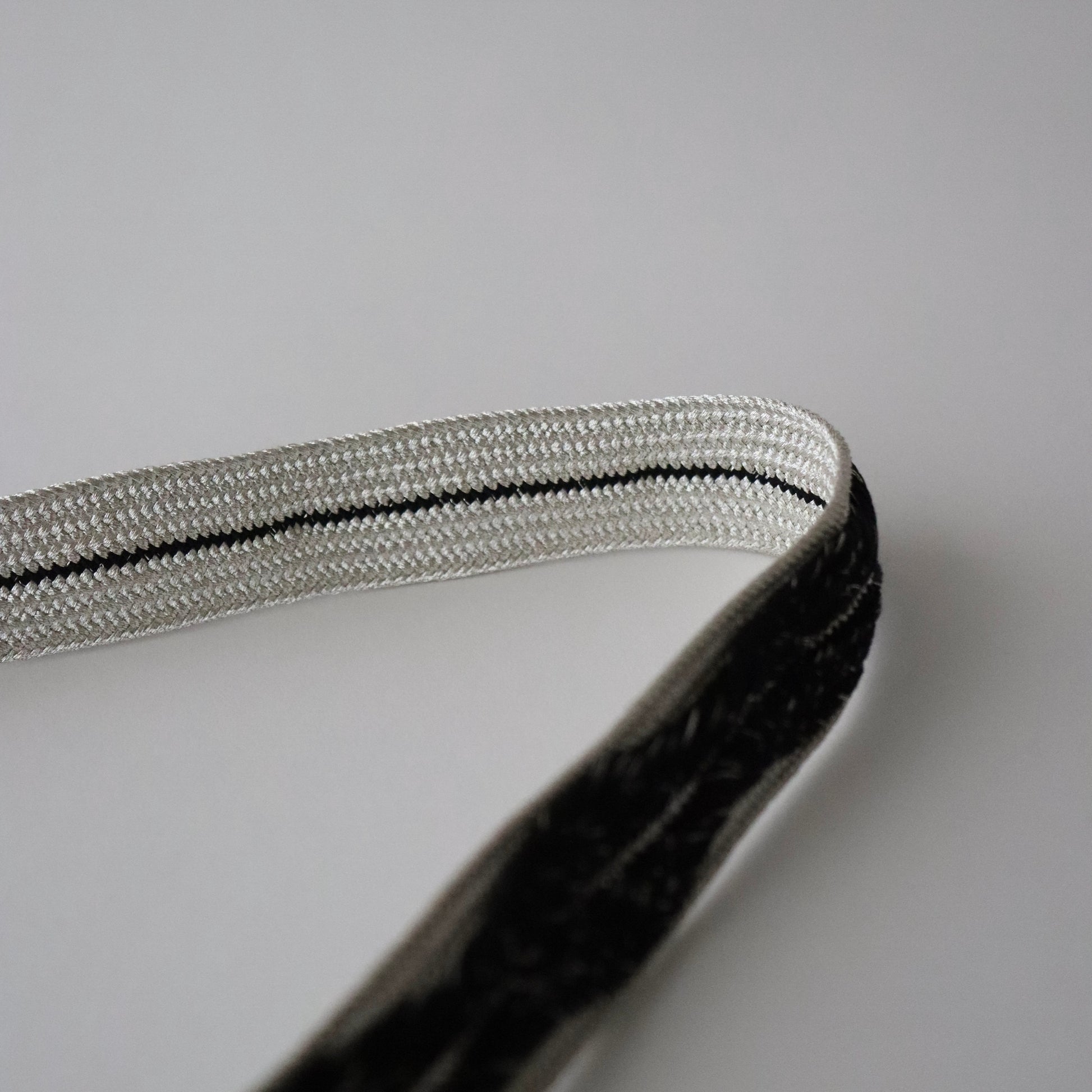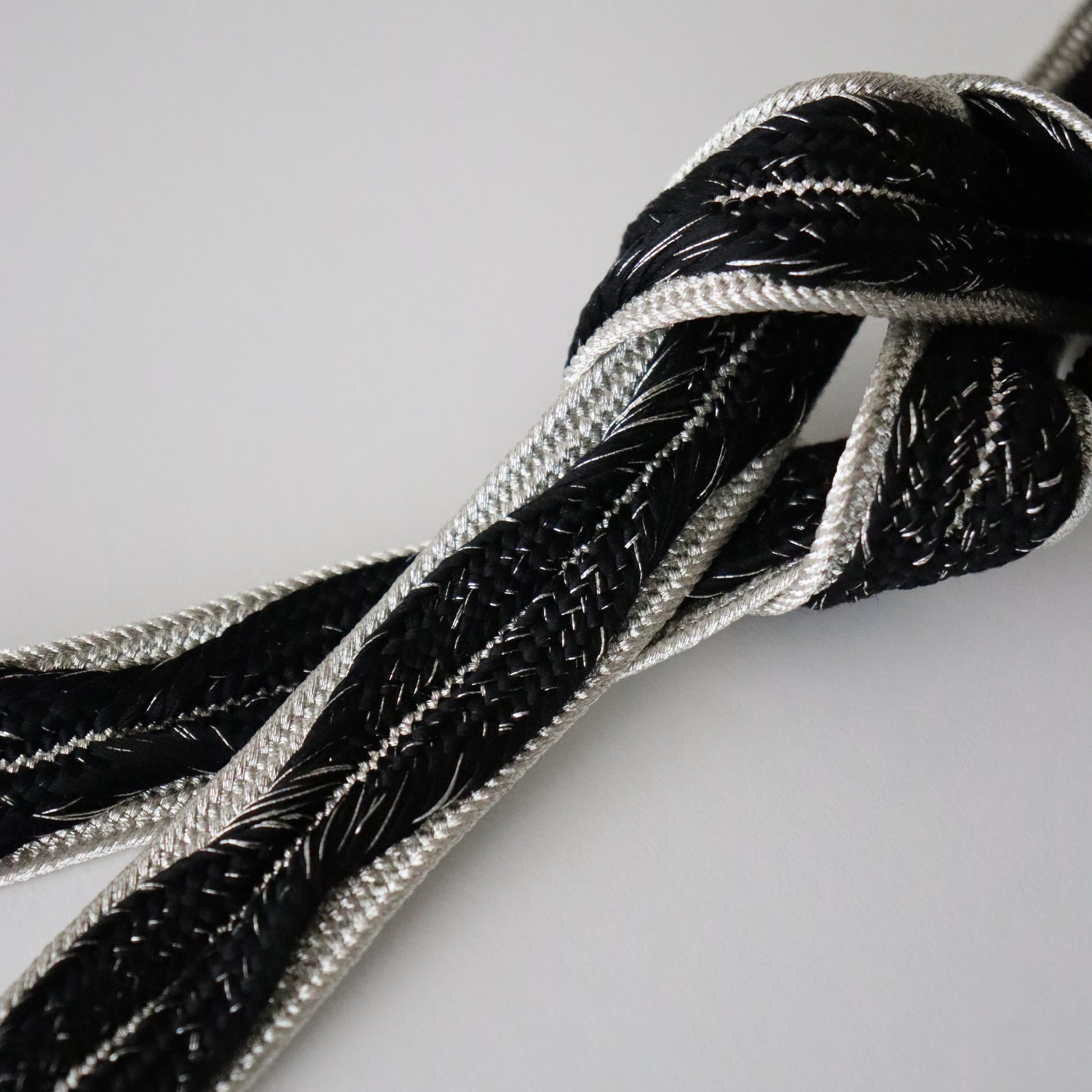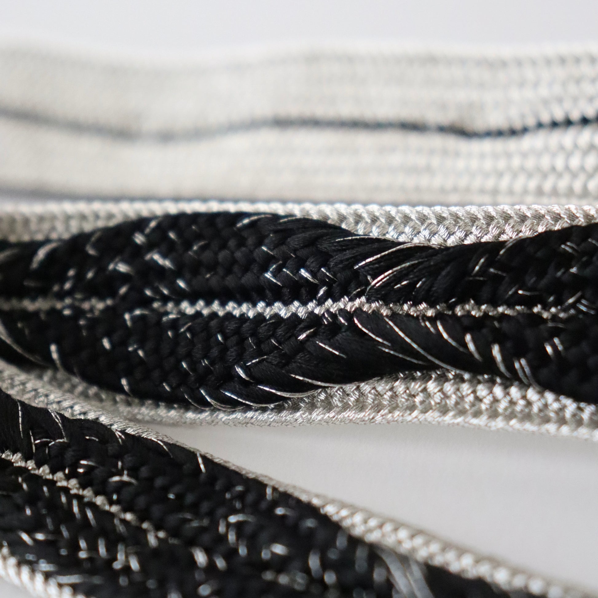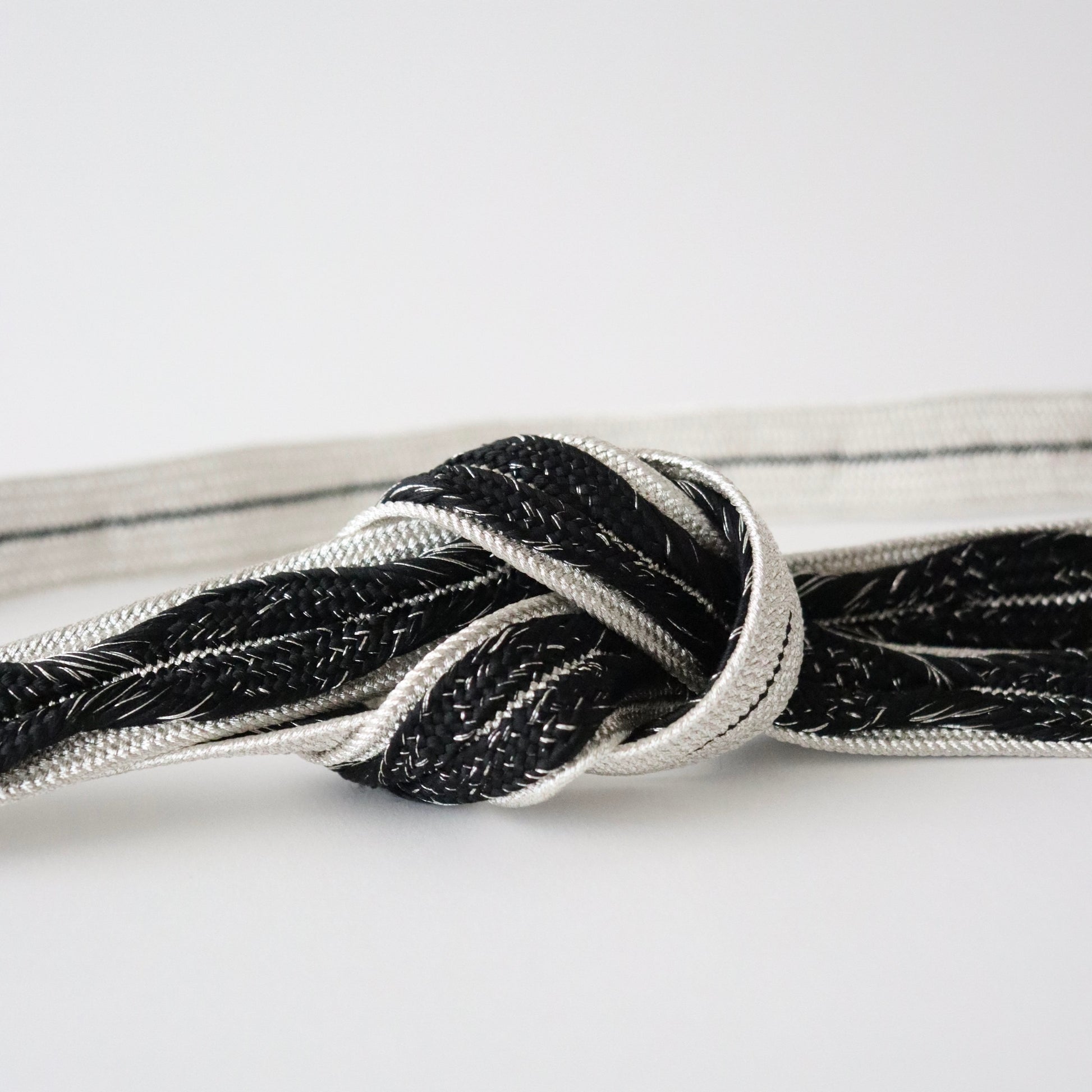 黒銀のコントラストが凛とした雰囲気の帯締め。手組みならではのしなやかで繊細な組表情が美しい本作。木の葉が連なる様な組模様が帯締めに華やかさとボリュームをもたらし、一層の存在感を示します。しっかりとした厚みと幅があるので華やかでしっかりとした存在感がある仕上がりです。