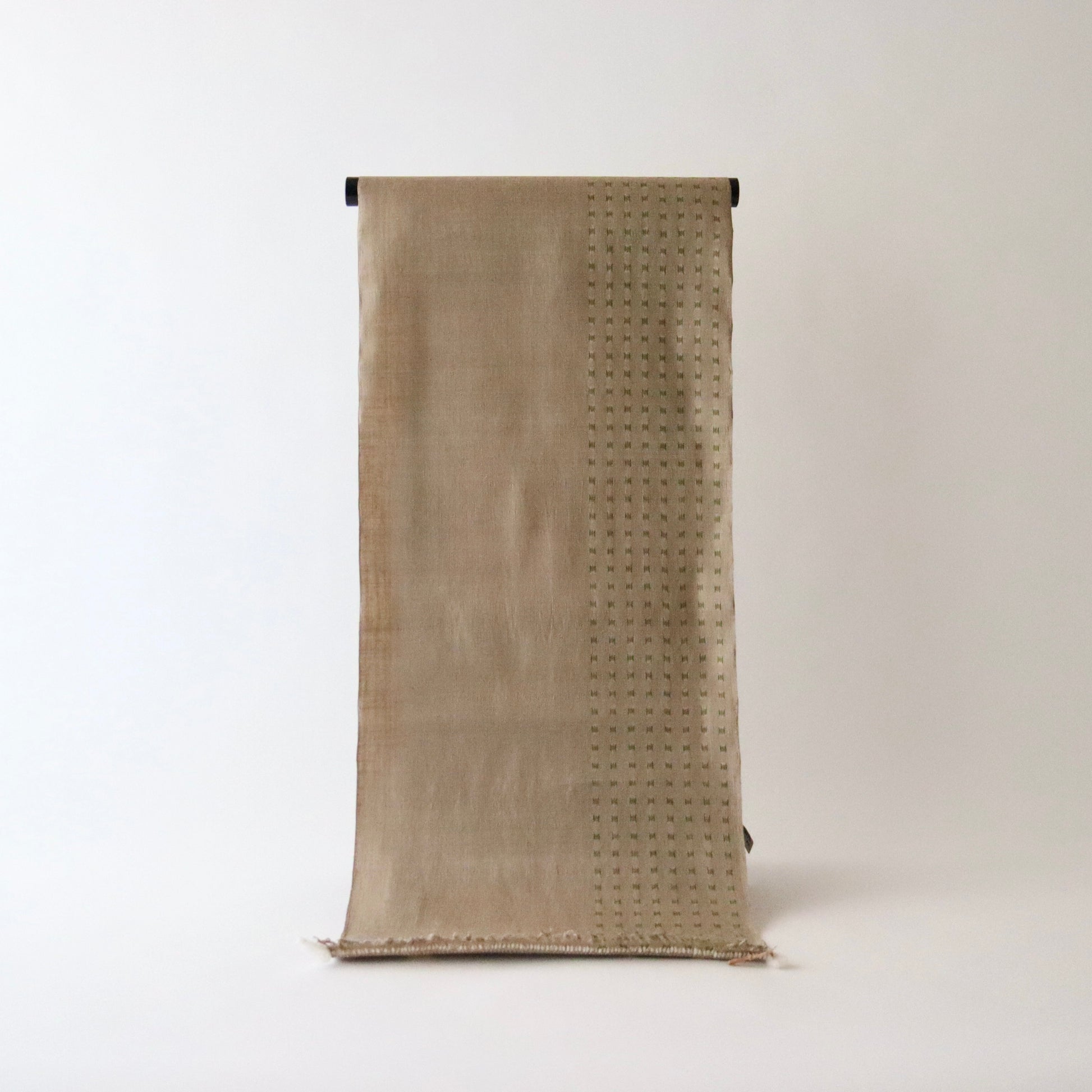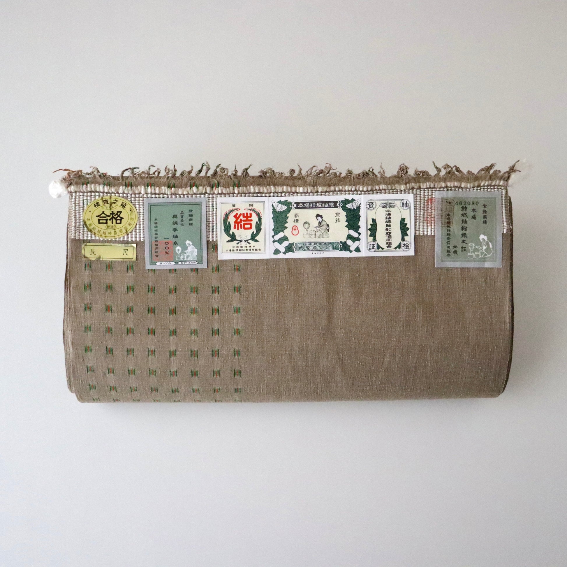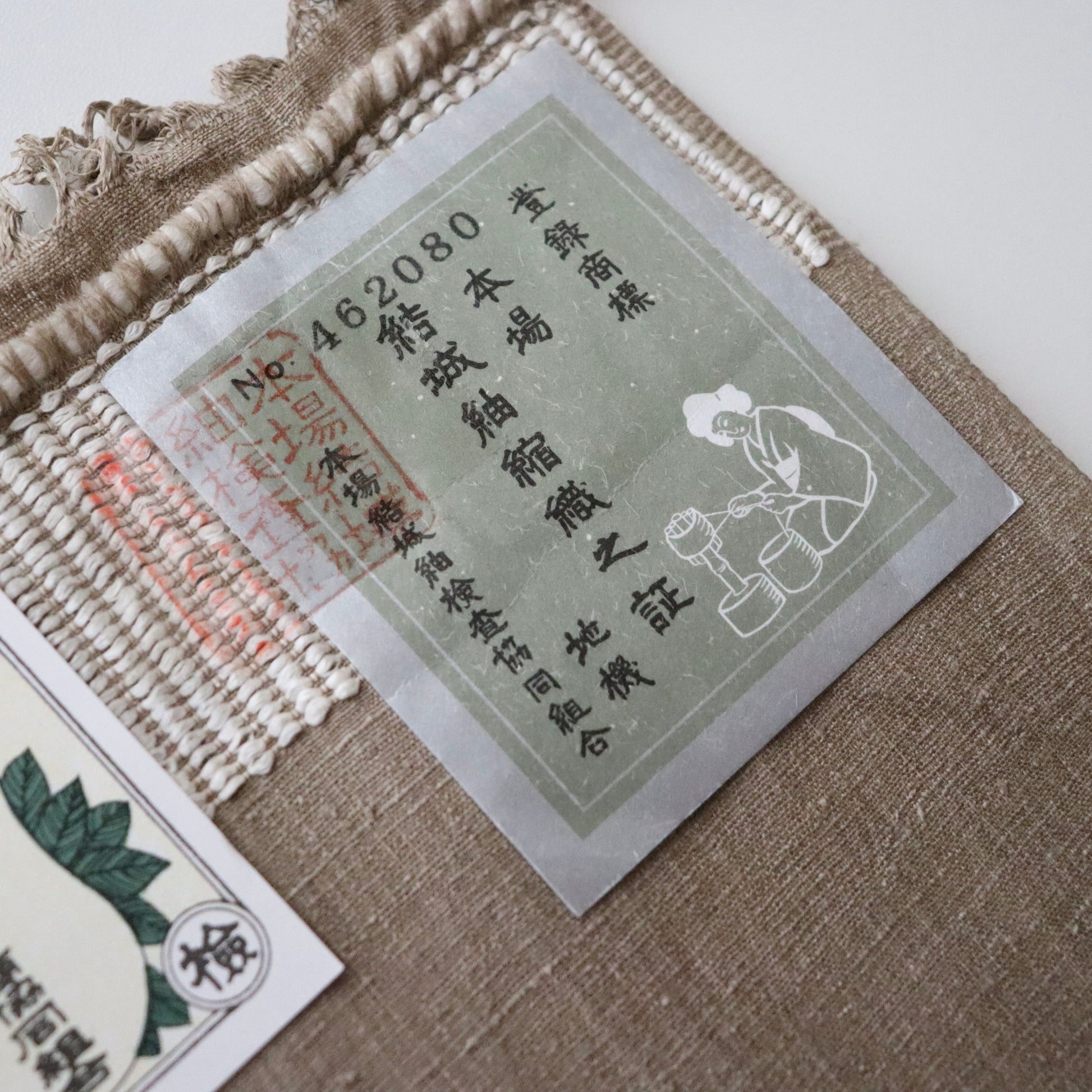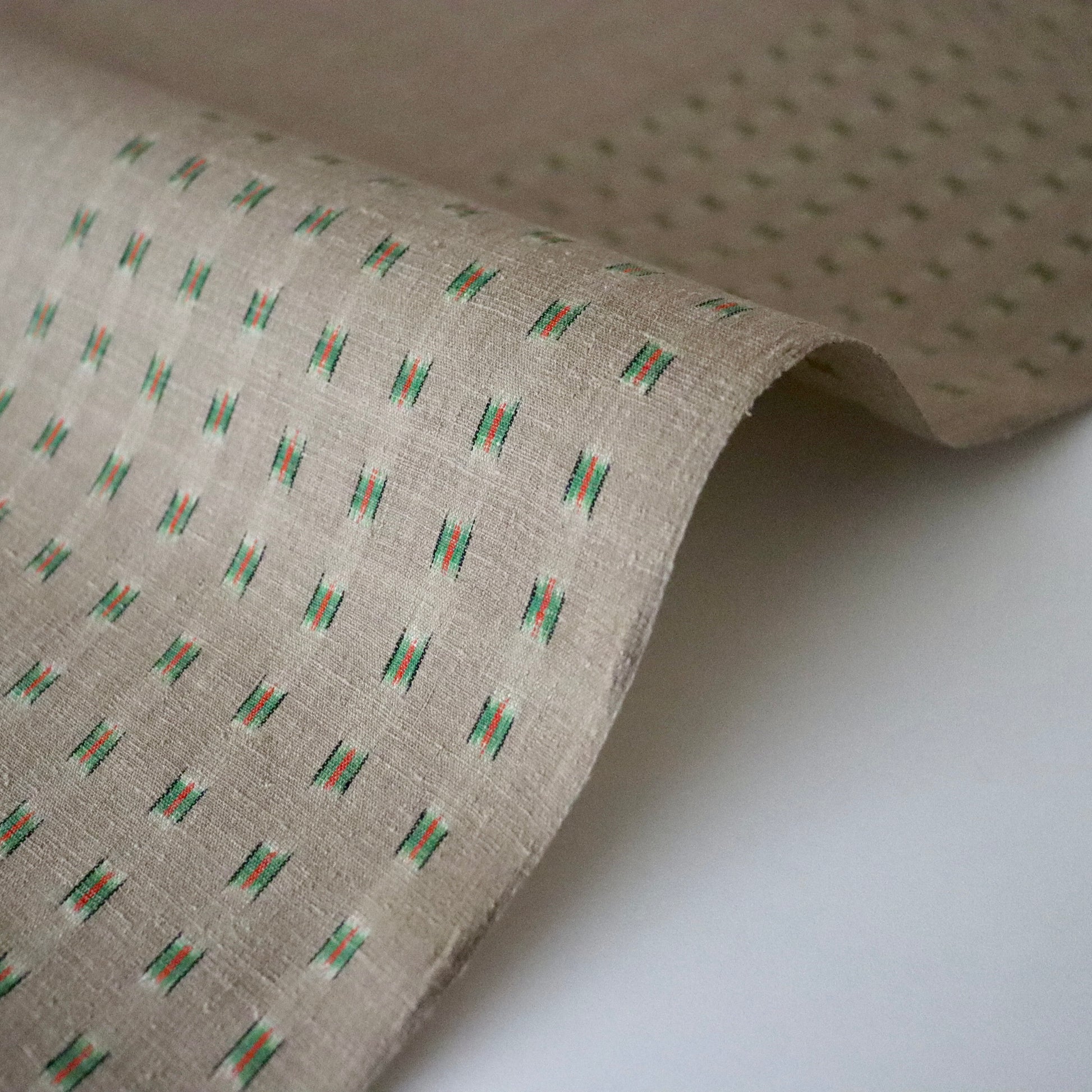 本作は小倉商店が所蔵する大正期〜昭和初期の縮見本裂を元に、当店が復刻を依頼して製作頂いた結城縮です。数ある見本裂の中でふと目に留まった見た事のない絣模様。絣模様には作名も記されておらず、制作元でもある小倉商店さんにも由来詳細が分からないという謎に包まれた結城縮。しかしその美しく洒落た絣模様と色合いに惹かれ復刻再現を依頼しました。品名は大正時代の見本裂にあった絣模様で目を惹く緑は伝統和色でいうところの「花緑青 -はなろくしょう」であることから「大正絣 花緑青」としました。