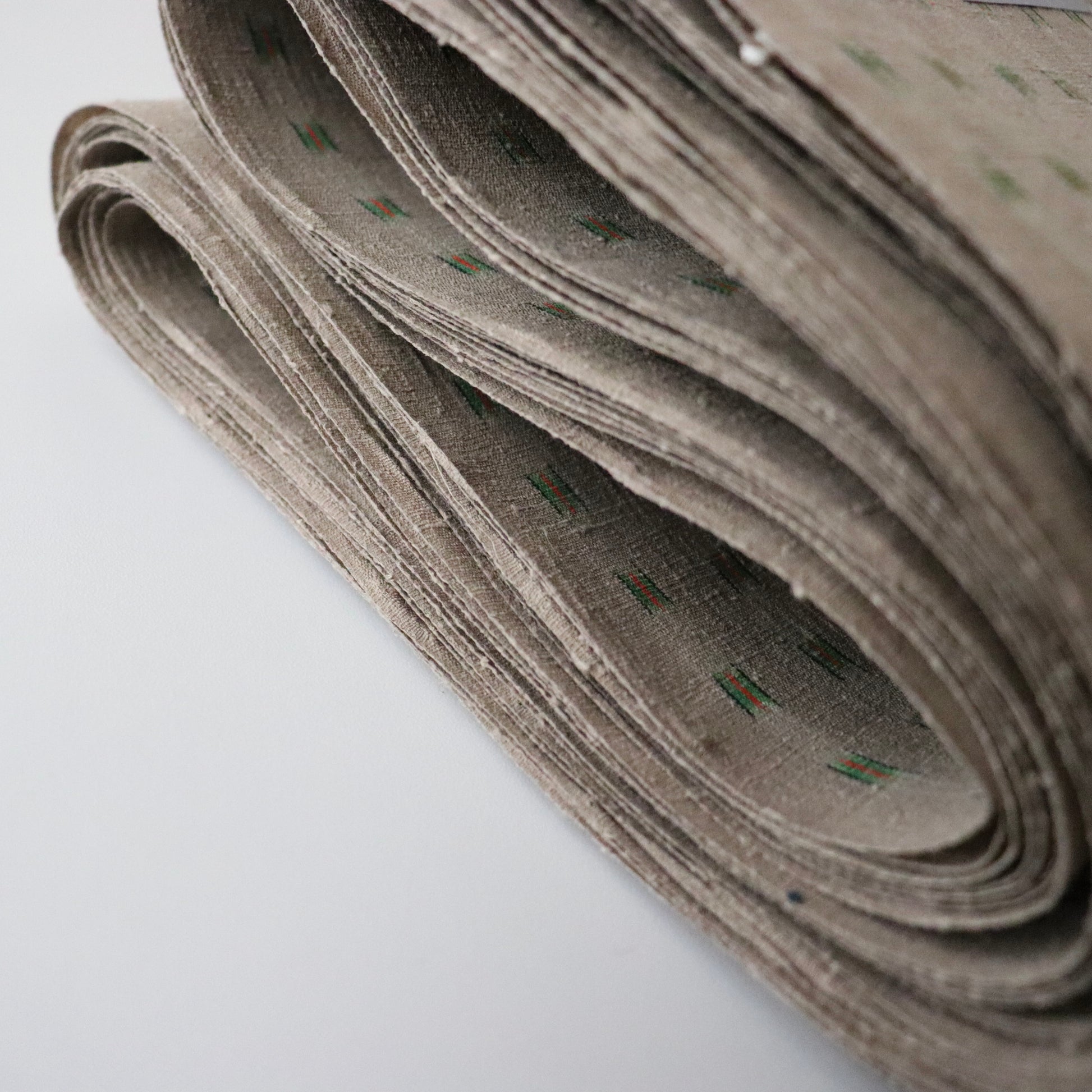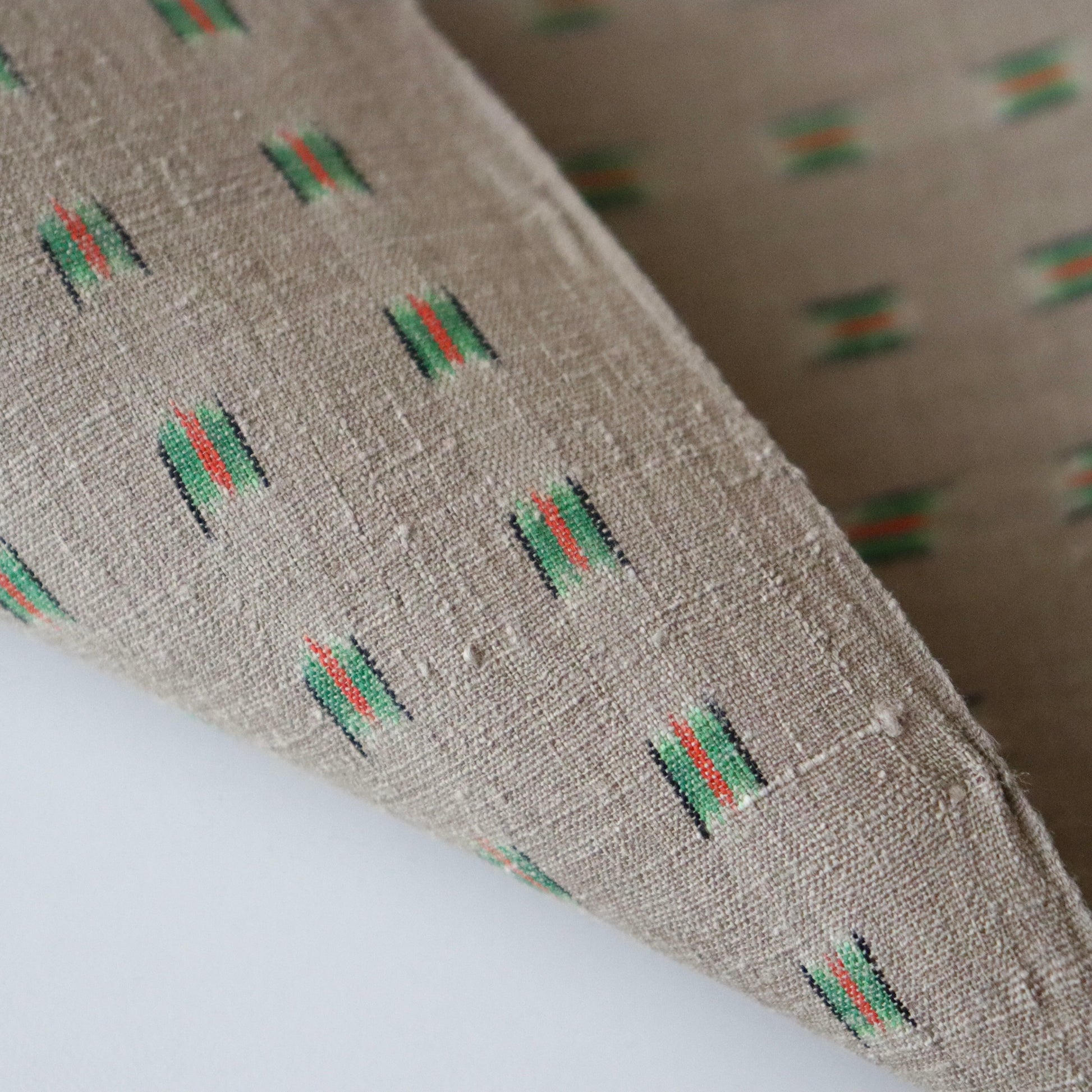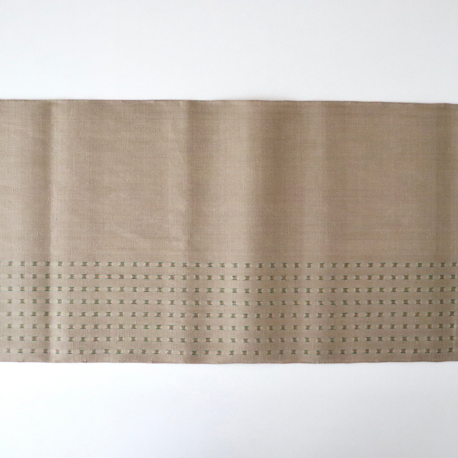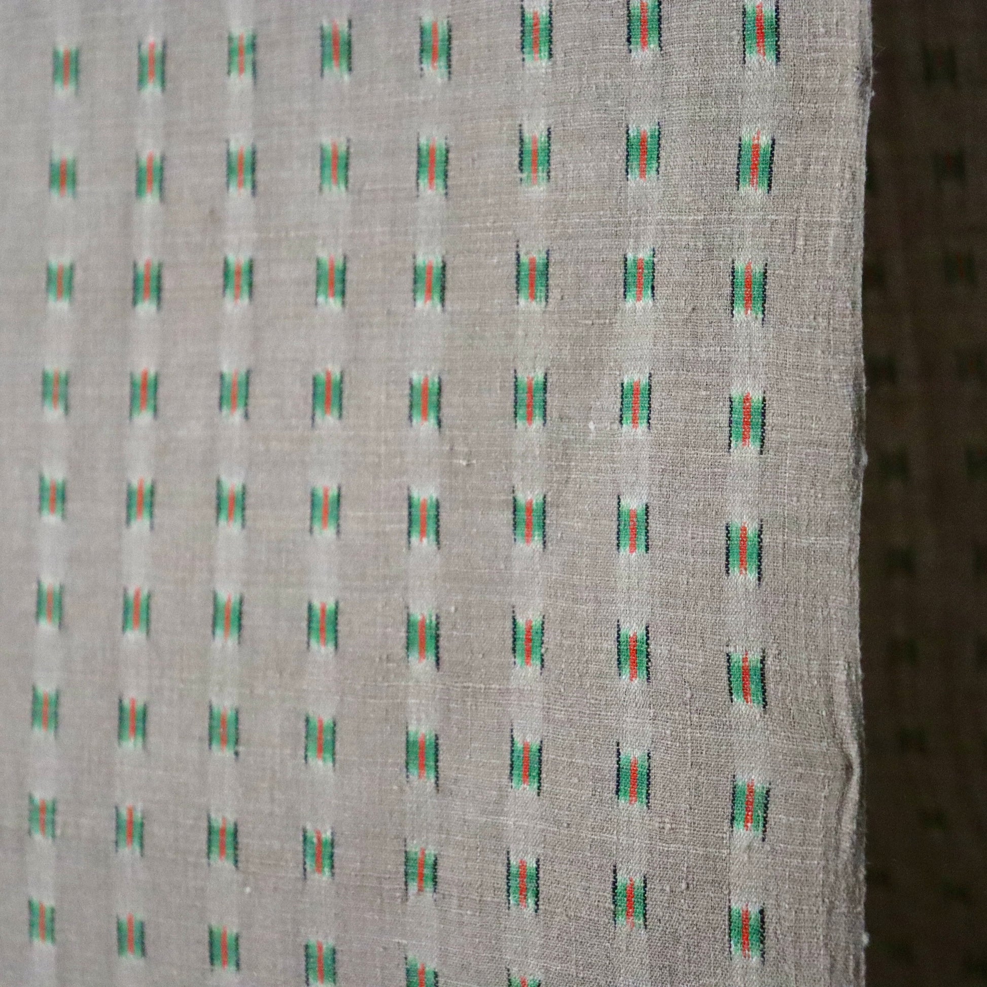 本作は小倉商店が所蔵する大正期〜昭和初期の縮見本裂を元に、当店が復刻を依頼して製作頂いた結城縮です。数ある見本裂の中でふと目に留まった見た事のない絣模様。絣模様には作名も記されておらず、制作元でもある小倉商店さんにも由来詳細が分からないという謎に包まれた結城縮。しかしその美しく洒落た絣模様と色合いに惹かれ復刻再現を依頼しました。品名は大正時代の見本裂にあった絣模様で目を惹く緑は伝統和色でいうところの「花緑青 -はなろくしょう」であることから「大正絣 花緑青」としました。