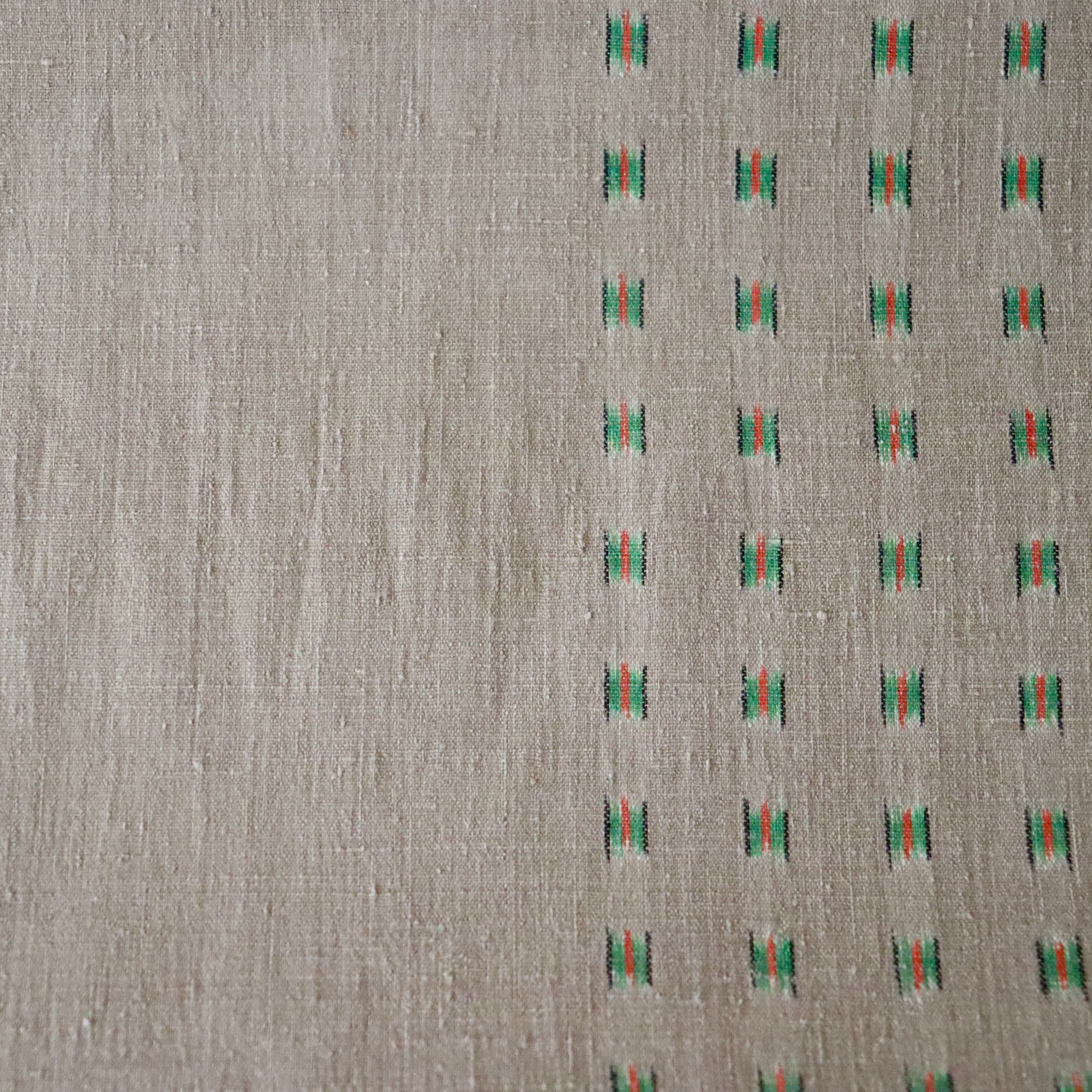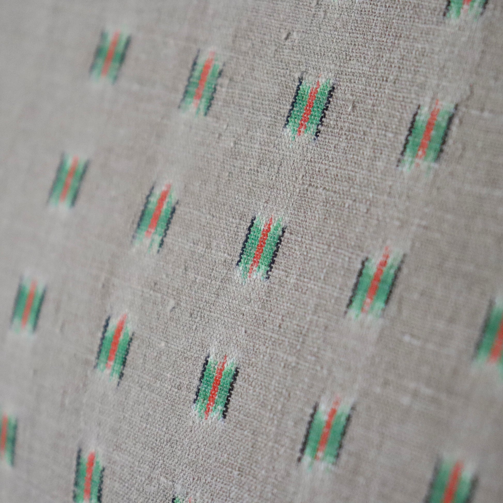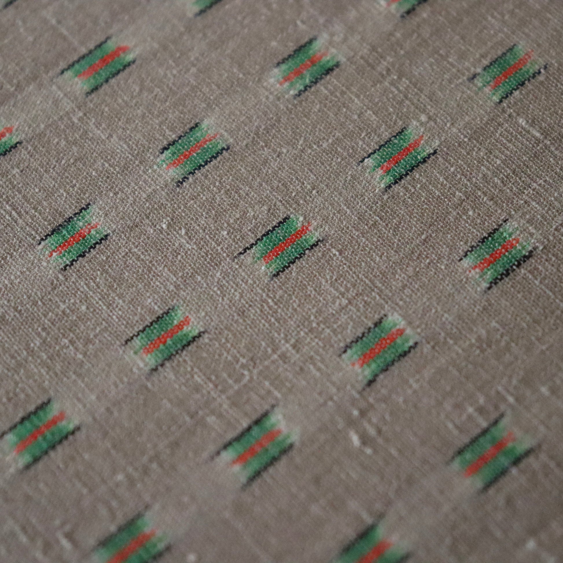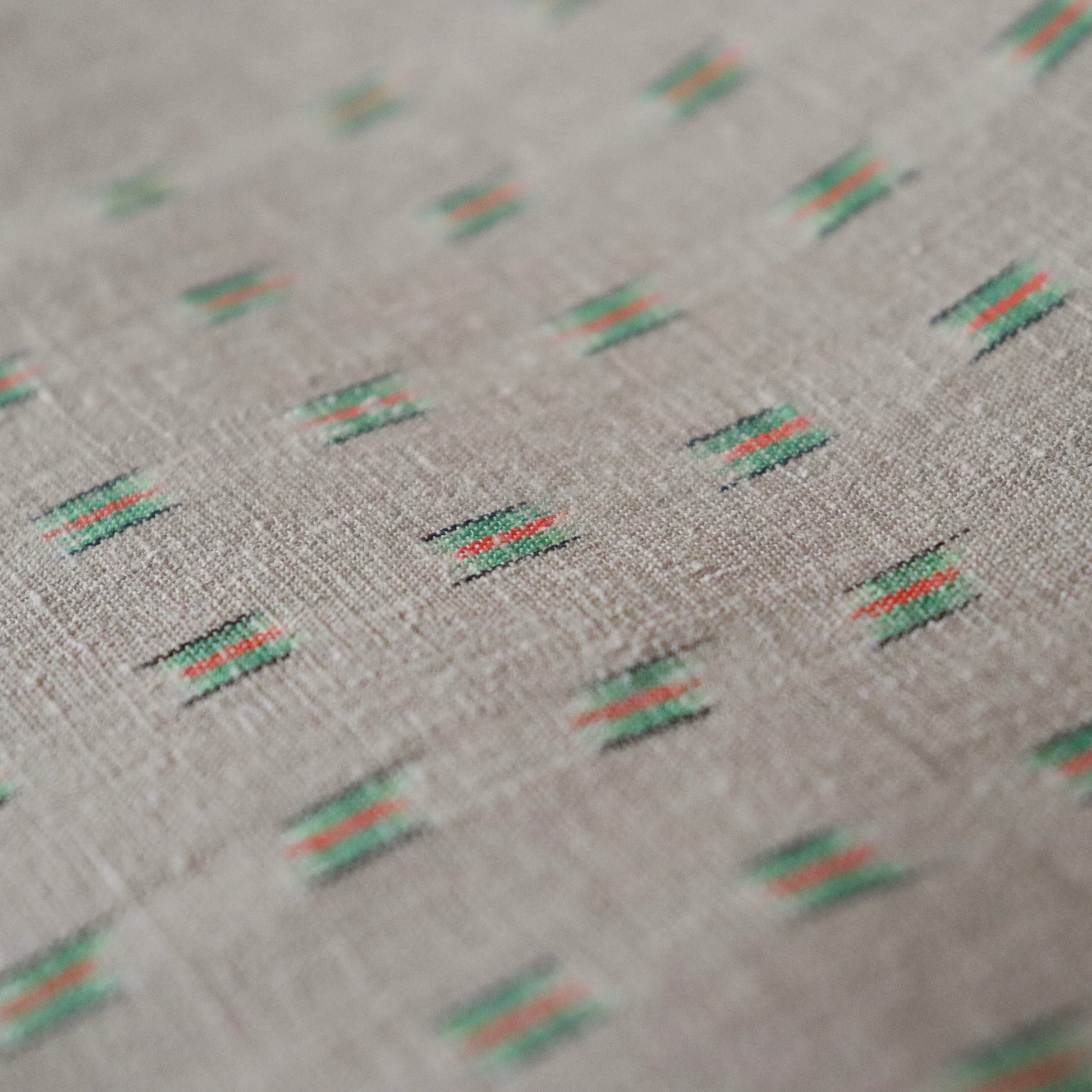 本作は小倉商店が所蔵する大正期〜昭和初期の縮見本裂を元に、当店が復刻を依頼して製作頂いた結城縮です。数ある見本裂の中でふと目に留まった見た事のない絣模様。絣模様には作名も記されておらず、制作元でもある小倉商店さんにも由来詳細が分からないという謎に包まれた結城縮。しかしその美しく洒落た絣模様と色合いに惹かれ復刻再現を依頼しました。品名は大正時代の見本裂にあった絣模様で目を惹く緑は伝統和色でいうところの「花緑青 -はなろくしょう」であることから「大正絣 花緑青」としました。