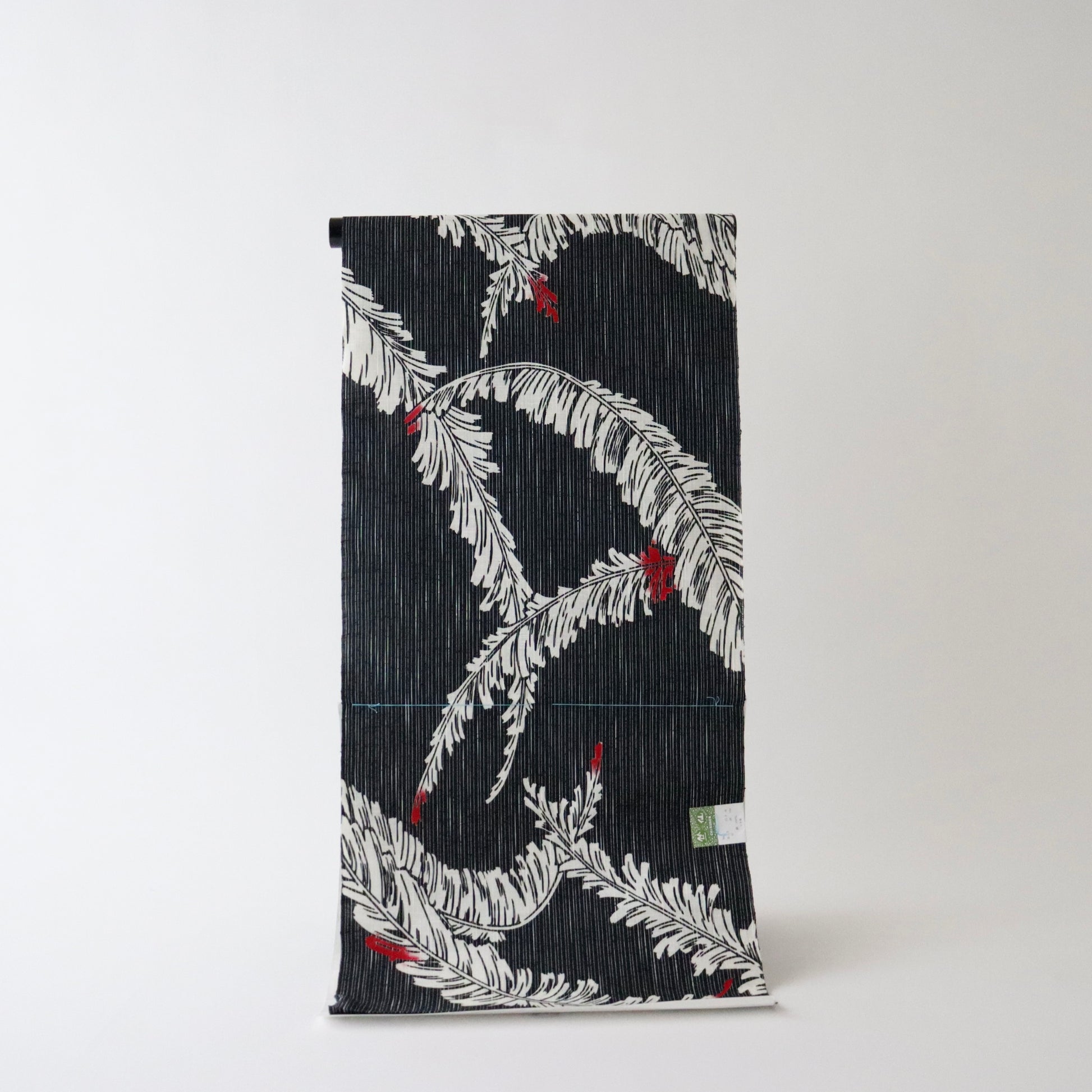経糸に白い紬糸を織り込んだ綿紬地に注染で芭蕉の葉を染め付けた本作。配色は荒井呉服店が指定をした別注品で、随所に挿した赤がポイントです。