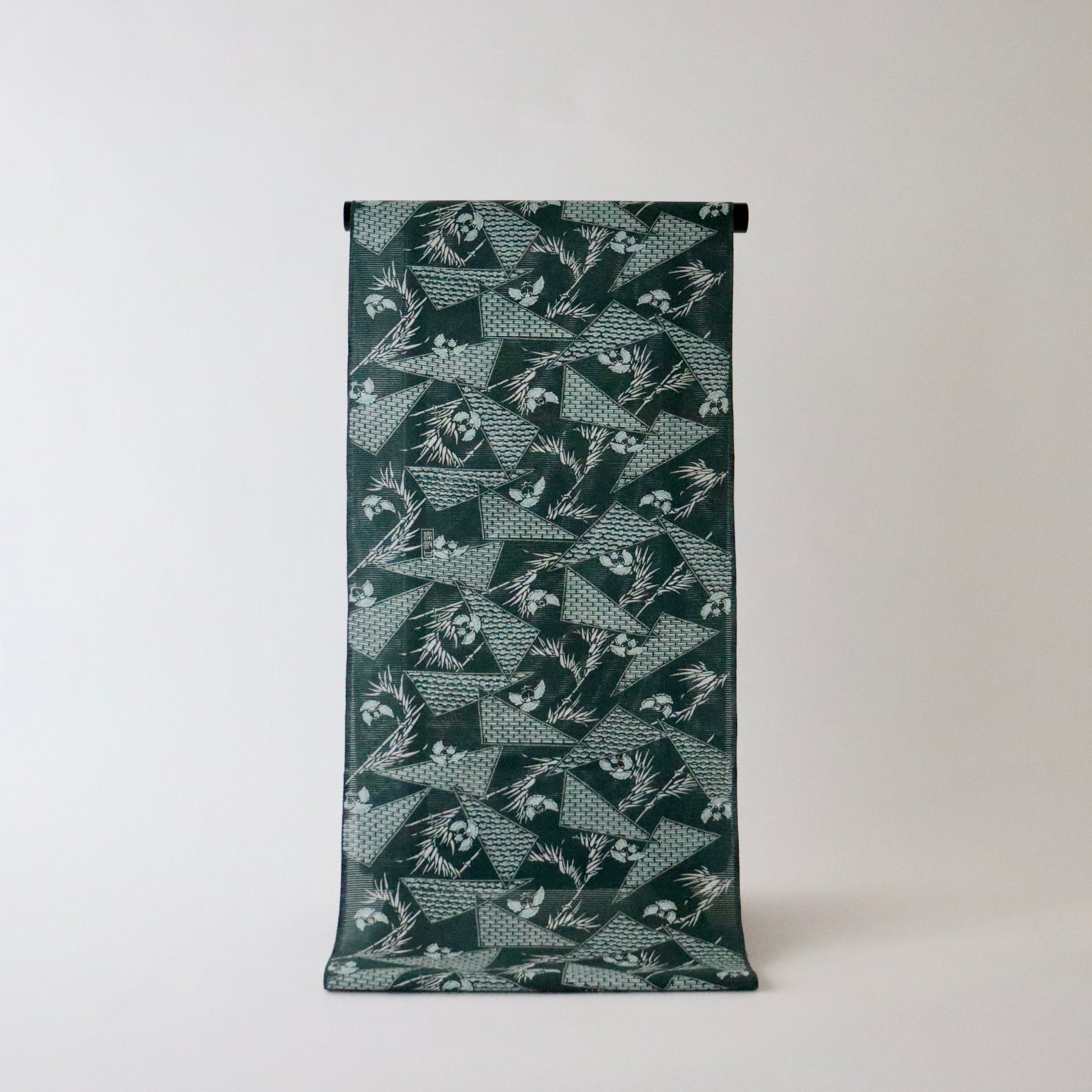 型紙を二枚用いる「二枚白」の染め技法で柄を染め上げた本作。生地色含め三色で表現される立体的な柄付けが美しい仕上がり。本来は着尺や名古屋帯を染める為の型紙を用いている為、所謂「ゆかた」とは異なる趣のある意匠が魅力の一品です。