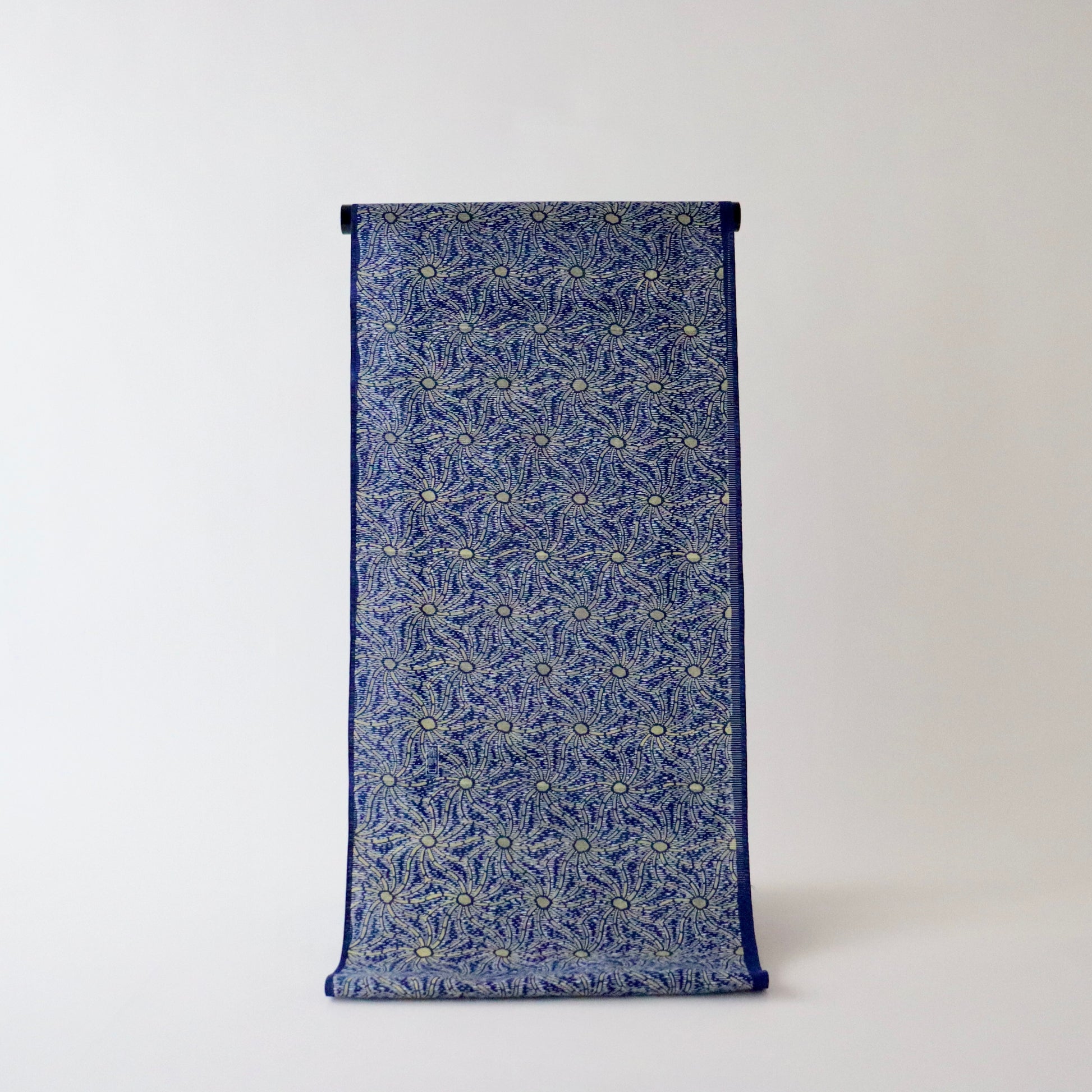 型紙を二枚用いる「二枚白」の染め技法で柄を染め上げた本作。生地色含め三色で表現される立体的な柄付けが美しい仕上がり。本来は着尺や名古屋帯を染める為の型紙を用いている為、所謂「ゆかた」とは異なる趣のある意匠が魅力の一品です。