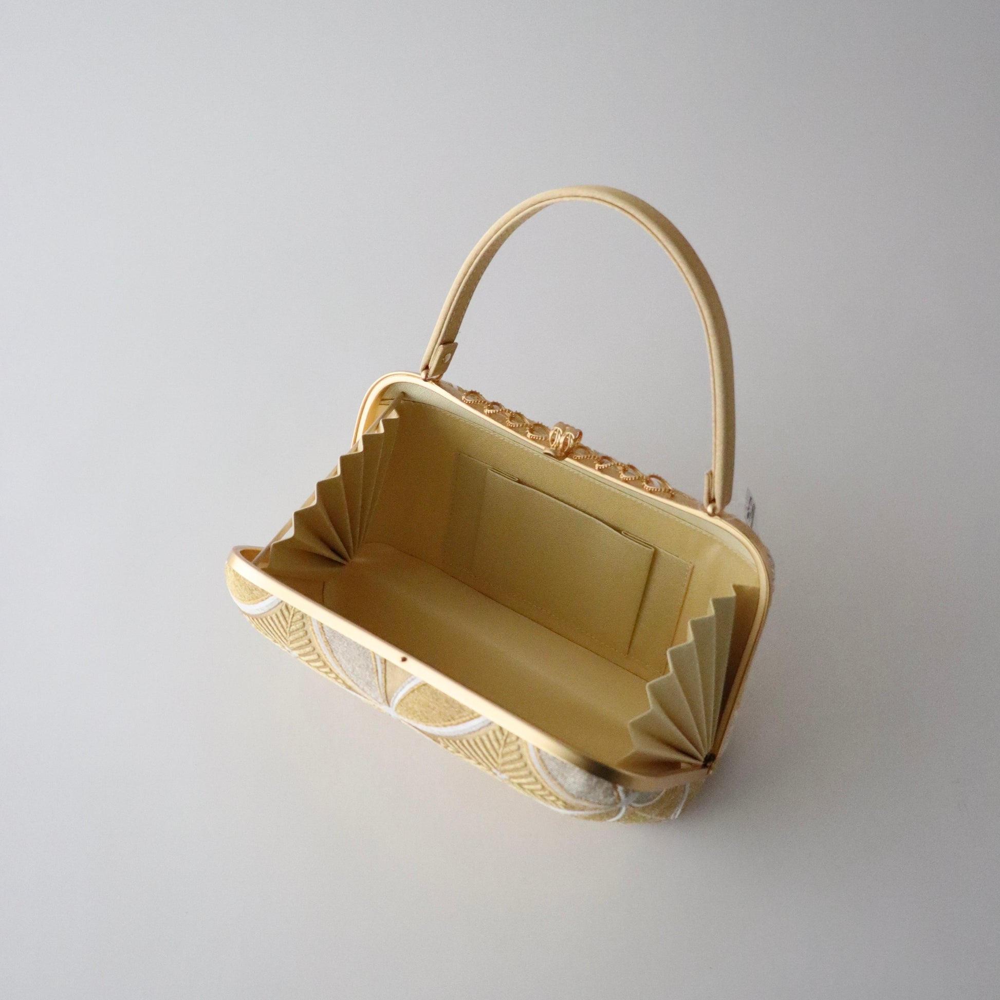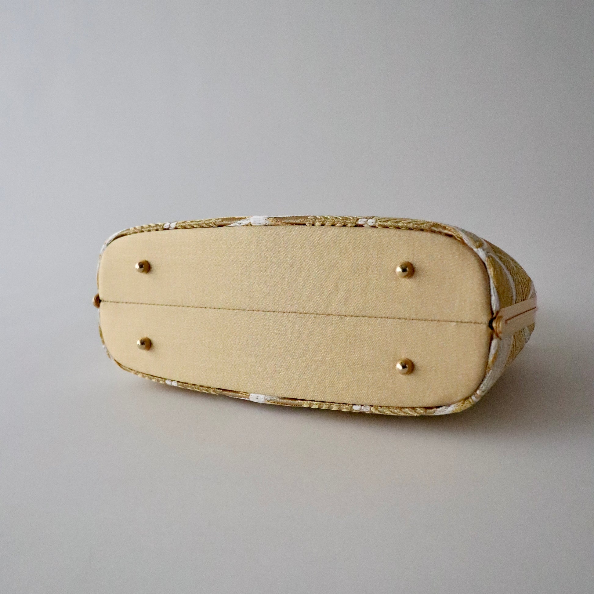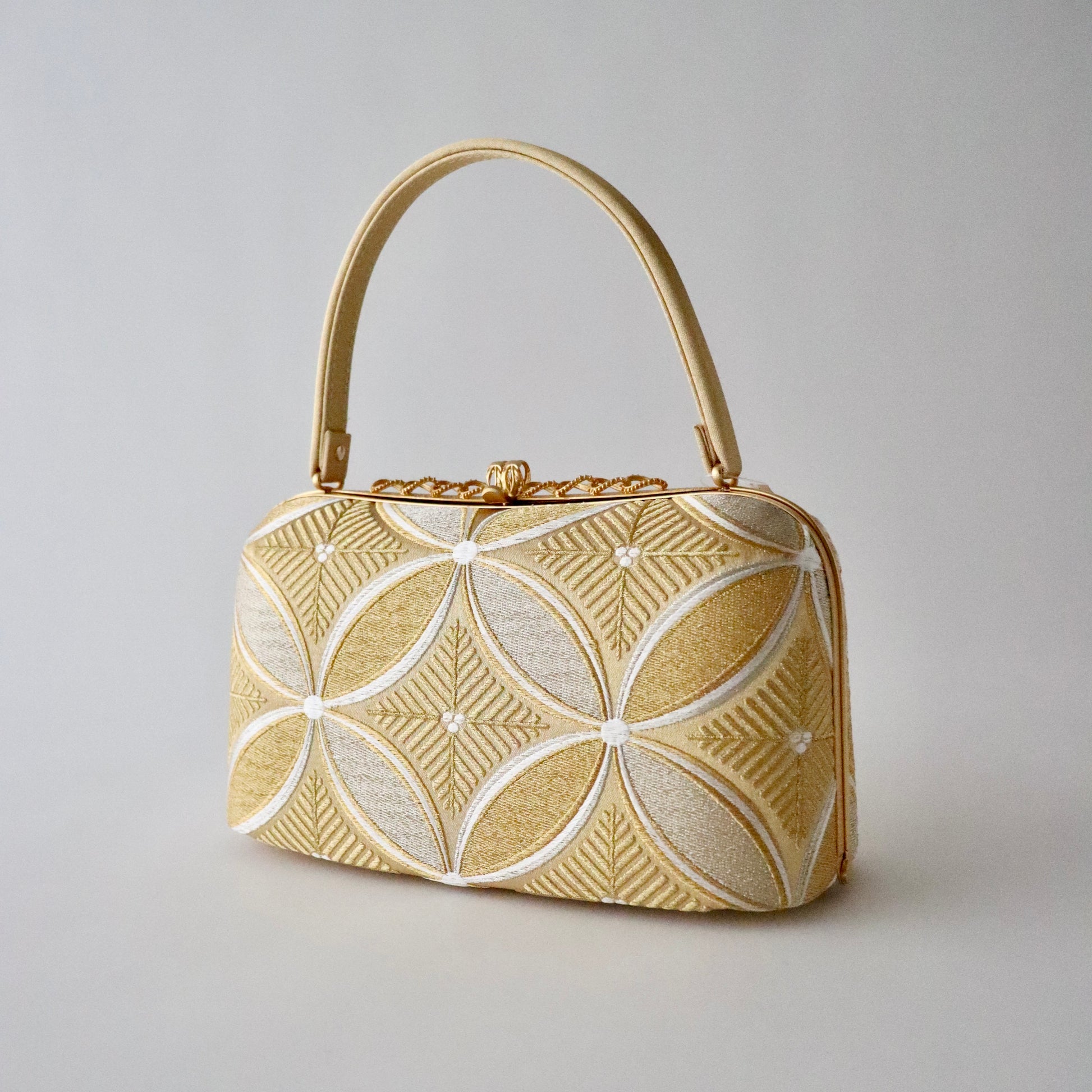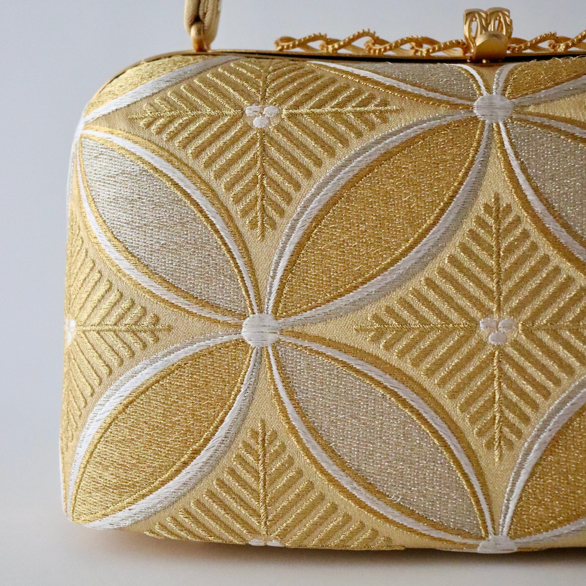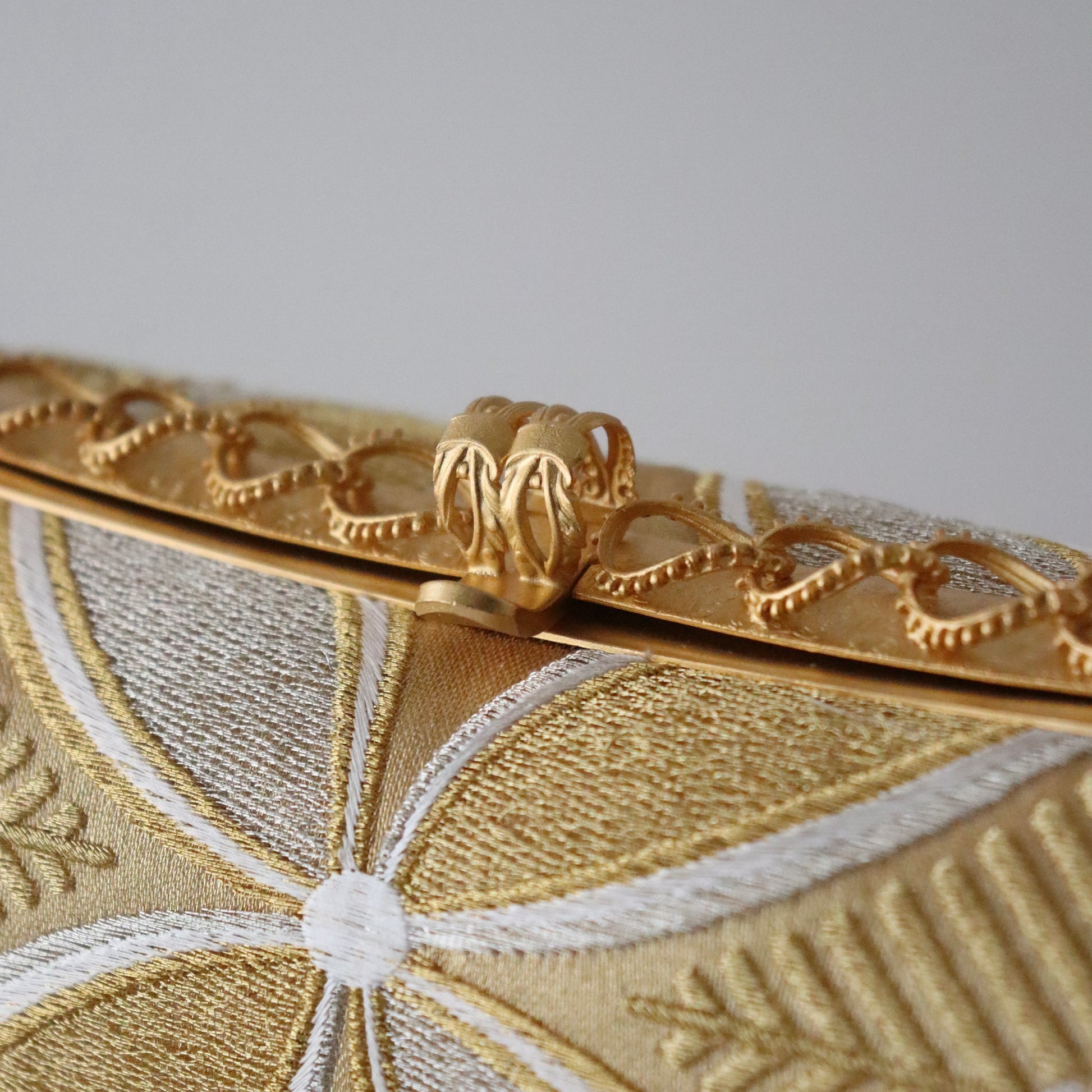 丁寧に織り上げられた金糸銀糸のコントラストが美しい本作。京都西陣で立体的表情に織り上げた「七宝文」の帯地が上品で華やかな仕上がり。真鍮製の留め具の装飾も上品で豪華。慶事の席の装いに相応しいお品物です。