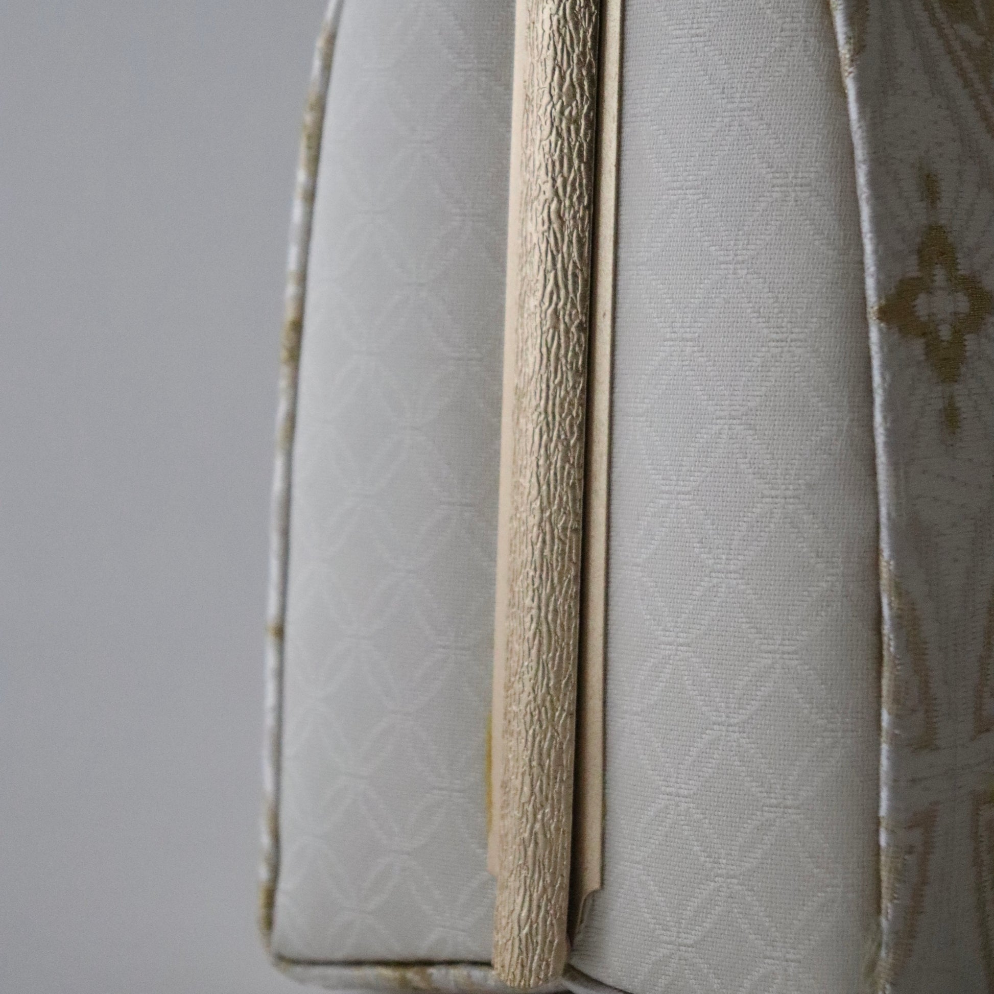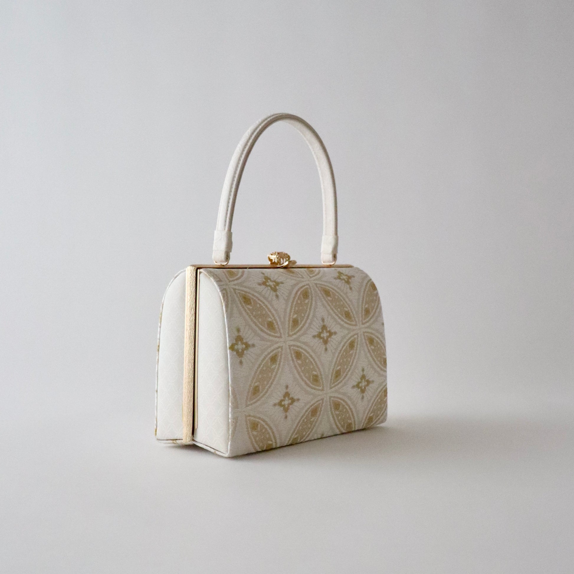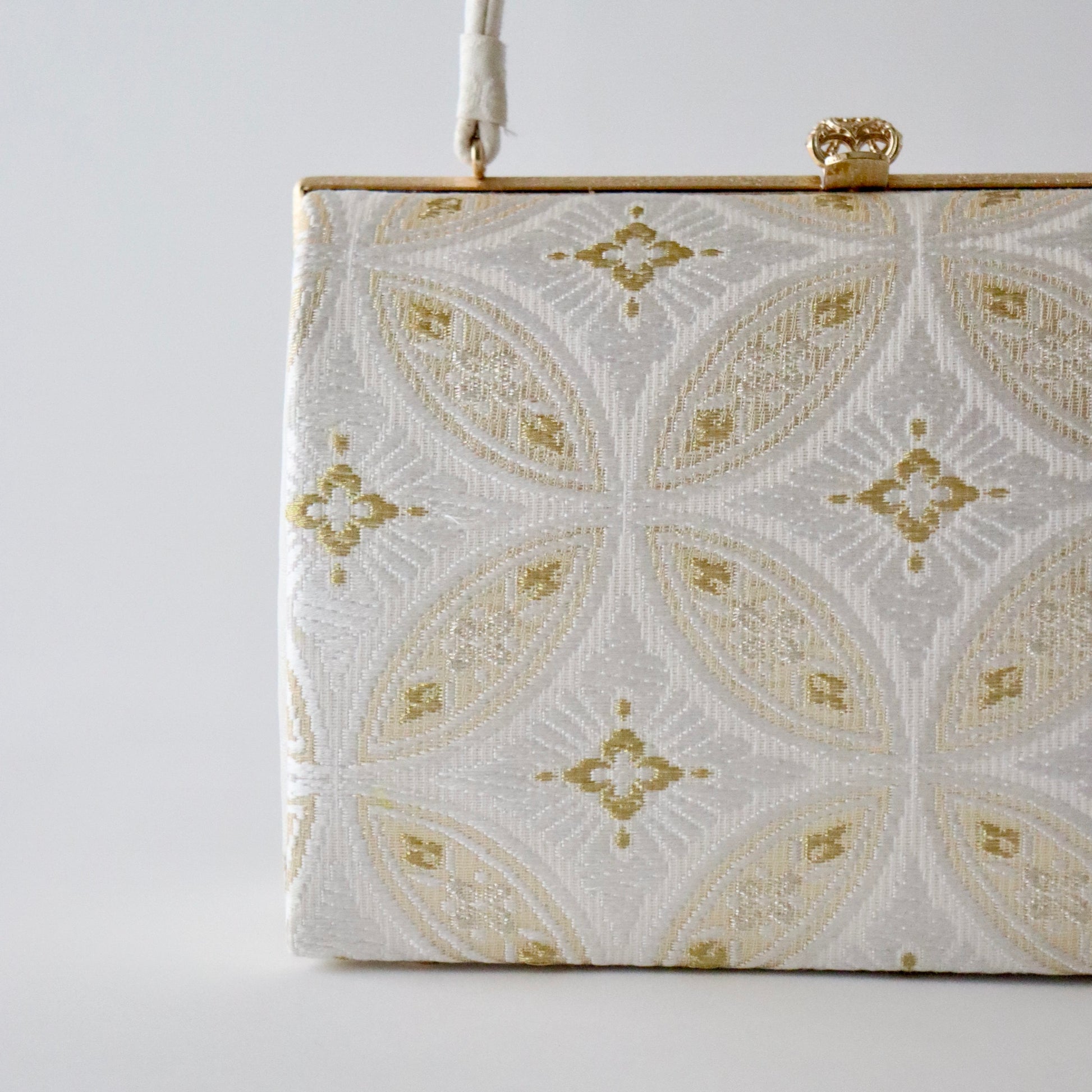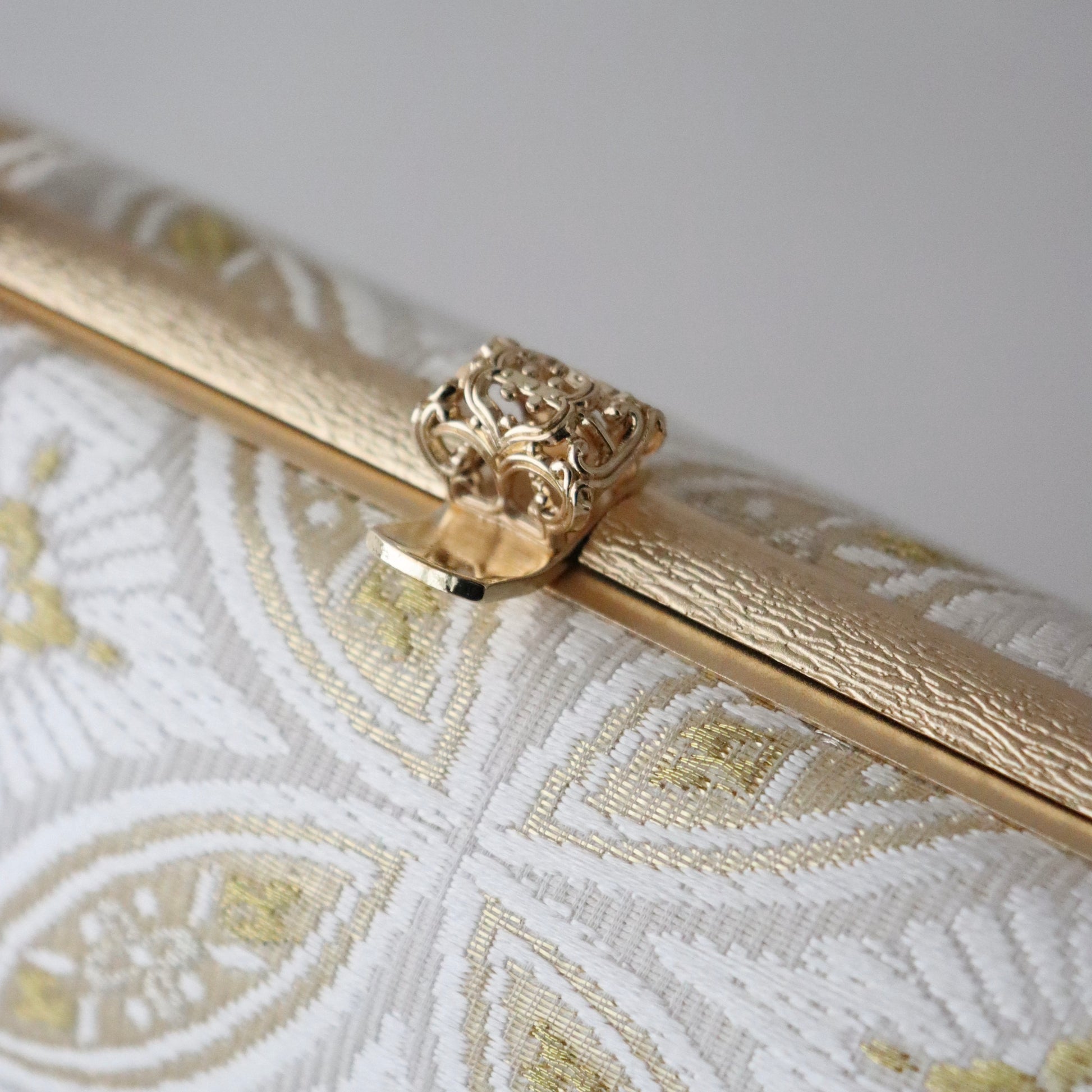 丁寧に織り上げられた金糸銀糸のコントラストが美しい本作。京都西陣で織り上げた帯地が上品で華やかな仕上がり。「七宝」の格調高い意匠が一際目を惹きます。真鍮製の留め具の装飾も上品で豪華。慶事の席の装いに相応しいお品物。